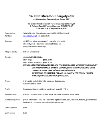 14. EDF Maraton Energetyków 4. Mistrzostwa Pracowników Grupy EDF 16. Grand Prix Energetyków w biegach przełajowych 9. Polsko-Czeski Puchar Biegowy RYBOST CUP 3. Grand Prix Energetyków w NW. Organizator: Kontakt: Sekcja Biegów Długodystansowych ENERGETYK Rybnik [email protected]; tel. 669776757 Dystans: 42,195 km (atest geodezyjny) – agrafka + 14 pętli alternatywnie – dowolna wielokrotność 3 km (Bieg oraz Nordic Walking) Miejsce startu: Rybnik-Grabownia Termin: niedziela 07.08.2016 r., start biegu : godz. 9:00 start Nordic Walking : godz. 9.10 UWAGA: JEŚLI PRZEWIDYWANE BĘDĄ W TYM DNIU BARDZO WYSOKIE TEMPERATURY ORGANIZATOR MOŻE ZMIENIĆ GODZINĘ STARTU (I ODPOWIEDNIO GODZ. OTWARCIA BIURA ZAWODÓW) NA WCZEŚNIEJSZĄ. INFORMACJA TA ZOSTANIE PODANA NA NASZYM FAN PAGE’u FB ORAZ W MIARĘ MOŻLIWOŚCI DROGĄ MAILOWĄ. Trasa: 3-km pętla wokół zbiornika wodnego Grabownia, oznakowana co 1 km Profil: lekko pagórkowaty, różnica wzniesień na pętli - 7,5 m Nawierzchnia: trudna, urozmaicona – ścieżki leśne, żwirowe, trylinka, asfalt, bruk Punkty odżywcze: punkt odżywczy – co 3 km – zawierał będzie: woda, cola, izotonik, banany, pomarańcze, herbatniki, czekolada (zależnie od temperatury) Limit czasowy: brak Limit wieku: brak Pomiar czasu: elektroniczny (TimeSport) • Każdy zawodnik otrzyma zwrotny chip. • za zniszczenie lub zgubienie chipa jest pobierana opłata w wysokości 5 zł • Chip należy zamocować do buta ,prawidłowe zamocowanie chipa gwarantuje zaklasyfikowanie w wynikach Wpisowe: Wpisowe jest przeznaczone na wydatki poniesione na minimalne zabezpieczenie i przygotowanie imprezy biegowej pod względem sportowym. Minimalne wpisowe wynosi: 50 zł przy zgłoszeniu drogą internetową i opłacie dokonanej przelewem w terminie do 31.07.2016 30 zł dzieci i młodzież do 18 lat oraz członkowie SBD przy zgłoszeniu drogą internetową i opłacie dokonanej przelewem do 31.07.2016r 40 zł Członkowie Rybnickiej Grupy Biegowej Pędzimy Razem, oraz Rybnickiego Klubu Nordic Walking – RKNW, przy zgłoszeniu drogą internetową do 29.05.2016 r. 60 zł opłata w dniu zawodów (bez względu wiek, czy przynależność klubową) bezpłatnie - dzieci do 10 lat oraz członkowie klubu SBD biorący udział w organizacji zawodów, pracownicy EDF zgłoszeni w terminie. Płatność: • przelewem na rachunek bankowy Fundacji EDF Polska: 77 1560 0013 2353 6765 9000 0006 Ważne! W tytule wpłaty wpisać: Maraton Energetyków-Imię i Nazwisko By otrzymać fakturę należy dodatkowo w tytule dopisać „faktura” Dane do FV proszę przesłać na adres mailowy organizatora ([email protected]) Faktura będzie do odbioru w dniu zawodów lub przesłana pocztą. • Gotówką w biurze zawodów podczas weryfikacji w dniu biegu Biuro zawodów: w godz. 7.30 – 8.30 Rybnik - Grabownia Termin zgłoszeń: do niedzieli 31.07.20156 r Przez stronę internetową: http://online.datasport.pl/zapisy/portal/zawody.php?zawody=2459 Przyjęcie każdego zgłoszenia zostanie potwierdzone mailem zwrotnym. Po tym terminie zgłoszenia przyjmowane będą jedynie na miejscu w biurze zawodów za naliczeniem podwyższonej opłaty startowej (nie ma limitu ilości startujących zawodników, każdy chętny wystartuje) Nagrody: za miejsca I-IV w kategoriach OPEN mężczyzn i kobiet – bieg - puchary; za miejsca I-IV w kat. Pracowników Grupy EDF mężczyzn i kobiet – bieg - puchary; za miejsca I-IV w kategoriach OPEN mężczyzn i kobiet – NW - puchary; za miejsca I-IV w kat. Pracowników Grupy EDF mężczyzn i kobiet – NW - puchary; dla najmłodszych dzieci paczki dla wszystkich uczestników – medal pamiątkowy punkty do 16. Grand Prix Energetyków w biegach przełajowych, 9. RYBOST CUP oraz do 3. Grand Prix Energetyków w NW koszulka – dla zapisanych droga internetową do 31.07.2016r W przypadku, gdy zapas koszulek nie zostanie wyczerpany dla zapisanych drogą internetową, zostaną one wydane wraz z pakietami startowymi pierwszym zgłoszonym zawodnikom w dniu biegu w biurze zawodów. Dodatkowo przyznany zostanie Puchar Prezessy za najwięcej wybieganych kilometrów w rywalizacji endomondo „ Trenujemy z Energetykiem do 14 Maratonu Energetyków” Zwycięzca (osoba, która wybiega najwięcej kilometrów) otrzyma także darmowy start w naszych zawodach. Dodatkowo wśród uczestników rywalizacji Endomondo zostanie wylosowana jeszcze jedna osoba, która otrzyma prawo darmowego startu. Zostanie również przyznana dodatkowa nagroda w klasyfikacji NW, za najlepszą technikę chodu NW. Regulaminy GPE oraz RYBOST CUP dostępne na naszej stronie internetowej: http://www.sbd-energetyk.pl/zawody2016 Kategorie wiekowe: (K-kobiety, M-mężczyźni): - K,M-0 - (do 9 lat) - 2007 i młodsi - K,M-10 - (10-15 lat) – 2006 -2001 - K,M-16 - (16-19 lat) - 2000-1997 - K,M-20 - (20-29 lat) - 1996-1987 - K,M-30 - (30-39 lat) -1986-1977 - K,M-40 - (40-49 lat) -1976-1967 - K,M-50 - (50-59 lat) - 1966-1957 - K,M-60 - (60-69 lat) - 1956-1947 - K,M-70 - (70 lat i więcej) - 1946 i starsi Przy czym: • Przy zaliczeniu do odpowiedniej kategorii wiekowej przyjmuje się rok urodzenia • Zwycięzcy klasyfikacji Open nie będą uwzględniani w kategoriach wiekowych, • W kategoriach wiekowych zwycięzcom wręczone zostaną oryginalne dyplomy (nie przewiduje się pucharów) • Kategorie wiekowe nie mają wpływu ma zliczanie punktów do rywalizacji GPE oraz RYBOSTU Nordic Walking: W ramach zawodów prowadzona będzie również klasyfikacja Nordic Walking. Impreza zaliczana jest do 3. Grand Prix Energetyków w NW. Na trasie znajdować się będą sędziowie, którzy będą pilnować prawidłowej techniki chodu Nordic Walking, a w szczególności czy dochodzi do załamania zasad fair play zwłaszcza poprzez wszelkie formy podbiegania. Sędziowie mogą użyć upomnienia słownego, przyznać zawodnikowi żółtą kartkę z 3 minutową karą (maksymalnie zawodnik może otrzymać 2 żółte kartki, 3 kartka jest jednoznaczn