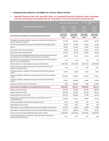 I. 1. CONSOLIDATED FINANCIAL STATEMENT OF CAPITAL GROUP APATOR Selected financial data with essential items of condensed financial statement (also translated into Eur) presenting accumulated data for all quarters of current and previous financial year. w tys. zł/ in thousands of PLN WYSZCZEGÓLNIENIE/ DESCRIPTION Sprawozdanie skonsolidowane/ Consolidated financial statement Przychody ze sprzedaży produktów, towarów i materiałów / Sales revenues of products, goods and materials w tys. eur/ in thousands of EUR bieżący okres/ current period poprzedni okres/ previous period bieżący okres/ current period poprzedni okres/ previous period III kwartały 2014/ III Qs 2014 III kwartały 2013/ III Qs 2013 III kwartały 2014/ III Qs 2014 III kwartały 2013/ III Qs 2013 517 480 503 601 123 790 119 249 Zysk (strata) z działalności operacyjnej / Profit (loss) from operating activity 78 024 67 801 18 665 16 055 EBITDA 94 503 83 363 22 607 19 740 Zysk (strata) brutto / Gross profit (loss) 75 869 65 782 18 149 15 577 Zysk (strata) netto / Net profit (loss) 61 370 52 146 14 681 12 348 Zysk (strata) netto przypadająca akcjonariuszom jednostki dominującej Grupy/ Net profit (loss) for shareholders of parent entity in Grupa Apator 60 694 51 544 14 519 12 205 Zysk (strata) netto przypadająca udziałom niesprawującym kontroli/ Net profit (loss) for non-controlling interest 676 602 162 143 29 507 028 29 507 028 29 507 028 29 507 028 2,06 1,75 0,49 0,41 35 507 16 890 8 504 4 006 (123 038) (16 853) (29 467) (3 997) 95 392 (24 900) 22 846 (5 906) 7 861 (24 863) 1 883 (5 897) 30.09.2014 2013 rok 30.09.2014 2013 rok Aktywa razem/ Total assets 676 212 522 683 161 948 126 032 Aktywa trwałe/ Fixed assets 352 036 262 615 84 310 63 323 Aktywa obrotowe/ Current assets 324 176 260 068 77 638 62 709 Kapitał własny z udziałami niesprawującymi kontroli/ Equity with noncontrolling interest 376 082 325 411 90 069 78 465 Udziały niesprawujące kontroli/ Non-controlling interest 1 832 1 582 439 381 Kapitał akcyjny/ Share capital 3 311 3 311 793 798 Zobowiązania i rezerwy długoterminowe/ Long-term liabilities and provisions 104 419 28 982 25 008 6 988 Zobowiązania i rezerwy krótkoterminowe/ Short-term liabilities and provisions 195 711 168 290 46 871 40 579 29 507 028 29 507 028 29 507 028 29 507 028 12,75 11,03 3,05 2,66 Średnia ważona ilośd akcji/ Weighted average number of shares Zysk (strata) netto na jedną akcję zwykłą *zł/ akcję+/ Net profit (loss) per ordinary share [PLN/ share]: Przepływy pieniężne z działalności operacyjnej/ Cash flows from operating activity Przepływy pieniężne z działalności inwestycyjnej/ Cash flows from investing activity Przepływy pieniężne z działalności finansowej/ Cash flows from financing activity Przepływy pieniężne razem/ Total cash flows Sprawozdanie skonsolidowane/ Consolidated financial statement Średnia ważona ilośd akcji/ Weightedaverage number of shares Wartośd księgowa netto na jedną akcję zwykłą *zł/ akcję+/ Book value per ordninary share [PLN/ share]: 2. Consolidated financial statement of financial position WYSZCZEGÓLNIENIE/ DESCRIPTION na dzieo/ Day 30.09.2014 Aktywa trwałe/ Fixed assets 31.12.2013 352 036 262 615 9 119 6 955 Wartośd firmy jednostek podporządkowanych/ Goodwill of related entities 120 097 63 706 Rzeczowe aktywa trwałe/ Property, plant and equipment 165 759 146 233 Nieruchomości inwestycyjne/ Investment properties 1 721 1 721 Inwestycje w jednostkach stowarzyszonych konsolidowane metodą praw własności/ Investments in associated entities consolidated by equity method 7 253 5 279 Pozostałe długoterminowe aktywa finansowe/ Other long-term financial assets 176 284 - w pozostałych jednostkach/ in other entities 176 284 Udzielone pożyczki długoterminowe/ Long-term borrowings granted 9 584 8 994 - jednostkom powiązanym/ to related entities 9 584 8 994 Należności długoterminowe/ Long -term receivables 15 921 5 719 - od pozostałych jednostek/ from other entities 15 921 5 719 4 9 22 402 23 715 324 176 260 068 Zapasy/ Inventories 116 458 95 359 Należności handlowe/ Trade receivables 137 416 116 106 11 898 5 739 125 518 110 367 Należności z tytułu podatku dochodowego od osób prawnych/ Current tax assets 1 519 1 314 Należności z tytułu innych podatków, ceł i ubezpieczeo społecznych/ Receivables due to other taxes (excluding income tax) and other similar charges 7 584 5 465 Pozostałe należności krótkoterminowe/ Other short-term receivables 26 181 17 171 - od pozostałych jednostek/ from other entities 26 181 17 171 Pozostałe krótkoterminowe aktywa finansowe/ Other short-term financial assets 6 027 4 522 - w pozostałych jednostkach/ in other entities 6 027 4 522 26 100 18 239 2 891 1 636 - 256 676 212 522 683 Wartości niematerialne/ Intangible assets Długoterminowe rozliczenia międzyokresowe/ Long-term prepayments Aktywa z tytułu odroczonego podatku dochodowego/ Deferred tax assets Aktywa obrotowe/ Current assets - od jednostek powiązanych/ from related entities - od pozostałych jednostek/ from other entities Środki pieniężne i ich ekwiwalenty/ Cash and cash equivalents Krótkoterminowe rozliczenia międzyokresowe/ Short-term prepayments Aktywa trwałe zaklasyfikowane jako przeznaczone do sprzedaży/ Fixed assets classified as held for sale AKTYWA RAZEM/ TOTAL ASSETS WYSZCZEGÓLNIENIE/ DESCRIPTION na dzieo/ Day 30.09.2014 31.12.2013 Kapitał własny/ Equity 376 082 325 411 Kapitał własny przypadający akcjonariuszom jednostki dominującej/ Equity for shareholders of parent entity 374 250 323 829 3 311 3 311 272 199 222 837 Kapitał z przeszacowania programu określonych świadczeo/ Reserve of remeasurements of defined benefit plans 355 355 Kapitał z wyceny transakcji zabezpieczających oraz różnice kursowe z konsolidacji/ Capital evaluation of hedging transactions and exchange differences from consolidation (106) 623 Niepodzielony wynik finansowy/ Undistributed financial
