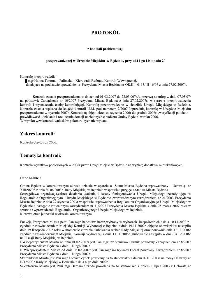 PROTOKÓŁ z kontroli problemowej przeprowadzonej w Urzędzie Miejskim w Będzinie, przy ul.11-go Listopada 20 Kontrolę przeprowadziła: – mgr Halina Taratuta - Palimąka - Kierownik Referatu Kontroli Wewnętrznej, działająca na podstawie upoważnienia Prezydenta Miasta Będzina nr OR.III . 0113/III-16/07 z dnia 27.02.2007r. Kontrola została przeprowadzona w dniach od 01.03.2007 do 22.03.007r./z przerwą na urlop w dniu 07.03.07/ na podstawie Zarządzenia nr 10/2007 Prezydenta Miasta Będzina z dnia 27.02.2007r. w sprawie przeprowadzenia kontroli i wyznaczenia osoby kontrolującej. Kontrolę przeprowadzono w siedzibie Urzędu Miejskiego w Będzinie. Kontrola została wpisana do książki kontroli U.M. pod numerem 2/2007.Poprzednią kontrolę w Urzędzie Miejskim przeprowadzono w styczniu 2007r .Kontrolą tą objęto okres od stycznia 2006r do grudnia 2006r. ,weryfikacji poddano prawidłowość udzielania i rozliczania dotacji udzielonych z budżetu Gminy Będzin w roku 2006. W wyniku w/w kontroli wniosków pokontrolnych nie wydano. Zakres kontroli: Kontrolą objęto rok 2006. Tematyka kontroli: Kontrola wydatków poniesionych w 2006r przez Urząd Miejski w Będzinie na wypłatę dodatków mieszkaniowych. Dane ogólne : Gmina Będzin w kontrolowanym okresie działała w oparciu o Statut Miasta Będzina wprowadzony Uchwałą nr XIII/96/03 z dnia 30.06.2003r Rady Miejskiej w Będzinie w sprawie : przyjęcia Statutu Miasta Będzina. Szczegółowa organizacja,zakres działania ,zadania i zasady funkcjonowania Urzędu Miejskiego zostały ujęte w Regulaminie Organizacyjnym Urzędu Miejskiego w Będzinie ,wprowadzonym zarządzeniem nr 21/2003 Prezydenta Miasta Będzina z dnia 29 stycznia 2003r w sprawie :wprowadzenia Regulaminu Organizacyjnego Urzędu Miejskiego w Będzinie a następnie zmienionym zarządzeniem nr 11/2007 Prezydenta Miasta Będzina z dnia 05 marca 2007 roku w sprawie : wprowadzenia Regulaminu Organizacyjnego Urzędu Miejskiego w Będzinie. Kierownictwo jednostki w okresie kontrolowanym : Funkcję Prezydenta Miasta pełni Pan mgr Radosław Baran,wybrany w wyborach bezpośrednich : dnia 10.11.2002 r , zgodnie z zaświadczeniem Miejskiej Komisji Wyborczej z Będzina z dnia 19.11.2002r.,objęcie obowiązków nastąpiło dnia 19 listopada 2002 roku w momencie złożenia ślubowania wobec Rady Miejskiej oraz ponownie dnia 12.11.2006r zgodnie z zaświadczeniem Miejskiej Komisji Wyborczej z dnia 13.11.2006r ,ślubowanie nastąpiło w dniu 04.12.2006r na II sesji Rady Miejskiej w Będzinie. I Wiceprezydentem Miasta od dnia 01.02.2007r jest Pan mgr inż.Stanisław Surmik powołany Zarządzeniem nr 8/2007 Prezydenta Miasta Będzina z dnia 1 lutego 2007r. II Wiceprezydentem Miasta od dnia 05.02.2007r jest Pan mgr inż.Ryszard Fornal powołany Zarządzeniem nr 8/2007 Prezydenta Miasta Będzina z dnia 1 lutego 2007r. Skarbnikiem Miasta jest Pan mgr Tomasz Zydek powołany na to stanowisko z dniem 02.01.2003r na mocy Uchwały nr II/12/2002 Rady Miejskiej w Bedzinie z dnia 4 grudnia 2002r. Sekretarzem Miasta jest Pani mgr Barbara Szkoda powołana na to stanowisko z dniem 1 lipca 2003 r Uchwałą nr 1 XIII/125/2003 Rady Miejskiej w Będzinie z dnia 30.06.2003r Urząd Miejski w Będzinie jest jednostką budżetową . Wewnętrzne uregulowania zagadnień finansowych : -zasady polityki rachunkowości Urzędu Miejskiego w Będzinie wprowadzone zarządzeniem nr 237/2006 Prezydenta Miasta Będzina z dnia 31.10.2006r Ustalenia kontroli : Kontrolę tą przeprowadzono w oparciu o : -Ustawę z dnia 21 czerwca 2001r o dodatkach mieszkaniowych /Dz.U.nr 71 poz.734 z póżn.zm./ -Rozporządzenie Rady Ministrów z dnia 28 grudnia 2001r w sprawie dodatków mieszkaniowych /Dz.U.nr 156 poz.1817 z póżn.zm./. -Rozporządzenie Ministra Inrfastruktury z dnia 27.12.2001r w sprawie sposobu przeprowadzania wywiadu środowiskowego ,wzoru kwestionariusza wywiadu oraz oświadczenia o stanie majątkowym wnioskodawcy i innych członków gospodarstwa domowego ,a także wzoru legitymacji pracownika upoważnionego do przeprowadzenia wywiadu/Dz.U.nr 156 poz.1828/. -Uchwałę Rady Miejskiej w Będzinie nr XLIX/548/2005 z dnia 29 grudnia 2005r w sprawie budżetu miasta Będzina na 2006rok. -Uchwałę nr XXI/285/2000 Rady Miejskiej w Będzinie z dnia 17.04.2000r w sprawie określenia stawek czynszu regulowanego za lokale mieszkalne . - Uchwałę nr XXVI/377/2000 Rady Miejskiej w Będzinie z dnia 25 września 2000r w sprawie uchylenia części Uchwały nr XXI/285/2000 Rady Miejskiej w Będzinie z dnia 17 kwietnia 2000r w sprawie określenia stawek czynszu regulowanego za lokale mieszkalne. -wnioski osób ubiegających się o przyznanie dodatku mieszkaniowego -deklaracje o wysokości dochodów gospodarstwa domowego oraz dowody potwierdzające dochody gospodarstwa domowego -kwestionariusze wywiadu środowiskowego u wnioskodawcy -oświadczenia o stanie majątkowym -decyzje administracyjne w sprawie dodatku mieszkaniowego -zawiadomienia zarządców budynków w przypadku wystąpienia zaległości w dopłacie do czynszu powstałej w trakcie pobierania dodatku mieszkaniowego lub o dokonaniu uregulowania zaległości -wykazy imienne osób uprawnionych do otrzymania dodatku mieszkaniowego z wyszczególnieniem kwoty dodatku przysługującego -przelewy dodatków mieszkaniowych Wydatki na wypłatę dodatków mieszkaniowych zaklasyfikowano w dziale 852-pomoc społeczna rozdział 85215 -dodatki mieszkaniowe , & 3110 -świadczenia społeczne. Plan wydatków po zmianach na rok 2006 na wypłatę dodatków mieszkaniowych łącznie z opłatami pocztowymi wynosił 2.971.000,00zł ,wykonanie ukształtowało się na poziomie 2.958.816,00zł tj 99,6% planu. W celu skontrolowania prawidłowości wydatków na dodatki mieszkaniowe weryfikacji poddano dokumenty złożone w 2006r przez 30 losowo wybranych wnioskodawców ubiegających się o przyznanie dodatku mieszkaniowego i stwierdzono : Osoby ubiegające się o przyznanie dodatku mieszkaniowego zło
