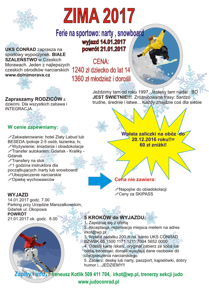 ZIMA 2017 Ferie na sportowo: narty , snowboard UKS CONRAD zaprasza na sportowy wypoczynek. BIAŁE SZALEŃSTWO w Czeskich Morawach. Jeden z najlepszych czeskich ośrodków narciarskich www.dolnimorava.cz Zapraszamy RODZICÓW z dziećmi. Dla wszystkich zabawa i INTEGRACJA. wyjazd 14.01.2017 powrót 21.01.2017 CENA: 1240 zł dziecko do lat 14 1360 zł młodzież i dorośli Jeździmy tam od roku 1997. Jesteśy tam nadal...BO JEST ŚWIETNIE!!!. Zróżnicowane trasy: bardzo trudne, średnie i łatwe... Każdy znajdzie coś dla siebie W cenie zapewniamy: Wpłata zaliczki na obóz do ! Zakwaterowanie: hotel Zlaty Labud lub 20.12.2016 roku!!= BESEDA /pokoje 2-5 osób, łazienka, tv, 60 zł zniżki! ! Wyżywienie: śniadania i obiadokolacje ! Transfer autokarem: Gdańsk - Kraliky Gdansk ! Transfery na stok ! 1 godzina instruktora dla początkujących /narty lub snowboard/ ! Ubezpieczenie narciarskie ! Opiekę wychowawców Cena nie zawiera: ! Napojów do obiadokolacji ! Ceny za SKIPASS WYJAZD 14.01.2017 godz. 7.00 Parking przy Urzędzie Marszałkowskim, Gdańsk ul..Okopowa POWRÓT 5 KROKÓW do WYJAZDU: 21.01.2017 ok. godz. 6.00 1. Zapoznaj się z ofertą 2. Akceptacja, rezerwacja miejsca meilem na adres [email protected] 3. Wpłata zadatku 200 zł na konto UKS CONRAD BZWBK 65 1500 1171 1211 7004 5652 0000 4. Odeślij kartę /skan/, oryginał zabierz ze sobą lub oddaj trenerowi, dorośli wysyłają dane osobowe do ubezpieczenia narciarskiego. 5. Zabierz: deskę lub narty, paszport, kąpielówki, dobry humor i...JEDZIEMY!! : Zapisy i info Ireneusz Kotlik 509 411 704, [email protected], trenerzy sekcji judo www.judoconrad.pl