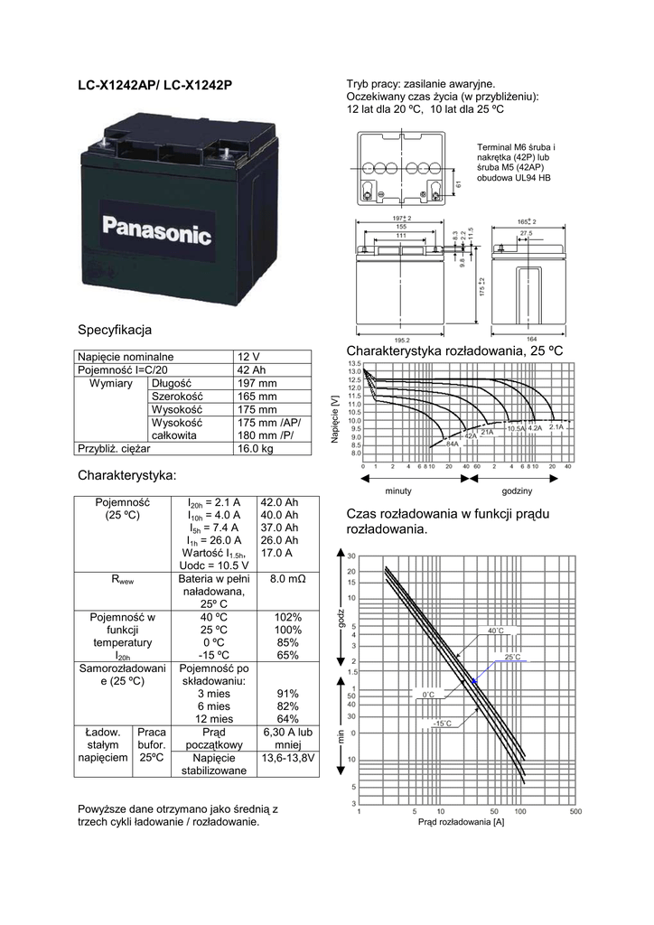 Tryb pracy: zasilanie awaryjne. Oczekiwany czas Ŝycia (w przybliŜeniu): 12 lat dla 20 ºC, 10 lat dla 25 ºC LC-X1242AP/ LC-X1242P Terminal M6 śruba i nakrętka (42P) lub śruba M5 (42AP) obudowa UL94 HB Specyfikacja 12 V 42 Ah 197 mm 165 mm 175 mm 175 mm /AP/ 180 mm /P/ 16.0 kg Charakterystyka rozładowania, 25 ºC Napięcie [V] Napięcie nominalne Pojemność I=C/20 Wymiary Długość Szerokość Wysokość Wysokość całkowita PrzybliŜ. cięŜar Charakterystyka: minuty Pojemność w funkcji temperatury I20h Samorozładowani e (25 ºC) Ładow. Praca stałym bufor. napięciem 25ºC 42.0 Ah 40.0 Ah 37.0 Ah 26.0 Ah 17.0 A godziny Czas rozładowania w funkcji prądu rozładowania. 8.0 mΩ 102% 100% 85% 65% 91% 82% 64% 6,30 A lub mniej 13,6-13,8V PowyŜsze dane otrzymano jako średnią z trzech cykli ładowanie / rozładowanie. godz Rwew I20h = 2.1 A I10h = 4.0 A I5h = 7.4 A I1h = 26.0 A Wartość I1.5h, Uodc = 10.5 V Bateria w pełni naładowana, 25º C 40 ºC 25 ºC 0 ºC -15 ºC Pojemność po składowaniu: 3 mies 6 mies 12 mies Prąd początkowy Napięcie stabilizowane min Pojemność (25 ºC) Prąd rozładowania [A]