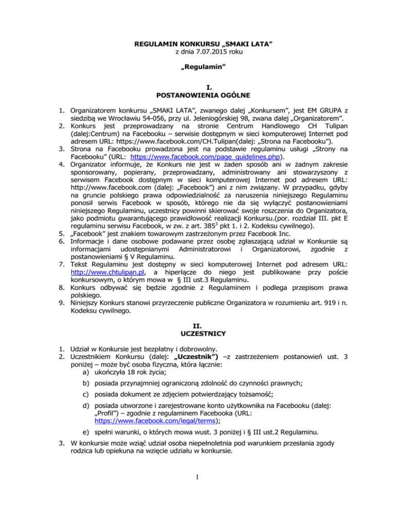 REGULAMIN KONKURSU „SMAKI LATA” z dnia 7.07.2015 roku „Regulamin” I. POSTANOWIENIA OGÓLNE 1. Organizatorem konkursu „SMAKI LATA”, zwanego dalej „Konkursem”, jest EM GRUPA z siedzibą we Wrocławiu 54-056, przy ul. Jeleniogórskiej 98, zwana dalej „Organizatorem”. 2. Konkurs jest przeprowadzany na stronie Centrum Handlowego CH Tulipan (dalej:Centrum) na Facebooku – serwisie dostępnym w sieci komputerowej Internet pod adresem URL: https://www.facebook.com/CH.Tulipan(dalej: „Strona na Facebooku”). 3. Strona na Facebooku prowadzona jest na podstawie regulaminu usługi „Strony na Facebooku” (URL: https://www.facebook.com/page_guidelines.php). 4. Organizator informuje, że Konkurs nie jest w żaden sposób ani w żadnym zakresie sponsorowany, popierany, przeprowadzany, administrowany ani stowarzyszony z serwisem Facebook dostępnym w sieci komputerowej Internet pod adresem URL: http://www.facebook.com (dalej: „Facebook”) ani z nim związany. W przypadku, gdyby na gruncie polskiego prawa odpowiedzialność za naruszenia niniejszego Regulaminu ponosił serwis Facebook w sposób, którego nie da się wyłączyć postanowieniami niniejszego Regulaminu, uczestnicy powinni skierować swoje roszczenia do Organizatora, jako podmiotu gwarantującego prawidłowość realizacji Konkursu.(por. rozdział III. pkt E regulaminu serwisu Facebook, w zw. z art. 3853 pkt 1. i 2. Kodeksu cywilnego). 5. „Facebook” jest znakiem towarowym zastrzeżonym przez Facebook Inc. 6. Informacje i dane osobowe podawane przez osobę zgłaszającą udział w Konkursie są informacjami udostępnianymi Administratorowi i Organizatorowi, zgodnie z postanowieniami § V Regulaminu. 7. Tekst Regulaminu jest dostępny w sieci komputerowej Internet pod adresem URL: http://www.chtulipan.pl, a hiperłącze do niego jest publikowane przy poście konkursowym, o którym mowa w § III ust.3 Regulaminu. 8. Konkurs odbywać się będzie zgodnie z Regulaminem i podlega przepisom prawa polskiego. 9. Niniejszy Konkurs stanowi przyrzeczenie publiczne Organizatora w rozumieniu art. 919 i n. Kodeksu cywilnego. II. UCZESTNICY 1. Udział w Konkursie jest bezpłatny i dobrowolny. 2. Uczestnikiem Konkursu (dalej: „Uczestnik”) –z zastrzeżeniem postanowień ust. 3 poniżej – może być osoba fizyczna, która łącznie: a) ukończyła 18 rok życia; b) posiada przynajmniej ograniczoną zdolność do czynności prawnych; c) posiada dokument ze zdjęciem potwierdzający tożsamość; d) posiada utworzone i zarejestrowane konto użytkownika na Facebooku (dalej: „Profil”) – zgodnie z regulaminem Facebooka (URL: https://www.facebook.com/legal/terms); e) spełni warunki, o których mowa wust. 3 poniżej i § III ust.2 Regulaminu. 3. W konkursie może wziąć udział osoba niepełnoletnia pod warunkiem przesłania zgody rodzica lub opiekuna na wzięcie udziału w konkursie. 1 4. W Konkursie nie mogą brać udziału pracownicy (bez względu na formę zatrudnienia), współpracownicy lub przedstawiciele: Organizatora, Administratora, zarządcy Apsys Polska S.A. z siedzibą w Warszawie, lokali handlowych lub usługowych na terenie Centrum, ani członkowie ich rodzin. Przez członków rodziny rozumie się na potrzeby Konkursu: wstępnych, zstępnych, rodzeństwo, małżonków, rodziców współmałżonka oraz osoby pozostające w stosunku przysposobienia. III. CZAS I WARUNKI KONKURSU 1. Konkurs rozpoczyna się w dniu 7.07.2015 roku o godzinie 12:00 i trwa do dnia 13.07.2015 roku do godziny 23:59, przez co rozumie się moment, do którego Uczestnicy mają prawo zgłaszać Odpowiedź w Konkursową określoną w ust. 4 poniżej. 2. Warunkami uczestnictwa w Konkursie są łącznie: a) wykonanie zadania konkursowego, o którym mowa w ust.4 poniżej; b) zapoznanie się z treścią Regulaminu przed przystąpieniem do Konkursu; c) udzielenie zgód i przesłanie Organizatorowi informacji, oświadczeń i danych – zgodnie z postanowieniami ust. 6, 7, 8 poniżej oraz § IV ust. 8. 3. Organizator publikuje na Fanpage’u zadanie konkursowe przy użyciu funkcjonalności „Status” udostępnianej przez Facebook tzw. post (dalej: „Pytanie Konkursowe”). Pytanie Konkursowe zostanie opublikowane w dniu 7.07.2015r o godz.12:00 W treści Pytania Konkursowego Organizator publikuje również hiperłącze do adresu URL niniejszego Regulaminu (§ I ust. 7 Regulaminu). 4. Zadanie konkursowe polega na opublikowaniu komentarza (postu) do Pytania Konkursowego zawierającego odpowiedź na to Pytanie Konkursowe – przy pomocy funkcjonalności „Dodaj komentarz” („Napisz komentarz”) udostępnianej przez Facebook (dalej: „Odpowiedź Konkursowa”). Odpowiedź Konkursowa powinna być opublikowana przez Uczestnika do godz. 23:59 w dniu 13.07.2015 roku. Odpowiedź Konkursowa może mieć formę: słowną, graficzną lub słowno-graficzną – odpowiednio do Pytania Konkursowego oraz zgodnie z funkcjonalnościami udostępnianymi przez Facebook. 5. Uczestnik może opublikować dowolną ilość Odpowiedzi Konkursowych w czasie trwania Konkursu. 6. Opublikowanie Odpowiedzi Konkursowej jest równoznaczne z oświadczeniem, że Uczestnik jest wyłącznym twórcą tej Odpowiedzi Konkursowej i/lub że Uczestnikowi przysługują do niej (jako całości) nieograniczone osobiste i majątkowe prawa autorskie i prawa pokrewne, a także iż Odpowiedź Konkursowa nie narusza praw autorskich osób trzecich, uprawnień jakiejkolwiek osoby związanych z rozpowszechnianiem jej wizerunku, jest wolna od niedozwolonych zapożyczeń oraz nie mają miejsca żadne inne okoliczności, które mogłyby narazić Organizatora lub Administratora na odpowiedzialność wobec osób trzecich z tytułu eksploatacji Odpowiedzi Konkursowej na polach eksploatacji wymienionych w ust. 7 poniżej. Publikując Odpowiedź Konkursową, każdy Uczestnik godzi się również i oświadcza, że Odpowiedź Konkursowa będzie zamieszczona na Stronie Facebook bez ograniczeń czasowyc