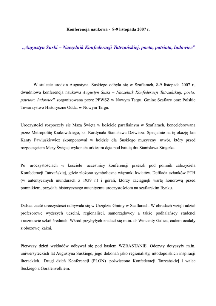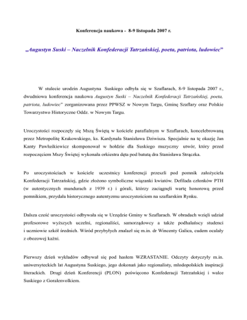 Konferencja naukowa - 8-9 listopada 2007 r. „Augustyn Suski – Naczelnik Konfederacji Tatrzańskiej, poeta, patriota, ludowiec” W stulecie urodzin Augustyna Suskiego odbyła się w Szaflarach, 8-9 listopada 2007 r., dwudniowa konferencja naukowa Augustyn Suski – Naczelnik Konfederacji Tatrzańskiej, poeta, patriota, ludowiec” zorganizowana przez PPWSZ w Nowym Targu, Gminę Szaflary oraz Polskie Towarzystwo Historyczne Oddz. w Nowym Targu. Uroczystości rozpoczęły się Mszą Świętą w kościele parafialnym w Szaflarach, koncelebrowaną przez Metropolitę Krakowskiego, ks. Kardynała Stanisława Dziwisza. Specjalnie na tę okazję Jan Kanty Pawluśkiewicz skomponował w hołdzie dla Suskiego muzyczny utwór, który przed rozpoczęciem Mszy Świętej wykonała orkiestra dęta pod batutą dra Stanisława Strączka. Po uroczystościach w kościele uczestnicy konferencji przeszli pod pomnik założyciela Konfederacji Tatrzańskiej, gdzie złożono symboliczne wiązanki kwiatów. Defilada członków PTH (w autentycznych mundurach z 1939 r.) i górali, którzy zaciągnęli wartę honorową przed pomnikiem, przydała historycznego autentyzmu uroczystościom na szaflarskim Rynku. Dalsza cześć uroczystości odbywała się w Urzędzie Gminy w Szaflarach. W obradach wzięli udział profesorowe wyższych uczelni, regionaliści, samorządowcy a także podhalańscy studenci i uczniowie szkół średnich. Wśród przybyłych znalazł się m.in. dr Wincenty Galica, cudem ocalały z obozowej kaźni. Pierwszy dzień wykładów odbywał się pod hasłem WZRASTANIE. Odczyty dotyczyły m.in. uniwersyteckich lat Augustyna Suskiego, jego dokonań jako regionalisty, młodopolskich inspiracji literackich. Drugi dzień Konferencji (PLON) poświęcono Konfederacji Tatrzańskiej i walce Suskiego z Goralenvolkiem. W ramach konferencji odbyło się też „Spotkanie Pokoleń”. Podczas inscenizacji przygotowanej przez uczniów szaflarskiego gimnazjum wspominano czasy tragedii wielu patriotycznych, góralskich rodzin. Przejmujące wspomnienia odczytali wnukowie świadków tamtych strasznych dni. Obradom podczas konferencji przewodniczyła prof. dr hab. J. Kowalikowa oraz prof. dr hab. J. Kąś Wygłoszone zostały referaty: • • • • • • • • • Idea Goralenvolku a góralszczyzna polska (1939-1945) - dr J. M. Roszkowski Muzeum Tatrzańskie; Augustyn Suski i Konfederacja Tatrzańska oczami Jadwigi Apostoł Staniszewskiej - mgr A. Błaszczyk, mgr S. Apostoł PTH oddz. Nowy Targ; Konfederacja Tatrzańska jako organizacja zbrojna - dr K. Wielgus, mgr R. Kowalski PTH oddz. Nowy Targ; Konfederacja Tatrzańska na tle innych polskich organizacji konspiracyjnych - dr P. Sadowski PTH Oddz. Nowy Targ; Augustyn Suski w KL Auschwitz -dr J. Parcer IPN Oświęcim; Znaczenie Konfederacji Tatrzańskiej dla Podhala - prof. dr hab. St. Hodorowicz PPWSZ; Augustyn Suski jako wzorzec osobowościowy dla młodzieży -wymiana doświadczeń edukacyjnych z udziałem nauczycieli podhalańskich szkół - dyskusję poprowadzą dr A. Mlekodaj oraz mgr J. Szlęk. Referat wprowadzający na temat: Augustyn Suski na lekcjach polskie go i historii w szkole podstawowej, gimnazjum i liceum wygłosi dr B. Zgama PPWSZ podsumowanie konferencji i zakończenie obrad - prof. dr hab. St.. Hodorowicz oraz mgr inż. St. Ślimak - Wójt Gminy Szaflary