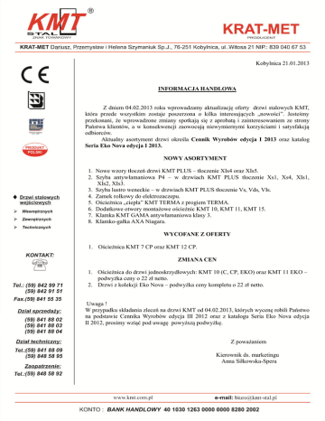 Kobylnica 21.01.2013 INFORMACJA HANDLOWA Z dniem 04.02.2013 roku wprowadzamy aktualizację oferty drzwi stalowych KMT, która przede wszystkim zostaje poszerzona o kilka interesujących „nowości”. Jesteśmy przekonani, że wprowadzone zmiany spotkają się z aprobatą i zainteresowaniem ze strony Państwa klientów, a w konsekwencji zaowocują niewymiernymi korzyściami i satysfakcją odbiorców. Aktualny asortyment drzwi określa Cennik Wyrobów edycja I 2013 oraz katalog Seria Eko Nova edycja I 2013. NOWY ASORTYMENT 1. Nowe wzory tłoczeń drzwi KMT PLUS – tłoczenie XIs4 oraz XIs5. 2. Szyba antywłamaniowa P4 – w drzwiach KMT PLUS tłoczenie Xs1, Xs4, XIs1, XIs2, XIs3. 3. Szyba lustro weneckie – w drzwiach KMT PLUS tłoczenie Vs, Vds, VIs. 4. Zamek rolkowy do elektrozaczepu. 5. Ościeżnica „ciepła” KMT TERMA z progiem TERMA. 6. Dodatkowe otwory montażowe ościeżnic KMT 10, KMT 11, KMT 15. 7. Klamka KMT GAMA antywłamaniowa klasy 3. 8. Klamko-gałka AXA Niagara. WYCOFANE Z OFERTY 1. Ościeżnica KMT 7 CP oraz KMT 12 CP. ZMIANA CEN 1. Ościeżnica do drzwi jednoskrzydłowych: KMT 10 (C, CP, EKO) oraz KMT 11 EKO – podwyżka ceny o 22 zł netto. 2. Drzwi z kolekcji Eko Nova – podwyżka ceny kompletu o 22 zł netto. Uwaga ! W przypadku składania zleceń na drzwi KMT od 04.02.2013, których wycenę robili Państwo na podstawie Cennika Wyrobów edycja III 2012 oraz z katalogu Seria Eko Nova edycja II 2012, prosimy wziąć pod uwagę powyższą podwyżkę. Z poważaniem Kierownik ds. marketingu Anna Siłkowska-Spera
