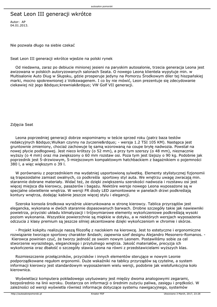 autosalon pomorski Seat Leon III generacji wkrótce Autor: AP 04.01.2013. Nie pozwala długo na siebie czekać Seat Leon III generacji wkrótce wjedzie na polski rynek Od niedawna, zaraz po debiucie minionej jesieni na paryskim autosalonie, trzecia generacja Leona jest awizowana w polskich autoryzowanych salonach Seata. O nowego Leona klientela wypytuje min. w Multisalonie Auto Diug w Słupsku, gdzie prosperuje jedyny na Pomorzu Środkowym diler tej hiszpańskiej marki, mocno spokrewnionej z Volkswagenem. I co by nie mówić, Leon prezentuje się zdecydowanie ciekawiej niż jego „krewniak” VW Golf VII generacji. Zdjęcia Seat Leona poprzedniej generacji dobrze wspominamy w teście sprzed roku (patrz baza testów redakcyjnych „Wulkan czynny na życzenie” - wersja 1.2 TSI 105 KM). Następca jest gruntownie zmieniony, chociaż zachowuje tę samą wzorowaną na coupe bryłę nadwozia. Powstał na nowej płycie podłogowej. Jest nieco krótszy (o 52 mm), a przy tym szerszy (o 48 mm), nieznacznie wyższy (o 4 mm) oraz ma zwiększony o 60 mm rozstaw osi. Poza tym jest lżejszy o 90 kg. Podobnie jak poprzednik jest 5-drzwiowym, 5-miejscowym kompaktowym hatchbackiem z bagażnikiem o pojemności 380 l, a więc większym o 39 l. W porównaniu z poprzednikiem ma wydatniej usportowioną sylwetkę. Elementy stylistycznej fizjonomii są trapezoidalne zamiast owalnych, co podkreśla sportowy styl auta. We wnętrzu uwagę zwracają min. starannie dobrane materiały. Widać też, że dzięki zwiększeniu szerokości nadwozia i rozstawu osi jest więcej miejsca dla kierowcy, pasażerów i bagażu. Niektóre wersje nowego Leona wyposażone są w specjalne oświetlenie wnętrza. W wersji FR diody LED zamontowane w panelach drzwi podkreślają kontury wnętrza, dodając kabinie jeszcze więcej stylu i elegancji. Szeroka konsola środkowa wyraźnie ukierunkowana w stronę kierowcy. Tablica przyrządów jest elegancka, wykonana w dwóch starannie dopasowanych barwach. Drobne szczegóły takie jak nawiewniki powietrza, przyciski układu klimatyzacji i trójwymiarowe elementy wykończeniowe podkreślają wysoki poziom wykonania. Wszystkie powierzchnie są miękkie w dotyku, a w niektórych wersjach wyposażenia odczucia z klasy premium są jeszcze silniej akcentowane dzięki wykończeniom w chromie i skórze. - Projekt kokpitu realizuje naszą filozofię z naciskiem na kierowcę. Jest to estetyczne i ergonomiczne rozwiązanie tworzące sportowy charakter – zapewnia szef designu Alejandro Mesonero-Romanos. Kierowca powinien czuć, że tworzy jedność ze swoim nowym Leonem. Postawiliśmy sobie za cel stworzenie wyrazistego, eleganckiego i przytulnego wnętrza. Jakość materiałów, precyzja ich wykończenia oraz dbałość o szczegóły stawia Leona na równi z przedstawicielami wyższych klas. Rozmieszczenie przełączników, przycisków i innych elementów sterujące w nowym Leonie podporządkowane regułom ergonomii. Duże wskaźniki na tablicy przyrządów są czytelne, a system informacji kierowcy jest standardowym wyposażeniem wielu wersji, podobnie jak wielofunkcyjna koło kierownica. Wyświetlacz komputera pokładowego usytuowany jest między dwoma analogowymi zegarami, bezpośrednio na linii wzroku. Dostarcza on informacji o średnim zużyciu paliwa, zasięgu i prędkości. W zależności od wersji wyświetla również informacje dotyczące systemu nawigacyjnego, systemów http://autosalonpomorski.pl Kreator PDF Utworzono 3 March, 2017, 23:28 autosalon pomorski wspomagających kierowcę oraz telefonu połączonego za pośrednictwem Bluetooth. Nowy Leon wprowadza pierwszą generację dotykowego wyświetlacza o przekątnej 5,8-cala z czujnikiem odległości. Poczujemy więcej wygody dzięki nowo skonstruowanym fotelom. Są niżej osadzone, regulacja ich wysokości jest standardem. Nowe fotele dostępne będą z kilkoma rodzajami tkanin, skóry i Alcantary tak, aby każdy mógł dostosować wnętrze do indywidualnych preferencji. Masę pojazdu obniżono dzięki zastosowaniu standardowych poduszek powietrznych kierowcy i pasażera, które są obecnie montowane bez obudów z tworzywa sztucznego. Ponadto, poduszki powietrzne są zintegrowane z oparciami foteli. Powyższe modyfikacje to nie tylko mniejsza masa pojazdu, ale i zwiększone bezpieczeństwo. Z tyłu nowy Leon jest przestronny, zapewniając sporą ilość miejsca dla ramion, kolan i głowy. Wygodna kanapa wyposażona jest w trzy zagłówki. Aby zadbać o najmłodszych pasażerów, wyposażono ją ponadto w systemy mocowań fotelików Isofix oraz Top Teather. Tylna kanapa jest również bardzo łatwa do złożenia. Dzielona w proporcji 60:40 po złożeniu tworzy niemal płaską podłogę o długości 1.558 mm . Seat zapewnia, że wysyła nowego Leona na bitwę wydajnych i oszczędnych silników TDI i TSI, o pojemnościach od 1,2 do 2,0 litra. Wszystkie silniki wyposażone są w bezpośredni wtrysk i turbodoładowanie. Zostały one zaprojektowane z myślą o niskim tarciu wewnętrznym i szybkiemu rozgrzewaniu. W porównaniu do poprzedników, ich zużycie paliwa zmniejszyło się nawet o 22 proc. Silnik 1.6 TDI generuje maksymalnie 105 KM i 250 Nm momentu obrotowego. W wersji Ecomotive z systemem Start/Stop auto zużywa tylko 3,8 litra oleju napędowego na 100 km w cyklu NEDC – Nowym Europejskim Cyklu Jazdy (cyklu mieszanym), co przekłada się na wydalanie 99 gramów CO2 na kilometr. Gruntownie przeprojektowana jednostka napędowa 2.0 TDI zużywa teraz średnio zaledwie 4,0 litra paliwa na 100 km w wersji Ecomotive, generując przy tym maksymalnie 150KM i 320 Nm momentu obrotowego. Na początku 2013 roku można się spodziewać poszerzenia oferty o nowe jednostki 1.2 TSI w wersjach 86 i 105 KM oraz 1.4 TSI 122 KM i 1.8 TSI 180 KM z kombinacjami bezpośredniego i wielopunktowego wtrysku paliwa. Gama jednostek wysokoprężnych line-up zostanie wzbogacona o 1.6 TDI - 90 KM oraz nową 2-litrowa jednostkę TDI 184 KM, zapewniającą maksymalny 