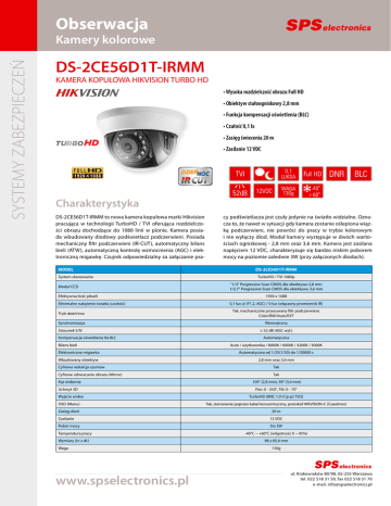 Obserwacja SYSTEMY ZABEZPIECZEŃ Kamery kolorowe DS-2CE56D1T-IRMM KAMERA KOPUŁOWA HIKVISION TURBO HD • Wysoka rozdzielczość obrazu Full HD • Obiektyw stałoogniskowy 2,8 mm • Funkcja kompensacji oświetlenia (BLC) • Czułość 0,1 lx • Zasięg świecenia 20 m • Zasilanie 12 VDC Charakterystyka DS-2CE56D1T-IRMM to nowa kamera kopułowa marki Hikvision pracująca w technologii TurboHD / TVI oferująca rozdzielczości obrazu dochodzące do 1080 linii w pionie. Kamera posiada wbudowany diodowy podświetlacz podczerwieni. Posiada mechaniczny filtr podczerwieni (IR-CUT), automatyczny bilans bieli (ATW), automatyczną kontrolę wzmocnienia (AGC) i elektroniczną migawkę. Czujnik odpowiedzialny za załączanie praMODEL System skanowania Moduł CCD Efektywna ilość pikseli Minimalne natężenie światła (czułość) cy podświetlacza jest czuły jedynie na światło widzialne. Oznacza to, że nawet w sytuacji gdy kamera zostanie oślepiona wiązką podczerwieni, nie powróci do pracy w trybie kolorowym i nie wyłączy diod. Moduł kamery występuje w dwóch wartościach ogniskowej - 2,8 mm oraz 3,6 mm. Kamera jest zasilana napięciem 12 VDC, charakteryzuje się bardzo niskim poborem mocy na poziomie zaledwie 3W (przy załączonych diodach). DS-2CE56D1T-IRMM TurboHD / TVI 1080p "1/3" Progressive Scan CMOS dla obiektywu 2,8 mm 1/2,7" Progressive Scan CMOS dla obiektywu 3,6 mm 1930 x 1088 0,1 lux @ (F1.2, AGC) / 0 lux (włączony promiennik IR) Tryb dzień/noc Tak, mechanicznie przesuwany filtr podczerwieni, Color/BW/Auto/EXT Synchronizacja Wewnętrzna Stosunek S/N Kompensacja oświetlenia tła BLC Bilans bieli ≥ 52 dB (AGC wył.) Automatyczna Auto / użytkownika / 8000K / 6000K / 4200K / 3000K Elektroniczna migawka Automatyczna od 1/25(1/30) do 1/50000 s Wbudowany obiektyw 2,8 mm oraz 3,6 mm Cyfrowa redukcja szumów Cyfrowe odwracanie obrazu (Mirror) Kąt widzenia Uchwyt 3D Wyjście wideo OSD (Menu) Zasięg diod Zasilanie Pobór mocy Temperatura pracy Wymiary (śr. x dł.) Waga www.spselectronics.pl Tak Tak 104° (2,8 mm), 90° (3,6 mm) Pan: 0 - 350°, Tilt: 0 - 70° TurboHD (BNC 1,0 V [p-p] 75Ω) Tak, sterowanie poprzez kabel koncentryczny, protokół HIKVISION-C (Coaxitron) 20 m 12 VDC Do 3W -40°C ~ +60°C (wilgotność 0 ~ 95%) 98 x 65,4 mm 130g ul. Krakowiaków 80/98, 02-255 Warszawa tel. 022 518 31 50, fax 022 518 31 70 e-mail: [email protected]