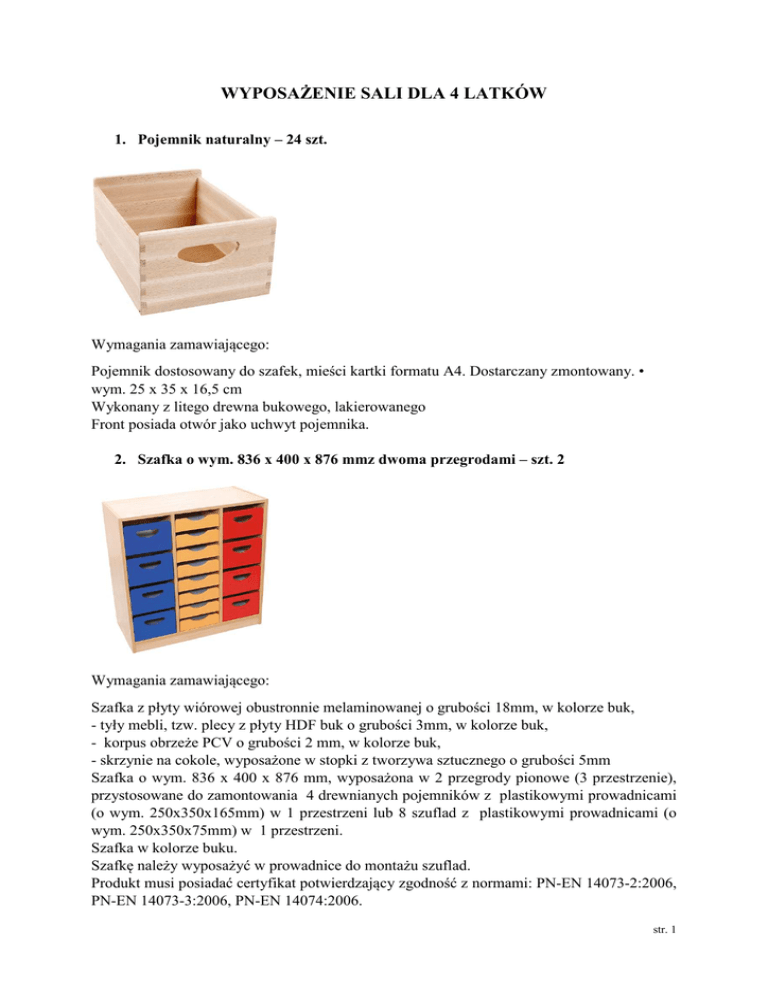 WYPOSAŻENIE SALI DLA 4 LATKÓW 1. Pojemnik naturalny – 24 szt. Wymagania zamawiającego: Pojemnik dostosowany do szafek, mieści kartki formatu A4. Dostarczany zmontowany. • wym. 25 x 35 x 16,5 cm Wykonany z litego drewna bukowego, lakierowanego Front posiada otwór jako uchwyt pojemnika. 2. Szafka o wym. 836 x 400 x 876 mmz dwoma przegrodami – szt. 2 Wymagania zamawiającego: Szafka z płyty wiórowej obustronnie melaminowanej o grubości 18mm, w kolorze buk, - tyły mebli, tzw. plecy z płyty HDF buk o grubości 3mm, w kolorze buk, - korpus obrzeże PCV o grubości 2 mm, w kolorze buk, - skrzynie na cokole, wyposażone w stopki z tworzywa sztucznego o grubości 5mm Szafka o wym. 836 x 400 x 876 mm, wyposażona w 2 przegrody pionowe (3 przestrzenie), przystosowane do zamontowania 4 drewnianych pojemników z plastikowymi prowadnicami (o wym. 250x350x165mm) w 1 przestrzeni lub 8 szuflad z plastikowymi prowadnicami (o wym. 250x350x75mm) w 1 przestrzeni. Szafka w kolorze buku. Szafkę należy wyposażyć w prowadnice do montażu szuflad. Produkt musi posiadać certyfikat potwierdzający zgodność z normami: PN-EN 14073-2:2006, PN-EN 14073-3:2006, PN-EN 14074:2006. str. 1 3. Szafka o wym. 690 x 400 x 876 mm– szt. 1 Wymagania zamawiającego: Szafka z płyty wiórowej obustronnie melaminowanej o grubości 18mm, w kolorze buk, - tyły mebli, tzw. plecy z płyty HDF buk o grubości 3mm, w kolorze buk, - korpus obrzeże PCV o grubości 2 mm, w kolorze buk, - półki wyposażone w specjalne zaczepy z zabezpieczeniem przed wysuwaniem się półek, - 3 stopniowa regulacja wysokości każdej półki - skrzynie na cokole, wyposażone w stopki z tworzywa sztucznego o grubości 5mm Szafka o wym. 690 x 400 x 876 mm, wyposażona w 3 półki otwarte (4 przestrzenie). 4. Szafka o wym. 836 x 400 x 1900 mm – szt. 1 Wymagania zamawiającego: Szafka z płyty wiórowej obustronnie melaminowanej o grubości 18mm, w kolorze buk, - tyły mebli, tzw. plecy z płyty HDF buk o grubości 3mm, w kolorze buk, - korpus obrzeże PCV o grubości 2 mm, w kolorze buk, - półki wyposażone w specjalne zaczepy z zabezpieczeniem przed wysuwaniem się półek, - 3 stopniowa regulacja wysokości każdej półki - skrzynie na cokole, wyposażone w stopki z tworzywa sztucznego o grubości 5mm Szafa o wym. 836 x 400 x 1900 mm. Wyposażona w 4 półki otwarte (5 przestrzeni) z możliwością zamontowania drzwi o wym. 395 x 750 mm lub 395 x 1830 mm. Produkt musi posiadać certyfikat potwierdzający zgodność z normami: PN- F-06010-05:1990, PN- F-06009:2001, PN-EN 14073-2:2006. str. 2 5. Duże drzwi z zamkiem i zawiasem 180 stopni – bukowe Wymagania zamawiającego: Drzwi z płyty wiórowej obustronnie melaminowanej o grubości 18mm, w kolorze buk, - obrzeże PCV o grubości 2 mm, w kolorze buk, - wygodne uchwyty gałkowe, wykonane z drewna Drzwi o wym. 395 x 1830 mm. Wyposażone w zawiasy, które pozwalają na otwarcie drzwi pod kątem 180 st. na zewnątrz. W środkowej części drzwi znajduje się zamek, a na dole jednego ze skrzydeł - zasuwka. Oba skrzydła wyposażone są w uchwyty - w komplecie 1 para, kolor buk. Produkt musi posiadać certyfikat potwierdzający zgodność z normami: PN- F-0601005:1990, PN- F-06009:2001, PN-EN 14073-2:2006. 6. Szafka plastyczna – szt. 1 Wymagania zamawiającego: Szafka z płyty wiórowej obustronnie melaminowanej o grubości 18mm, w kolorze buk, - tyły mebli, tzw. plecyz płyty HDF buk o grubości 3mm, w kolorze buk, - korpus obrzeże PCV o grubości 2 mm, w kolorze buk, - drzwiczki z płyty o grubości 18 mm obustronnie melaminowanej i oklejane obrzeżem PCV buk o grubości 2 mm, - wygodne uchwyty gałkowe, z drewna - półki wyposażone w specjalne zaczepy z zabezpieczeniem przed wysuwaniem się półek, str. 3 - skrzynie na cokole, wyposażone w stopki z tworzywa sztucznego o grubości 5mm Szafka o wym. 838 (+120 mm boczne półeczki) x 400 x 800 mm. Górna otwarta część pozwala na przechowywanie farb, pędzelków i innych materiałów, które pozostają łatwo dostępne dla dzieci. Poniżej otwarta półka, pod nią 1 półka (2przestrzenie), zamknięta 2skrzydłowymi drzwiczkami z uchwytami. Z boku szafki 2 kieszenie górna i dolna, służące do przechowywania rolek papierów, bibuł itp. Szafa w kolorze buku. Produkt musi posiadać certyfikat potwierdzający zgodność z normami:PN-EN 14073-2:2006, PN-EN 14073-3:2006, PN-EN 14074:2006 7. Szafka o wym. 536 x 400 x 500 mm– szt. 1 Wymagania zamawiającego: Szafka z płyty wiórowej obustronnie melaminowanej o grubości 18mm, w kolorze buk, - tyły mebli, tzw. plecy z płyty HDF buk o grubości 3mm, w kolorze buk, - korpus obrzeże PCV o grubości 2 mm, w kolorze buk, - drzwiczki i fronty szuflad z płyty o grubości 18 mm obustronnie melaminowanej i oklejane obrzeżem PCV buk o grubości 2 mm, - wygodne uchwyty gałkowe, z drewna - półki wyposażone w specjalne zaczepy z zabezpieczeniem przed wysuwaniem się półek, - 3 stopniowa regulacja wysokości każdej półki - zabezpieczenia przed wypadnięciem szuflad, pojemników, - skrzynie na cokole, wyposażone w stopki z tworzywa sztucznego o grubości 5mm Szafka o wym. 536 x 400 x 500 mm. Wyposażona w 1 półkę otwartą od góry, poniżej półka zamknięta drzwiczkami (1 para) wyposażonymi w uchwyty, na samym dole szuflada na całej szerokości szafki wyposażona w uchwyt. Szafka w kolorze buku. Produkt powinien posiadać certyfikat zgodność z normami: - PN-EN 14073-2:2006 Meble biurowe - Meble do przechowywania - Część 2: Wymagania bezpieczeństwa - PN-F-06010-05:1990 Meble szkolne i przedszkolne - Meble do przechowywania Podstawowe wymiary funkcjonalne - PN-F-06009:2001 Meble szkolne i przedszkolne - Wymagania i badania str. 4 8. Zestaw instrumentów mix – 1 kpl. Wymagania zamawiającego: • 17 rodzajów instrumentów dla 26 dzieci: - dzwonki diatoniczne - trójkąt, 2 szt. - drewniane jajka, 2 szt. - tamburyny, 2 szt. - pałeczki z dzwoneczkami, 2 szt. - 