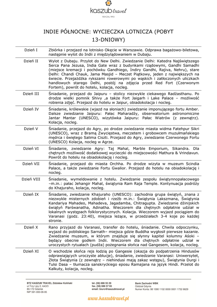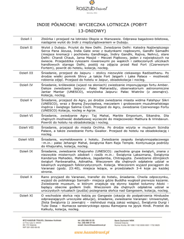 INDIE PÓŁNOCNE: WYCIECZKA LOTNICZA (POBYT 13-DNIOWY) Dzień I Zbiórka i przejazd na lotnisko Okęcie w Warszawie. Odprawa bagażowo-biletowa, następnie wylot do Indii z międzylądowaniem w Dubaju. Dzień II Wylot z Dubaju. Przylot do New Delhi. Zwiedzanie Delhi: Katedra Najświętszego Serca Pana Jezusa, India Gate wraz z budynkami rządowymi, Gandhi Samadhi (miejsce kremacji i pochówku Gandhiego, Indiry Gandhi, Rajiva, Nehru), stare Delhi: Chandi Chauk, Jama Masjid – Meczet Piątkowy, jeden z największych na świecie. Przejażdżka rykszami rowerowymi po wąskich i zatłoczonych uliczkach handlowych starego Delhi, postój na zdjęcia przed Red Fort (Czerwonym Fortem), powrót do hotelu, kolacja, nocleg. Dzień III Śniadanie, przejazd do Jaipuru – stolicy niezwykle ciekawego Radźasthanu. Po drodze wielki pomnik Shivy ,a także Fort Jaigarh i Lake Palace – możliwość robienia zdjęć. Przejazd do hotelu w Jaipur, obiadokolacja i nocleg. Dzień IV Śniadanie, królewskie (wjazd na słoniach) zwiedzanie imponującego fortu Amber. Dalsze zwiedzanie Jaipuru: Pałac Maharadźy, obserwatorium astronomiczne Jantar Mantar (UNESCO), wizytówka Jaipuru: Pałac Wiatrów (z zewnątrz). Kolacja, nocleg. Dzień V Śniadanie, przejazd do Agry, po drodze zwiedzanie miasta widma Fatehpur Sikri (UNESCO), wraz z Bramą Zwycięstwa, meczetem i grobowcem muzułmańskiego mędrca i świętego Salima Ciszti. Przejazd do Agry, zwiedzanie Czerwonego Fortu (UNESCO) Kolacja, nocleg w Agrze. Dzień VI Śniadanie, zwiedzanie Agry: Taj Mahal, Marble Emporium, Sikandra. Dla chętnych możliwość dodatkowej wycieczki do miejscowości Mathura & Vrindavun. Powrót do hotelu na obiadokolację i nocleg. Dzień VII Śniadanie, przejazd do miasta Orchha. Po drodze wizyta w muzeum Scindia Palace, a także zwiedzanie Fortu Gwalior. Przejazd do hotelu na obiadokolację i nocleg. Dzień VIII Śniadanie, wymeldowanie z hotelu. Zwiedzanie zespołu świątynnopałacowego –m.in.: pałac Jehangir Mahal, świątynia Ram Raja Temple. Kontynuacja podróży do Khajuraho, kolacja, nocleg. Dzień IX Śniadanie, zwiedzanie Khajuraho (UNESCO): zachodnia grupa świątyń, znana z niezwykle misternych zdobień i rzeźb m.in.: Świątynia Lakszmana, Świątynia Kandariya Mahadeo, Mahadeva, Jagadamba, Chitragupta. Zwiedzanie dźinijskich świątyń Parśwanatha, Adinatha. Wieczorem dla chętnych odpłatnie udział w lokalnych występach folklorystycznych. Kolacja. Wieczorem wyjazd pociągiem do Varanasi (godz. 23:40), miejsca leżące, w przedziałach 3-4 koje po każdej stronie. Dzień X Rano przyjazd do Varanasi, transfer do hotelu, śniadanie. Chwila odpoczynku, wyjazd do pobliskiego Sarnath– miejsca gdzie Buddha wygłosił pierwsze kazanie. Zwiedzanie muzeum, w którym znajduje się słynny kapitel kolumny Aśoki – będący obecnie godłem Indii. Wieczorem dla chętnych odpłatnie udział w uroczystych rytuałach (pudźa) pożegnania słońca nad Gangesem, kolacja, nocleg. Dzień XI O wschodzie słońca rejs łodzią po Gangesie (okazja do podpatrzenia Hindusów odprawiających uroczyste ablucje), śniadanie, zwiedzanie Varanasi: Uniwersytet, Złota Świątynia (z zewnątrz – niehindusi mają zakaz wstępu), Świątynia Durgi i Tulsi Dasa – tłumacza sanskryckiego eposu Ramajana na język Hindi. Przelot do Kalkuty, kolacja, nocleg. Dzień XII Śniadanie, zwiedzanie Kalkuty - miasta gdzie mieszkała i działała błogosławiona Matka Teresa, założycielka Zgromadzenia Sióstr Miłosierdzia: wizyta w domu Matki Teresy i przy grobie błogosławionej, Victoria Memorial – imponujący pałac upamiętniający królową Wiktorię, Katedra Św. Pawła, Dalhousie Square – centrum miasta z zabytkowymi budynkami, Kalighat – świątynia bogini Kali, kolacja. Przejazd na lotnisko. Odprawa bagażowo biletowa, a następnie wylot do Dubaju. Dzień XIII Lądowanie w Dubaju. Wylot do Polski. Lądowanie w Warszawie. Przejazd autokarem do Gdańska. Zakończenie pielgrzymki. ŚWIADCZENIA: • przejazd na i z lotniska w Warszawie • przelot samolotem na trasie: Polska – Indie, Indie - Polska • transport autokarem w Indiach zgodnie z programem • noclegi w pokojach 2 osobowych z łazienką (hotele 4* - wg. kategori lokalnej) • przejazd pociągami zgodnie z programem: „AC chair” na trasie Agra do Jhansi,3rd AC na trasie Khajuraho – Varanasi (miejsca leżące) • śniadania i kolacje wg. programu • wjazd na słoniu do fortu Amber • riksze rowerowe w Starym Delhi • rejs łodzią po Gangesie w Varanasi • bilety wstępu do zwiedzanych obiektów • ubezpieczenie KL, NNW i bagażu w Signal Iduna – wariant podstawowy (nie obejmuje chorób przewlekłych) • lokalnych przewodników • opieka pilota pielgrzymki CENA NIE ZAWIERA: • • • • • • • przelotu wewnętrznego Varanasi – Kalkuta (ok. 90 usd – cena po ustaleniu terminu) zwyczajowych napiwków dla kierowców i lokalnych przewodników (ok. 4 usd/dzień) opcjonalnego udziału w występach folklorystycznych i uroczystych rytuałach pudźa wizy do Indii (e-wiza ok. 300 zł, wiza wklejana ok. 400 zł) ewentualnych opłat za filmowanie i fotografowanie w zwiedzanych obiektach ewentualnego późnego wykwaterowania w Khajuraho – 25 USD świadczeń nie objętych programem UWAGI: • zastrzega się możliwość zmiany kolejności zwiedzanych obiektów • organizator nie odpowiada za nieprzewidziane zmiany niezależne od niego • paszport musu być ważny przynajmniej 12 miesięcy od daty zakończenia wyjazdu oraz musi mieć przynajmniej dwie puste strony na wizę, • zdjęcie tzw. „biometryczne, wymiary 35 x 45 mm, w kolorze, tło jednolite jasne , twarz powinna zajmować 70-80% fotografii, na wprost, nie przysłonięta, bez nakrycia głowy i okularów z ciemnymi szkłami • przed wyjazdem do Indii nie ma obowiązku poddawania się żadnym szczepieniom. Zaleca się szczepienia: wirusowe zapalenie wątroby typu A i B, błonica i tężec, dur brzus