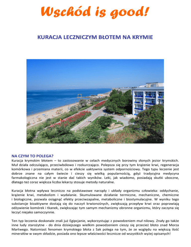 Wschód is good! KURACJA LECZNICZYM BŁOTEM NA KRYMIE NA CZYM TO POLEGA? Kuracja krymskim błotem – to zastosowanie w celach medycznych borowiny słonych jezior krymskich. Muł działa odczulająco, przeciwbólowo i rozkurczająco. Polepsza się przy tym krążenie krwi, regeneracja komórkowa i przemiana materii, co w efekcie uaktywnia system odpornościowy. Tego typu leczenie jest dobrze znane na całym świecie i cieszy się wielką popularnością, gdyż tradycyjna medycyna farmakologiczna nie jest w stanie dać takich wyników. Leki, jak wiadomo, posiadają skutki uboczne, dlatego też coraz większa liczba lekarzy stosuje metody naturalne. Kuracja błotna wpływa leczniczo na podstawowe narządy i układy organizmu człowieka: oddychanie, krążenie krwi, metabolizm i wydalanie. Skumulowane działanie termiczne, mechaniczne, chemiczne i biologiczne, pozwala osiągnąć efekty przeciwzapalne, metaboliczne i biostymulacyjne. W wyniku tego substancje bioaktywne dostają się do naczyń krwionośnych, zwiększają przepływ krwi oraz poprawiają odżywienie komórek i tkanek, zwiększając tym samym mechanizmy obronne organizmu, który zaczyna się leczyć niejako samoczynnie. Ten typ leczenia doskonale znali już Egipcjanie, wykorzystując z powodzeniem muł nilowy. Znały go także inne ludy starożytne - do dnia dzisiejszego wielkim powodzeniem cieszy się przecież błoto znad Morza Martwego. Natomiast fenomen krymskiego błota z Sak polega na tym, że ze względu na większą ilość minerałów w swym składzie, posiada ono lepsze właściwości lecznicze od wszystkich wyżej opisanych! KURORT SAKI Położony jest w zachodniej części półwyspu, pomiędzy Morzem Czarnym a słonymi jeziorami, w odległości kilkunastu kilometrów od sławnego kurortu Eupatoria. Doskonale znany w całym byłym ZSRR, a obecnie również w Europie Zachodniej, przede wszystkim ze swoich znakomitych wyników leczniczych, szerokich plaż piaszczysto-ilastych oraz największego nasłonecznienia na całym Krymie. Już w piątym wieku przed naszą erą o leczniczym mule w Sakach pisali Herodot i Pliniusz. Historia zaś współczesnej terapii błotnej sięga roku 1828, choć w pełni rozkwitła w połowie XIX wieku w czasie trwania Wojny Krymskiej, gdy żołnierze alianccy z powodzeniem używali jej do leczenia swoich ran. JAKIE CHOROBY LECZY SIĘ W SAKACH? Leczenie błotem krymskim, to turnus składający się z 10-14 zabiegów, trwających 15-30 minut. Cykl zabiegów zawsze ordynowany jest przez lekarzy uzdrowiskowych dla każdego pacjenta indywidualnie (wyłącznie na podstawie skierowania) i zależy od wielu czynników. W efekcie pozwala skutecznie radzić sobie z takimi dolegliwościami jak: choroby stawów, w tym: dna moczanowa, zapalenie stawów, choroba zwyrodnieniowa stawów, dyskopatia i inne choroby układu mięśniowo-szkieletowego; leczenie chorób skóry takich jak łuszczyca i egzema; leczenie męskiej i żeńskiej niepłodności; leczenie przewlekłego zapalenia gruczołu krokowego, impotencji oraz innych chorób układu moczowo-płciowego u mężczyzn; leczenie stanów zapalnych chorób ginekologicznych u kobiet; leczenie chorób ośrodkowego układu nerwowego; leczenie chorób przewodu pokarmowego. SANATORIUM POŁTAWA-KRYM Leczenie błotem w Sanatorium Połtawa-Krym to połączenie wielu czynników: niezwykłych właściwości mułu słonych jezior – sanatorium posiada własne takie jezioro; sakskiej wody mineralnej - wydobywanej z głębokości 980 metrów i dostarczanej zarówno do sanatoryjnego basenu jak i kranów w pokojach; kąpieli słonecznych - słońce świeci tu 270 dni w roku, a wiec 9 miesięcy!; kąpieli morskich - sanatorium posiada własną piękną plażę; wysoko wykwalifikowanego personelu medycznego stosującego najnowocześniejsze metody lecznicze i rehabilitacyjne; supernowoczesnej bazy leczniczej z zapleczem laboratoryjnym. Sanatorium Połtawa-Krym to komfortowy ośrodek leczniczo-wypoczynkowy, działający przez okrągły rok: położony na obrzeżach miasta, z własną plażą morską, dostępem do jeziora i całodobowa ochroną; komfortowe pokoje z łazienkami, klimatyzacją, TV Sat, lodówką, wi-fi oraz mineralną wodą w wannach lub prysznicach; wyżywienie 4 razy dziennie w formie szwedzkiego stołu; SPA i dwa baseny, w tym jeden z wodą mineralną; siłownie, kawiarnie, apteka, bankomat i oddział bankowy, salon fryzjerski, sala bilardowa, sala kinowo-widowiskowa, sala dyskotekowa, business-center, miejsca zabaw dla dzieci, własny mini park i inne tego typu atrakcje, niezbędne do należytego odpoczynku i rehabilitacji; wysoką skuteczność leczniczo-wypoczynkową sanatorium potwierdza coraz większa liczba kuracjuszy z Europy Zachodniej, głównie z Niemiec. Dodatkowe zabiegi lecznicze w Sanatorium Połtawa-Krym: aquaterapia hydroterapia klimatoterapia ozonoterapia fizjoterapia psychoterapia refleksoterapia mechanoterapia limfodrenaż medycyna kosmetyczna suche wanny węglowe terapia falami uderzającymi masaż tajski i ajuwerdyczny FOTO (pokoje, łazienki, leczenie, wyżywienie, plaża, teren sanatorium) www.saki-poltava.ru/foto.php VIDEO (web-kamera i 3 filmiki) www.saki-poltava.ru/video.php WYMAGANE DOKUMENTY W JĘZYKU ROSYJSKIM LUB ANGIELSKIM Skierowanie od lekarza prowadzącego Wyciąg z historii choroby Inne dokumenty medyczne (w razie potrzeby) Na podstawie w/w dokumentów lekarze Sanatorium kwalifikują na leczenie. Planując wyjazd należy również uwzględnić konieczność wyrobienia wizy, rezerwacji biletów lotniczych oraz miejsc noclegowych. Przygotowania najlepiej więc rozpocząć kilka miesięcy wcześniej. Pomogę oczywiście w tych wszystkich kwestiach, jak również we wszelkich innych sprawach logistyczno-organizacyjnych i pobytowych, zarówno w kraju jak i za granicą. Do wyjazdu konieczny jest paszport i rosyjska wiza. SANATORIUM POŁTAWA-KRYM Saki, ul. Morska 8 Republika Krym Rosja www.saki-poltava.ru www.wschodisgood.pl