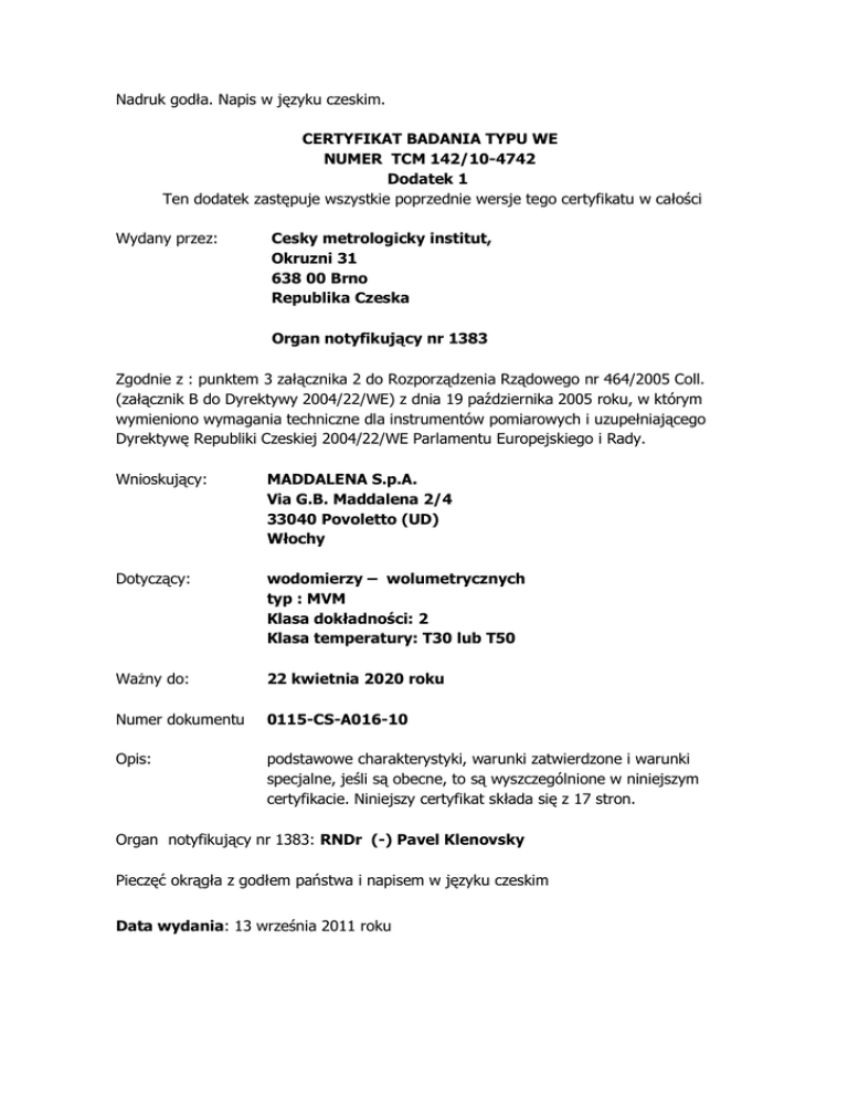 Nadruk godła. Napis w języku czeskim. CERTYFIKAT BADANIA TYPU WE NUMER TCM 142/10-4742 Dodatek 1 Ten dodatek zastępuje wszystkie poprzednie wersje tego certyfikatu w całości Wydany przez: Cesky metrologicky institut, Okruzni 31 638 00 Brno Republika Czeska Organ notyfikujący nr 1383 Zgodnie z : punktem 3 załącznika 2 do Rozporządzenia Rządowego nr 464/2005 Coll. (załącznik B do Dyrektywy 2004/22/WE) z dnia 19 października 2005 roku, w którym wymieniono wymagania techniczne dla instrumentów pomiarowych i uzupełniającego Dyrektywę Republiki Czeskiej 2004/22/WE Parlamentu Europejskiego i Rady. Wnioskujący: MADDALENA S.p.A. Via G.B. Maddalena 2/4 33040 Povoletto (UD) Włochy Dotyczący: wodomierzy – wolumetrycznych typ : MVM Klasa dokładności: 2 Klasa temperatury: T30 lub T50 Ważny do: 22 kwietnia 2020 roku Numer dokumentu 0115-CS-A016-10 Opis: podstawowe charakterystyki, warunki zatwierdzone i warunki specjalne, jeśli są obecne, to są wyszczególnione w niniejszym certyfikacie. Niniejszy certyfikat składa się z 17 stron. Organ notyfikujący nr 1383: RNDr (-) Pavel Klenovsky Pieczęć okrągła z godłem państwa i napisem w języku czeskim Data wydania: 13 września 2011 roku