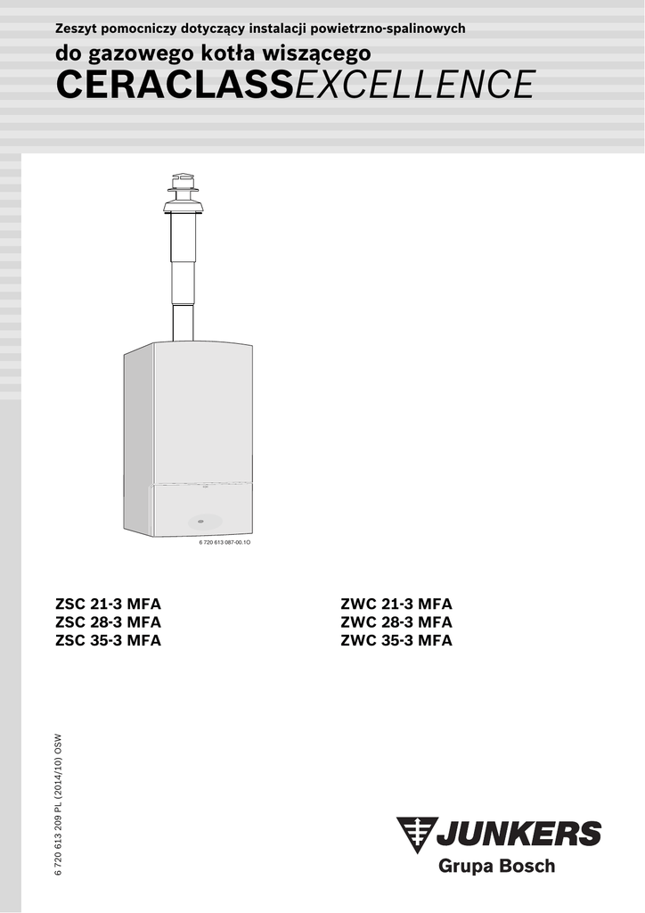 Zeszyt pomocniczy dotyczący instalacji powietrzno-spalinowych do gazowego kotła wiszącego CERACLASSEXCELLENCE 6 720 613 087-00.1O 6 720 613 209 PL (2014/10) OSW ZSC 21-3 MFA ZSC 28-3 MFA ZSC 35-3 MFA ZWC 21-3 MFA ZWC 28-3 MFA ZWC 35-3 MFA Spis treści Spis treści 1 1.1 1.2 2 2.1 2.2 2.3 2.4 Wskazówki dotyczące bezpieczeństwa i objaśnienie symboli Wskazówki dotyczące bezpieczeństwa Objaśnienie symboli 2 2 2 Zastosowanie Informacje ogólne Gazowy kocioł wiszący Wskazówki dotyczące montażu Zestawienie wyposażenia dodatkowego instalacji powietrzno-spalinowej Klasyfikacja rozwiązań systemu powietrznospalinowego według CEN 3 3 3 3 3 3.1 3.2 3.3 Poziomy układ powietrzno-spalinowy Wymiary montażowe (w mm) Wybór podkładki dławiącej (kryzy) Przykład montażu 6 6 8 9 4 4.1 4.2 4.3 Pionowy układ powietrzno-spalinowy Wymiary montażowe (w mm) Wybór podkładki dławiącej (kryzy) Przykłady montażu 10 10 12 13 5 5.1 5.2 5.3 System z rurami oddzielnymi Wymiary montażowe (w mm) Wybór podkładki dławiącej (kryzy) Przykłady montażu 14 14 16 18 2.5 4 5 1 Wskazówki dotyczące bezpieczeństwa i objaśnienie symboli 1.1 Wskazówki dotyczące bezpieczeństwa Tylko przestrzeganie treści zawartych w instrukcji montażu zapewnia prawidłowe działanie. Zastrzega się możliwość wprowadzenia zmian. Montaż może zostać wykonany tylko przez uprawnionego instalatora. W trakcie montażu kotła należy stosować się do odpowiedniej instrukcji montażu. Jeśli poczujesz spaliny: B Wyłącz urządzenie B Otwórz okna i drzwi. B Powiadom serwis. Montaż, przezbrojenie B Montaż może przeprowadzić tylko uprawniona firma instalacyjna, a przezbrojenie tylko uprawniony serwis. B Nie zmieniać elementów odprowadzających spaliny. B Nie zasłaniać i nie zmniejszać otworów wentylacyjnych w drzwiach, oknach i ścianach. W przypadku montażu szczelnych okien należy zagwarantować dopływ powietrza do spalania. 1.2 Objaśnienie symboli Wskazówki dotyczące bezpieczeństwa będą oznaczone w tekście trójkątem ostrzegawczym. Słowa wytłuszczone oznaczają możliwe niebezpieczeństwo, jeśli nie będzie się przestrzegało odpowiednich zaleceń. • Uwaga oznacza, że mogą nastąpić lekkie uszkodzenia przedmiotów. • Ostrzeżenie oznacza, że może dojść do lekkiego uszkodzenia ciała, lub cięższych uszkodzeń przedmiotów. • Niebezpieczeństwo oznacza, ze może dojść do uszkodzenia ciała. W szczególnych przypadkach zagrożone może być życie. Wskazówki w tekście będą oznaczone znajdującym się obok symbolem. Wskazówki zawierają ważne informacje w przypadkach, gdy nie istnieje niebezpieczeństwo dla ludzi i sprzętu. 2 6 720 613 209 (2014/10) Zastosowanie 2 Zastosowanie 2.1 Informacje ogólne Odpływ kondensatu konieczny dla Przed montażem kotła i instalacji powietrzno-spalinowej należy uzyskać zgodę właściwego urzędu budowlanego oraz kominiarza. System z rurami oddzielnymi Wyposażenie dodatkowe instalacji powietrznospalinowej stanowi element uwzględniony w ateście CE. Z tego powodu należy stosować wyłącznie oryginalne wyposażenie dodatkowe przewodu odprowadzającego spaliny. ZSC 21-3 MFA ZSC 28-3 MFA ZWC 21-3 MFA ZWC 28-3 MFA Długość rury spalinowej ≥ 2,5 m ZSC 35-3 MFA ZWC 35-3 MFA Długość rury spalinowej ≥ 2 m Temperatura przy powierzchni rury spalinowej w przypadku systemów spalinowo-powietrznych typu "rura w rurze" wynosi poniżej 85 °C. Zgodnie z niemieckimi zasadami technicznymi dla instalacji gazowych (TRGI) 1986 lub zasadami technicznymi dla gazu płynnego (TRF) 1988 nie są wymagane minimalne odstępy rur spalinowych od elementów palnych. Przepisy poszczególnych krajów (dotyczące palenisk, przepisy budowlane) mogą się jednak różnić i wymagać minimalnych odstępów od elementów palnych. W przypadku oddzielnych rur spalinowych o długości poniżej 3 m temperatura przy powierzchni może wynosić ponad 85 °C. W tym przypadku należy odpowiednio zaizolować rurę (np. wełna mineralna) aby nie doprowadzić do zapalenia palnych materiałów budowlanych. 2.2 Gazowy kocioł wiszący Gazowy kocioł wiszący ZSC 21-3 MFA ZSC 28-3 MFA ZSC 35-3 MFA ZWC 21-3 MFA ZWC 28-3 MFA ZWC 35-3 MFA Nr identyfikacyjny produktu CE-0085BS0046 Tab. 1 Wymienione wiszące kotły gazowe zostały przetestowane i dopuszczone zgodnie z dyrektywami dotyczącymi urządzeń gazowych WE (90/396/EWG, 92/ 42/EWG, 72/23/EWG, 89/336/EWG) oraz EN483. 2.3 Wskazówki dotyczące montażu Uwaga: Z powodu wysokiej sprawności grzewczej urządzenia w rurze odprowadzającej spaliny może się skraplać para wodna. B Zamontować odpływ kondensatu, jeżeli przewiduje to tabela 2! 6 720 613 209 (2014/10) wszystkie kotły Długość rury spalinowej ≥ 3 m System z rurą koncentryczną Tab. 2 • Spaliny są odprowadzane zależnie od powietrza z pomieszczenia zgodnie z B22 lub niezależnie od powietrza z pomieszczenia zgodnie z C12, C32, C42 lub C52. • Instalację powietrzno-spalinową można wykonać w wersji z rurą koncentryczną (rura w rurze) Ø 60/100 mm lub jako układ oddzielnych rur Ø 80 mm. • W przypadku przyłącza z rozdzielonymi rurami zgodnie z C52 wylot spalin i wlot powietrza do spalania nie powinny być umieszczone na przeciwległych stronach budynku. • W przypadku przyłącza z rozdzielonymi rurami zgodnie z C52 odległość pomiędzy wylotem spalin a wlotem powietrza do spalania musi wynosić co najmniej 500 mm. • Dopasowanie kotła do długości rury spalinowej dokonywane jest za pomocą kryzy na króćcu spalinowym. Informacje na temat prawidłowego doboru właściwej kryzy Æ rozdział 3.2, 4.2 lub 5.2. Uwaga: Niska sprawność i problemy podczas funkcjonowania przy użyciu nieodpowiedniej kryzy. B Stosować tylko kryzy z prawidłową średnicą. B Stosować się do instrukcji montażu wyposażenia dodatkowego instalacji powietrzno-spalinowej. B Przed montażem wyposażenia dodatkowego instalacji powietrzno-spalinowej: uszczelk