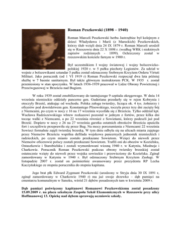 Roman Peszkowski (1898 – 1940) Roman Marceli Peszkowski herbu Jastrzębiec był kolejnym z dzieci Władysława i Marii (z Mareckich) Peszkowskich, którzy ślub wzięli dnia 24 IX 1879 r. Roman Marceli urodził się w Rzeszowie dnia 22 X 1898 r. (według WRK i niektórych zapisów rodzinnych - 1899). Ochrzczony został w rzeszowskim kościele farnym w 1900 r. Był uczestnikiem I wojny światowej i wojny bolszewickopolskiej 1920 r. w 5 pułku piechoty Legionów. Za udział w wojnie z bolszewikami sztandar 5 pułku został odznaczony Srebrnym Krzyżem Orderu Virtuti Militari. Jako porucznik (od 1 VI 1919 r) Roman Peszkowski rozpoczął dwa lata później służbę w 7 baonie sanitarnym. Był także głównym instruktorem PCK. W 1935 r. został przeniesiony w stan spoczynku. W latach 1936-1939 pracował w Lidze Obrony Powietrznej i Przeciwgazowej w Brześciu nad Bugiem. W roku 1939 został zmobilizowany do tamtejszego 9 szpitala okręgowego. W dniu 14 września niemieckie oddziały pancerne gen. Guderiana przedarły się w rejon Kobrynia i otoczyły Brześć, atakując od wschodu. Polska załoga twierdzy, licząca ok. 4 tys. żołnierzy i oficerów pod dowództwem gen. Konstantego Plisowskiego, toczyła przez trzy dni zacięty bój z Niemcami, po czym w nocy z 16 na 17 września wycofała się z Brześcia. Tylko oddział kpt. Wacława Radziszewskiego wbrew rozkazowi pozostał w jednym z fortów, przez kilka dni tocząc walki z Niemcami, a po 22 września również z Sowietami, którzy podeszli już pod Brześć. Dopiero w nocy z 26 na 27 września garstka ostatnich obrońców Brześcia opuściła fort i szczęśliwie przeprawiła się przez Bug. Na mocy porozumienia z Niemcami 22 września Sowieci formalnie zajęli twierdzę brzeską. W tym dniu odbyła się na ulicach miasta zajętego przez Niemców Brześciu wspólna defilada wojskowa pancernych jednostek niemieckich i radzieckich, po czym miasto zostało przekazane Sowietom. Wzięci do niewoli przez Niemców oficerowie polscy zostali przekazani Sowietom. Trafili oni do obozów w Kozielsku, Ostaszkowie i Starobielsku i zostali wymordowani wiosną 1940 r. w Katyniu, Miednoje i Charkowie. Porucznik Roman Peszkowski podczas obrony twierdzy brzeskiej został ostatecznie wzięty do niewoli przez wojska sowieckie i przewieziony do Kozielska. Zginął zamordowany w Katyniu w 1940 r. Był odznaczony Srebrnym Krzyżem Zasługi. W listopadzie 2007 r. został on pośmiertnie awansowany przez prezydenta RP Lecha Kaczyńskiego ze stopnia porucznika do stopnia kapitana. Jego brat płk Edward Zygmunt Peszkowski (urodzony w Stryju dnia 30 IX 1891 r, zginął zamordowany w Charkowie 1940 r) ma już swoje drzewko – dąb pamięci na cmentarzu komunalnym w Sanoku, wśród 21 dębów posadzonych tam w kwietniu 2009 r. Dąb pamięci poświęcony kapitanowi Romanowi Peszkowskiemu został posadzony 15.09.2009 r. na placu szkolnym Zespołu Szkół Ekonomicznych w Rzeszowie przy ulicy Hoffmanowej 13. Opiekę nad dębem sprawują uczniowie szkoły.