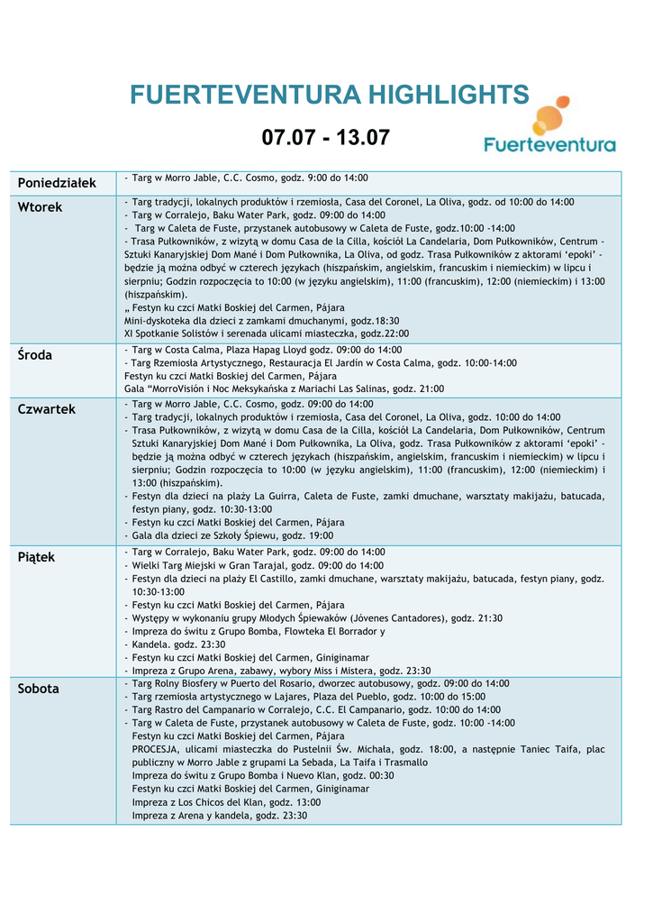 FUERTEVENTURA HIGHLIGHTS 07.07 - 13.07 Poniedziałek - Targ w Morro Jable, C.C. Cosmo, godz. 9:00 do 14:00 Wtorek - Targ tradycji, lokalnych produktów i rzemiosła, Casa del Coronel, La Oliva, godz. od 10:00 do 14:00 - Targ w Corralejo, Baku Water Park, godz. 09:00 do 14:00 - Targ w Caleta de Fuste, przystanek autobusowy w Caleta de Fuste, godz.10:00 -14:00 - Trasa Pułkowników, z wizytą w domu Casa de la Cilla, kościół La Candelaria, Dom Pułkowników, Centrum Sztuki Kanaryjskiej Dom Mané i Dom Pułkownika, La Oliva, od godz. Trasa Pułkowników z aktorami ‘epoki’ będzie ją można odbyć w czterech językach (hiszpańskim, angielskim, francuskim i niemieckim) w lipcu i sierpniu; Godzin rozpoczęcia to 10:00 (w języku angielskim), 11:00 (francuskim), 12:00 (niemieckim) i 13:00 (hiszpańskim). „ Festyn ku czci Matki Boskiej del Carmen, Pájara Mini-dyskoteka dla dzieci z zamkami dmuchanymi, godz.18:30 XI Spotkanie Solistów i serenada ulicami miasteczka, godz.22:00 Środa - Targ w Costa Calma, Plaza Hapag Lloyd godz. 09:00 do 14:00 - Targ Rzemiosła Artystycznego, Restauracja El Jardín w Costa Calma, godz. 10:00-14:00 Festyn ku czci Matki Boskiej del Carmen, Pájara Gala “MorroVisión i Noc Meksykańska z Mariachi Las Salinas, godz. 21:00 Czwartek - Targ w Morro Jable, C.C. Cosmo, godz. 09:00 do 14:00 - Targ tradycji, lokalnych produktów i rzemiosła, Casa del Coronel, La Oliva, godz. 10:00 do 14:00 - Trasa Pułkowników, z wizytą w domu Casa de la Cilla, kościół La Candelaria, Dom Pułkowników, Centrum Sztuki Kanaryjskiej Dom Mané i Dom Pułkownika, La Oliva, godz. Trasa Pułkowników z aktorami ‘epoki’ będzie ją można odbyć w czterech językach (hiszpańskim, angielskim, francuskim i niemieckim) w lipcu i sierpniu; Godzin rozpoczęcia to 10:00 (w języku angielskim), 11:00 (francuskim), 12:00 (niemieckim) i 13:00 (hiszpańskim). - Festyn dla dzieci na plaży La Guirra, Caleta de Fuste, zamki dmuchane, warsztaty makijażu, batucada, festyn piany, godz. 10:30-13:00 - Festyn ku czci Matki Boskiej del Carmen, Pájara - Gala dla dzieci ze Szkoły Śpiewu, godz. 19:00 Piątek - Targ w Corralejo, Baku Water Park, godz. 09:00 do 14:00 - Wielki Targ Miejski w Gran Tarajal, godz. 09:00 do 14:00 - Festyn dla dzieci na plaży El Castillo, zamki dmuchane, warsztaty makijażu, batucada, festyn piany, godz. 10:30-13:00 - Festyn ku czci Matki Boskiej del Carmen, Pájara - Występy w wykonaniu grupy Młodych Śpiewaków (Jóvenes Cantadores), godz. 21:30 - Impreza do świtu z Grupo Bomba, Flowteka El Borrador y - Kandela. godz. 23:30 - Festyn ku czci Matki Boskiej del Carmen, Giniginamar - Impreza z Grupo Arena, zabawy, wybory Miss i Mistera, godz. 23:30 - Targ Rolny Biosfery w Puerto del Rosario, dworzec autobusowy, godz. 09:00 do 14:00 - Targ rzemiosła artystycznego w Lajares, Plaza del Pueblo, godz. 10:00 do 15:00 - Targ Rastro del Campanario w Corralejo, C.C. El Campanario, godz. 10:00 do 14:00 - Targ w Caleta de Fuste, przystanek autobusowy w Caleta de Fuste, godz. 10:00 -14:00 Festyn ku czci Matki Boskiej del Carmen, Pájara PROCESJA, ulicami miasteczka do Pustelnii Św. Michała, godz. 18:00, a następnie Taniec Taifa, plac publiczny w Morro Jable z grupami La Sebada, La Taifa i Trasmallo Impreza do świtu z Grupo Bomba i Nuevo Klan, godz. 00:30 Festyn ku czci Matki Boskiej del Carmen, Giniginamar Impreza z Los Chicos del Klan, godz. 13:00 Impreza z Arena y kandela, godz. 23:30 Sobota Niedziela - Targ rzemiosła artystycznego Wysp kanaryjskich w Corralejo, C.C.El Campanario, godz. 10:00 do 14:00 Targ rolno-spożywczy w Fuerteventura Oasis Park (La Lajita) godz. 10:00 do 14:00 Targ Rzemiosła Artystycznego, Restauracja El Jardín w Costa Calma, godz. 10:00-14:00 Festyn ku czci Matki Boskiej del Carmen, Pájara Eucharystia i przeniesienie obrazu Matki Boskiej do Parafii, godz. 12:00 Tradycyjny grill Asadero marynarzy z imprezą Los Mantequillas oraz el Mariachi El Rosario, Avda. de Morro Jable, godz. 13:30 - Festyn ku czci Matki Boskiej del Carmen, Giniginamar - Grill na wolnym powietrzu Asadero popular, wermut do tańca, godz. 14:00 - Lekcja Zumby z Natalie Ortega, godz. 20:00