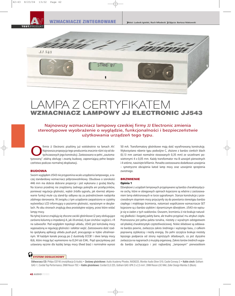 42-43 8/23/04 13:52 AV Page 42 WZMACNIACZE ZINTEGROWANE Tekst: Ludwik Igielski, Roch M∏odecki Zdj´cia: Bartosz Makowski TEST/PRODUKT LAMPA Z CERTYFIKATEM WZMACNIACZ LAMPOWY JJ ELECTRONIC JJ543 Najnowszy wzmacniacz lampowy czeskiej firmy JJ Electronic zmienia stereotypowe wyobra˝enie o wyglàdzie, funkcjonalnoÊci i bezpieczeƒstwie u˝ytkowania urzàdzeƒ tego typu. firmie JJ Electronic pisaliÊmy ju˝ wielokrotnie na ∏amach AV. Najnowsza propozycja tego producenta znacznie ró˝ni si´ od dotychczasowych jego konstrukcji. Zastosowano w pe∏ni „zautomatyzowanà” zdalnà obs∏ug´ i zwartà budow´, zapewniajàcà pe∏ne bezpieczeƒstwo podczas normalnej eksploatacji. O BUDOWA Swoim wyglàdem JJ543 nie przypomina wcale urzàdzenia lampowego, a raczej standardowy wzmacniacz pó∏przewodnikowy. Obudowa o szerokoÊci 446 mm ma dobrze dobrane proporcje i jest wykonana z grubej blachy. Na Êciance przedniej nie znajdziemy ˝adnego pokr´t∏a ani prze∏àczników, poniewa˝ regulacja g∏oÊnoÊci, wybór êród∏a sygna∏u, jak równie˝ aktywowanie funkcji mute czy stand-by odbywa si´ za poÊrednictwem nadajnika zdalnego sterowania. W zwiàzku z tym urzàdzenie zaopatrzono w czytelny wyÊwietlacz LCD informujàcy o poziomie g∏oÊnoÊci, wyra˝onym w decybelach. Po obu stronach znajdujà dwa prostokàtne wizjery, przez które widaç lampy mocy. Na tylnej Êciance znajdujà si´ z∏ocone zaciski g∏oÊnikowe (2 pary obs∏ugujàce zarówno kolumny o impedancji 4, jak i 8 omów), 6 par cinchów i wyjÊcie L+R na subwoofer. Pod wzgl´dem topologii uk∏adu, JJ543 jest koƒcówkà mocy wyposa˝onà w regulacj´ g∏oÊnoÊci i selektor wejÊç. Zastosowano doÊç rzadko spotykanà aplikacj´ uk∏adu push-pull, pracujàcego w trybie ultralinearnym. W ka˝dym kanale pracujà po 2 duotriody ECC81 i dwie lampy mocy 6L6, które mogà byç wymienione na EL34 lub E34L. Pràd spoczynkowy jest ustawiany r´cznie dla ka˝dej lampy mocy (fixed bias) i nominalnie wynosi 50 mA. Transformatory g∏oÊnikowe majà doÊç wyrafinowanà konstrukcj´. Wykorzystano rdzenie typu podwójne C, z∏o˝one z bardzo cienkich blach (0,13 mm zamiast normalnie stosowanych 0,35 mm) ze szczelinami powietrznymi 4 x 0,05 mm. Ka˝dy transformator ma 8 uzwojeƒ pierwotnych i 4 wtórne, nawini´te bifilarnie. Ponadto zastosowano dodatkowe uzwojenia – symetryczne obcià˝enia katod lamp mocy oraz uzwojenie sprz´˝enia zwrotnego. BRZMIENIE Opinia 1 Dêwi´kowi z urzàdzeƒ lampowych przypisywane sà bardzo charakterystyczne cechy, które w obiegowych opiniach kojarzone sà w∏aÊnie z zastosowaniem lamp elektronowych w torze sygna∏owym. Starsze konstrukcje z przeciwsobnym stopniem mocy przyczyni∏y si´ do powstania stereotypu bardzo ciep∏ego i mi´kkiego brzmienia, natomiast wspó∏czesne wzmacniacze SET kojarzone sà z bardzo szybkim i dynamicznym dêwi´kiem. JJ543 nie wpisuje si´ w ˝aden z tych szablonów. Owszem, brzmieniu JJ nie brakuje naturalnej g∏adkoÊci i bogatej palety barw, ale trudno przypisaç mu atrybut ciep∏a. Przenoszona jest pe∏na paleta tonalna, niestety z wyraênym odst´pstwem od p∏askiej charakterystyki cz´stotliwoÊciowej. Niskie sk∏adowe sà oddawane bardzo pewnie, zw∏aszcza zakres Êredniego i wy˝szego basu, z ca∏kiem poprawnà szybkoÊcià i niez∏à energià. Do pe∏ni szcz´Êcia brakuje niestety lepszego podparcia od strony najni˝szych sk∏adowych, co jest s∏yszalne zw∏aszcza na nagraniach z muzykà organowà. Zakres tonów Êrednich wypada bardzo zach´cajàco i jest najbardziej „lampowym” pierwiastkiem SYSTEM ODS¸UCHOWY Odtwarzacz CD: Philips CD740 (modyfikacja Q-Audio) • Zestawy g∏oÊnikowe: Audio Academy Phoebe, NAD8225, Monitor Audio Silver S10, Castle Conway 3 • Kable cinch: Gotham GAC-1, Cordial Top Performance, DNM Reson TSC • Kable g∏oÊnikowe: Cordial CLS 225, Gotham GAC-SPK 2 x 2,5 mm2, DNM Reson LSC MkII, Zoller Design Mamba 3 (Black) 42 AUDIOVIDEO 42-43 8/23/04 13:52 Page 43 AV TEST/PRODUKT w brzmieniu tego wzmacniacza. G∏osy wokalistów, charakter brzmienia niektórych instrumentów sà bliskie realizmowi. Pewne wàtpliwoÊci budzi po∏àczenie Êrednicy i sopranów, a dok∏adniej – spójnoÊci obydwu tych zakresów. Wyraênie s∏yszalne jest zaakcentowanie ni˝szego podzakresu sopranów, objawiajàce si´ w charakterystycznym ich podkreÊleniu. Na szcz´Êcie zjawisko to nie powoduje metalicznego nalotu ani nadmiernego wyostrzenia. Zjawiska przestrzenne koncentrujà si´ wokó∏ g∏oÊników z odpowiednià dozà powietrza. Scena dêwi´kowa ma w∏aÊciwà szerokoÊç i pu∏ap, ale o niezbyt wybudowanej g∏´bi. Walory dynamiczne wzmacniacza obejmujà zarówno mikro, jak i makroskal´. Niezb´dne okazujà si´ tutaj odpowiednie przewody g∏oÊnikowe – najlepiej typu solid-core. JJ543 dobrze radzi sobie z ró˝nicowaniem nagraƒ. Wed∏ug informacji uzyskanych od dystrybutora, zamiana lamp o mocy 6L6 na EL34 skutkuje odmiennym charakterem brzmienia (dêwi´k cieplejszy i s∏odszy). (LI) Opinia 2 Ws∏uchujàc si´ w brzmienie JJ 543, mo˝na doÊç ∏atwo w nim wychwyciç pewne w∏aÊciwoÊci uto˝samiane ze wzmacniaczami lampowymi. Pe∏na Êrednica, niez∏a dynamika i ciep∏e naloty w prezentacji barw trudno uzyskaç w równie wiarygodny sposób za pomocà technologii pó∏przewodnikowej. JJ doskonale przedstawia swe atuty, pokazuje g´ste i g∏´bokie barwy. Wybrzmienia sà dopracowane, a przy tym nie mo˝na im odmówiç naturalnoÊci. Mimo to, pod pewnymi wzgl´dami, JJ ust´puje swym konkurentom. Najwi´kszà niedoskona∏oÊcià prezentacji okaza∏y si´ wysokie tony. Odstajà jakoÊciowo od tego, co mo˝na us∏yszeç w Êrednim zakresie pasma. Od samego poczàtku ods∏uchów wyda∏y mi si´ zbyt narzucajàce, troch´ za bardzo suche i oderwane od reszty pasma. Wprowadzajà do prezentacji pewnà niestabilnoÊç i dyskomfort, naznaczajàc brzmienie nieprzyjemnà, szeleszczàcà nalecia∏