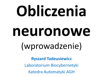 Obliczenia neuronowe (wprowadzenie) Ryszard Tadeusiewicz Laboratorium Biocybernetyki Katedra Automatyki AGH Dane reprezentujące zadanie do wykonania Wiedza zdobyta w czasie uczenia Oto przykładowa sieć neuronowa Wynik reprezentujący rozwiązanie zadania Zacznijmy jednak od formalnej definicji: • sieć neuronowa to urządzenie techniczne lub algorytm, którego działanie wzorowane jest w pewnym stopniu na działaniu sieci biologicznych struktur nerwowych. • Zazwyczaj składa się z systemu połączonych ze sobą elementów naśladujących biologiczne neurony, z których każdy posiada pewną liczbę wejść i jedno wyjście Wyjścia z poszczególnych elementów są na ogół połączone z wejściami innych tworząc sieć. Niektóre elementy wyprowadzają sygnały wyjściowe na zewnątrz i to one dostarczają odpowiedzi na zadanie, które rozwiązuje sieć. Inne elementy przyjmują na swych wejściach sygnały z zewnątrz i to właśnie one służą do stawiania zadań, które sieć ma rozwiązywać. Zależność pomiędzy wejściami i wyjściami jest modyfikowana dla każdego elementu z osobna w procesie tzw. uczenia sieci. Nauczona sieć przetwarza informację poprzez jej obróbkę głównie na złączach między elementami, tak zwanych synapsach. Pomocniczą rolę odgrywa generowanie sygnałów w poszczególnych elementach oraz ich przesyłanie pomiędzy elementami. Zależność pomiędzy sygnałami wejściowymi a wyjściowymi w całej sieci jest następnie interpretowana jako rozwiązanie postawionego sieci problemu. Wykład nie wyczerpie wszystkich zagadnień. Jak znaleźć książkę o sieciach neuronowych w wirtualnej bibliotece? http://abc.agh.edu.pl Dlaczego warto się interesować sieciami neuronowymi? Na jednej z pierwszych konferencji naukowych poświęconych sieciom neuronowym (w 1995 roku) jeden z amerykańskich badaczy pokazał taki slajd: Uznałem, że to dobry pomysł i spróbowałem kontynuować ten wykres Wielkość obrotów oprogramowaniem dla tworzenia sieci neuronowych (w mld USD) 200 150 100 2006 2005 2004 2003 2002 2001 2000 1999 1998 1997 1996 1995 1994 1993 1992 1991 0 1990 50 Jak widać idea obliczeń neuronowych staje się coraz popularniejsza Przykładowe narzędzia do budowy sieci neuronowych Zaletą sieci neuronowych jest to, że można do nich wprowadzać dowolne, nie uporządkowane dane, a po nauczeniu sieci na jej wyjściu dostaje się zwykle porządny i użyteczny wynik Nieznajomość reguł rządzących problemem Cechy charakterystyczne zadań, przy rozwiązywaniu których sieci neuronowe mają przewagę nad innymi technikami: Modele statystyczne Systemy ekspertowe Metody dedukcyjne Częściowy lub całkowity brak znajomości reguł Duża złożoność Dokładne Częściowa znajomość reguł Średnia złożoność algorytmy Pełna znajomość reguł Mała i średnia złożoność Sieci neuronowe Metody indukcyjne Stopień złożoności problemu Sieci neuronowe są narzędziem którego zakres zastosowań stale się poszerza. Należą do tego zakresu między innymi takie zadania, jak: • Tworzenie modeli złożonych systemów • Automatyczne metody przetwarzania, analizy i klasyfikacji złożonych sygnałów • Predykcja szeregów czasowych • i liczne, liczne inne... Czasopisma, w których obecnie można znaleźć najnowsze i najwartościowsze wiadomości dotyczące sieci neuronowych Obydwa te pisma są wydawane w USA, ale ja jestem członkiem redakcji w obu tych periodykach Zasadnicze zalety, warunkujące używanie sieci neuronowych są następujące: • Brak konieczności jawnego formułowania jakichkolwiek założeń dla modeli • Możliwość rozwiązywania problemów nie mających dobrej definicji formalnej • Możliwość zastępowania procesu programowania oraz „ręcznego” tworzenia modelu - procesem uczenia sieci • Możliwość pracy współbieżnej Do realizacji współbieżnych obliczeń w dużych sieciach neuronowych stosuje się dziś specjalne systemy mikroelektroniczne oraz klastry komputerowe HAGEN - The Heidelberg AnaloG Evolvable Neural Network Szczegóły rozwiązania technicznego The EvoOpt Mixed-Signal Neural Network Chip Nad strukturami neuronowymi pracują największe firmy hardware’owe Schemat funkcjonalny neuronowego chipu Intela Linux cluster CCortex with 1,000 processors for modeling of neural system with 20 billion neurons and 20 trillion connections. Parameters: 1 terabyte of RAM, and 200 terabytes of storage Sieci neuronowe są wzorowane na faktach, które udało się ustalić w trakcie wieloletnich badań ludzkiego mózgu Dlatego o sieciach neuronowych często mówi się: Neurokomputery Ta nazwa jest ze wszech miar uzasadniona, ponieważ w systemach tych często sprzęga się bezpośrednio elementy elektroniczne z żywymi neuronami Najczęściej jednak sieci neuronowe wykonywane są jako programy symulujące ich funkcjonowanie w zwykłych komputerach Mam program, więc działam jak sieć neuronowa Mogę wykonywać wszelkie obliczenia tak jakbym miał specjalnie zbudowaną sieć! Przykład programu symulującego sieci neuronowe Jak jest zbudowana i jak działa sieć neuronowa? Twórcy sieci neuronowych wykorzystują wiedzę neuroanatomiczną i neurofizjologiczną, ale modelują rzeczywiste struktury nerwowe w sposób maksymalnie uproszczony Początkowo anatomowie dzielili mózg tak, jak kolonizatorzy Afrykę – według arbitralnie wyznaczanych granic, bez zwracania uwagi na to, co było w środku Potem zaczęto nieco subtelniej wyodrębniać anatomiczne elementy mózgu Mózg widziany od podstawy Przedstawione wyżej obszary były wyodrębnione na podstawie obserwacji i analizy zewnętrznej budowy mózgu. Natomiast jeszcze w ostatnich latach XIX wieku podjęto próby określenia struktury mózgu na poziomie budowy elementów wewnętrznych czyli komórek i ich połączeń. W efekcie tych prac powstała cytoarchitektoniczna mapa Brodmana Ludzie już dawno poznali i opisali strukturę mózgu, jednak przez 