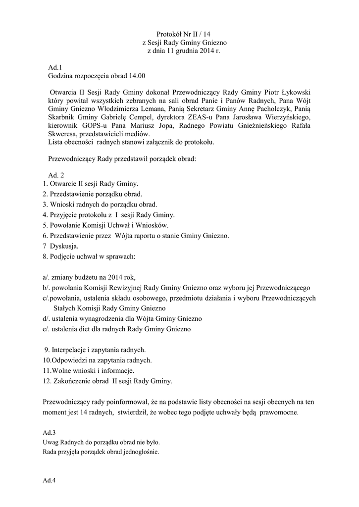 Protokół Nr II / 14 z Sesji Rady Gminy Gniezno z dnia 11 grudnia