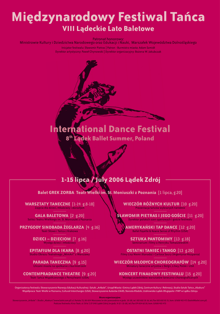 Międzynarodowy Festiwal Tańca VIII Lądeckie Lato Baletowe Patronat atronat honorowy: Ministrowie Kultury i Dziedzictwa Narodowego oraz Edukacji i Nauki, Marszałek Województwa Dolnośląskiego Inicjator festiwalu: Sławomir Pietras | Patron - Burmistrz miasta: Adam Szmidt Dyrektor artystyczny: Paweł Chynowski | Dyrektor organizacyjny: Bożena ena W. Jakubczak International Dance Festival 8 Lądek Ballet Summer, Poland th 1-15 lipca / July 2006 Lądek Zdrój Balet GREK ZORBA Teatr Wielki im. St. Moniuszki z Poznania [1 lipca, g.20] WARSZTATY TANECZNE [1-14 g.8-18] WIECZÓR RÓŻNYCH KULTUR [10 g.20] _____________ _____________ Zajęcia cia dla dzieci, młodzieży m i dorosłych Prezentacja tańców w wybranych narodów narod GALA BALETOWA [2 g.20] SŁAWOMIR PIETRAS I JEGO GOŚCIE [11 g.20] _____________ _____________ Soliści Teatru Wielkiego im. St. Moniuszki z Poznania Dyrektor polskich scen operowych i goście go festiwalu PRZYGODY SINDBADA ŻEGLARZA [4 g.16] AMERYKAŃSKI TAP DANCE [12 g.20] _____________ _____________ Teatr Słowa i Tańca z Krakowa Ballet Fayette & Keane Sense of Rhythm (USA) DZIECI – DZIECIOM [7 g.16] SZTUKA PANTOMIMY [13 g.18] _____________ _____________ Występ dzieci i młodzieży Seminarium i filmy o Henryku Tomaszewskim EPITAFIUM DLA IKARA [8 g.20] OSTATNI TANIEC i TANGO [13 g.20] Studio Obrazu Teatralnego „MimArt” z Warszawy Filmy Lisy Niemi (Kanada) i Carlosa Saury (Argentyna-Hiszpania) PARADA TANECZNA [9 g.15] WIECZÓR MŁODYCH CHOREOGRAFÓW [14 g.20] _____________ _____________ _____________ Ulicami miasta na spotkanie z burmistrzem CONTEMPRADANCE THEATRE [9 g.20] Teatr Ta T ńca Współczesnego z Pensylwanii (USA) _____________ Miniatury taneczne artystów z Belgii, Litwy, Polski i USA KONCERT FINAŁOWY FESTIWALU [15 g.20] Występ uczestników warsztatów taneczno-choreograficznych Organizatorzy festiwalu: Stowarzyszenie Rozwoju Edukacji Kulturalnej i Sztuki „Artbale”, Urząd Miasta i Gminy Lądek Zdrój, Centrum Kultury i Rekreacji, Studio Sztuki Tańca „Abakurs” Współpraca: Teatr Wielki w Poznaniu, Cultural Interchanges (USA), Stowarzyszenie Autorów ZAiKS, Starosta Kłodzki, Uzdrowisko Lądek-Długopole i FWP w Lądku Zdroju Biuro organizacyjne: Stowarzyszenie „Artbale” i Studio „Abakurs”(www.balet.com.pl) ul. Pańska 73, 00-834 Warszawa (w dni powszednie w godz. 10-18), tel. 022 652 35 16, tel./fax 022 652 03 31, kom. 0/608 403 473 ([email protected]). Podczas festiwalu: Kino-Teatr, ul. Orla 7, 57-540 Lądek Zdrój (w godz. 9-12 i 15-18), tel./fax 074 814 62 20, kom. 0/608 403 473