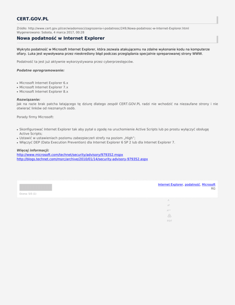 CERT.GOV.PL Źródło: http://www.cert.gov.pl/cer/wiadomosci/zagrozenia-i-podatnosc/249,Nowa-podatnosc-w-Internet-Explorer.html Wygenerowano: Sobota, 4 marca 2017, 00:28 Nowa podatność w Internet Explorer Wykryto podatność w Microsoft Internet Explorer, która zezwala atakującemu na zdalne wykonanie kodu na komputerze ofiary. Luka jest wywoływana przez nieokreślony błąd podczas przeglądania specjalnie spreparowanej strony WWW. Podatność ta jest już aktywnie wykorzystywana przez cyberprzestępców. Podatne oprogramowanie: ● ● ● Microsoft Internet Explorer 6.x Microsoft Internet Explorer 7.x Microsoft Internet Explorer 8.x Rozwiązanie: Jak na razie brak patcha łatającego tę dziurę dlatego zespół CERT.GOV.PL radzi nie wchodzić na niezaufane strony i nie otwierać linków od nieznanych osób. Porady firmy Microsoft: ● ● ● Skonfigurować Internet Explorer tak aby pytał o zgodę na uruchomienie Active Scripts lub po prostu wyłączyć obsługę Active Scripts; Ustawić w ustawieniach poziomu zabezpieczeń strefy na poziom „High”; Włączyć DEP (Data Execution Prevention) dla Internet Explorer 6 SP 2 lub dla Internet Explorer 7. Więcej informacji: http://www.microsoft.com/technet/security/advisory/979352.mspx http://blogs.technet.com/msrc/archive/2010/01/14/security-advisory-979352.aspx Internet Explorer, podatność, Microsoft RG Ocena: 5/5 (1)