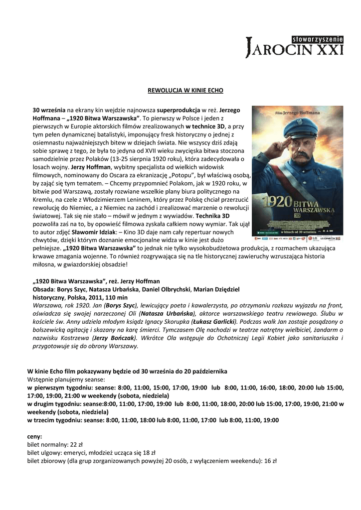 REWOLUCJA W KINIE ECHO 30 września na ekrany kin wejdzie najnowsza superprodukcja w reż. Jerzego Hoffmana – „1920 Bitwa Warszawska”. To pierwszy w Polsce i jeden z pierwszych w Europie aktorskich filmów zrealizowanych w technice 3D, a przy tym pełen dynamicznej batalistyki, imponujący fresk historyczny o jednej z osiemnastu najważniejszych bitew w dziejach świata. Nie wszyscy dziś zdają sobie sprawę z tego, że była to jedyna od XVII wieku zwycięska bitwa stoczona samodzielnie przez Polaków (13-25 sierpnia 1920 roku), która zadecydowała o losach wojny. Jerzy Hoffman, wybitny specjalista od wielkich widowisk filmowych, nominowany do Oscara za ekranizację „Potopu”, był właściwą osobą, by zająć się tym tematem. – Chcemy przypomnieć Polakom, jak w 1920 roku, w bitwie pod Warszawą, zostały rozwiane wszelkie plany biura politycznego na Kremlu, na czele z Włodzimierzem Leninem, który przez Polskę chciał przerzucić rewolucję do Niemiec, a z Niemiec na zachód i zrealizować marzenie o rewolucji światowej. Tak się nie stało – mówił w jednym z wywiadów. Technika 3D pozwoliła zaś na to, by opowieść filmowa zyskała całkiem nowy wymiar. Tak ujął to autor zdjęć Sławomir Idziak: – Kino 3D daje nam cały repertuar nowych chwytów, dzięki którym doznanie emocjonalne widza w kinie jest dużo pełniejsze. „1920 Bitwa Warszawska” to jednak nie tylko wysokobudżetowa produkcja, z rozmachem ukazująca krwawe zmagania wojenne. To również rozgrywająca się na tle historycznej zawieruchy wzruszająca historia miłosna, w gwiazdorskiej obsadzie! „1920 Bitwa Warszawska”, reż. Jerzy Hoffman Obsada: Borys Szyc, Natasza Urbańska, Daniel Olbrychski, Marian Dziędziel historyczny, Polska, 2011, 110 min Warszawa, rok 1920. Jan (Borys Szyc), lewicujący poeta i kawalerzysta, po otrzymaniu rozkazu wyjazdu na front, oświadcza się swojej narzeczonej Oli (Natasza Urbańska), aktorce warszawskiego teatru rewiowego. Ślubu w kościele św. Anny udziela młodym ksiądz Ignacy Skorupka (Łukasz Garlicki). Podczas walk Jan zostaje posądzony o bolszewicką agitację i skazany na karę śmierci. Tymczasem Olę nachodzi w teatrze natrętny wielbiciel, żandarm o nazwisku Kostrzewa (Jerzy Bończak). Wkrótce Ola wstępuje do Ochotniczej Legii Kobiet jako sanitariuszka i przygotowuje się do obrony Warszawy. W kinie Echo film pokazywany będzie od 30 września do 20 października Wstępnie planujemy seanse: w pierwszym tygodniu: seanse: 8:00, 11:00, 15:00, 17:00, 19:00 lub 8:00, 11:00, 16:00, 18:00, 20:00 lub 15:00, 17:00, 19:00, 21:00 w weekendy (sobota, niedziela) w drugim tygodniu: seanse:8:00, 11:00, 17:00, 19:00 lub 8:00, 11:00, 18:00, 20:00 lub 15:00, 17:00, 19:00, 21:00 w weekendy (sobota, niedziela) w trzecim tygodniu: seanse: 8:00, 11:00, 18:00 lub 8:00, 11:00, 17:00 lub 8:00, 11:00, 19:00 ceny: bilet normalny: 22 zł bilet ulgowy: emeryci, młodzież ucząca się 18 zł bilet zbiorowy (dla grup zorganizowanych powyżej 20 osób, z wyłączeniem weekendu): 16 zł