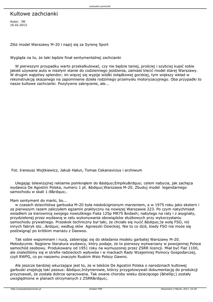 autosalon pomorski Kultowe zachcianki Autor: IW 16.02.2013. Złóż model Warszawy M-20 i napij się za Syrenę Sport Wygląda na to, że taki będzie finał sentymentalnej zachcianki W pierwszym przypadku warto przekalkulować, czy nie będzie taniej, prościej i szybciej kupić sobie jakieś używane auto w niezłym stanie do codziennego jeżdżenia, zamiast klecić model starej Warszawy. W drugim wątpliwy splendor; im więcej się wypije wódki żołądkowej gorzkiej, tym większy wkład w rekonstrukcję skazanego na zapomnienie dzieła rodzimego przemysłu motoryzacyjnego. Oba przypadki to nasze kultowe zachcianki. Pozytywne zakręcenie, ale... Fot. Ireneusz Wojtkiewicz, Jakub Hałun, Tomas Cekanavicius i archiwum Ulegając telewizyjnej reklamie pomknąłem do „Empiku” celem nabycia, jak zachęca wydawca De Agostini Polska, numeru 1 pt. „Warszawa M-20. Zbuduj model legendarnego samochodu w skali 1:8”. Mam sentyment do marki, bo... w czasach dzieciństwa garbuska M-20 była niedoścignionym marzeniem, a w 1975 roku jako ekstern i za pierwszym razem zaliczyłem egzamin praktyczny na nowszej Warszawie 223. Po czym natychmiast wsiadłem za kierownicę swojego nowiutkiego Fiata 125p MR75 – nabytego na raty i z asygnaty, przydzielonej przez wydawcę w celu wykonywania obowiązków służbowych przy wykorzystaniu samochodu prywatnego. Przeskok techniczny był taki, że chciało się nucić „Ja wolę FSO, niż innych fabryk sto...” według słów Agnieszki Osieckiej. Nie to co dziś, kiedy FSO nie może się podźwignąć po krótkim mariażu z Daewoo. Tak sobie wspominam i nucę, zabierając się do składania modelu garbatej Warszawy M-20. Metodycznie. Najpierw literatura wydawcy, który podaje, że to pierwszy wytwarzany w powojennej Polsce samochód osobowy. Produkowany od 1951 roku na wymuszonej przez ZSRR licencji. Miał być Fiat 1100, ale znaleźliśmy się w strefie radzieckich wpływów i w mackach Rady Wzajemnej Pomocy Gospodarczej, czyli RWPG, co po naszemu znaczyło Ruskim Wsio Polszy Gawno. Ale jeszcze bardziej wkurzające jest to, że w tekście De Agostini Polska o narodzinach kultowej garbuski znajduję taki passus: „Inżynierowie, którzy przygotowywali dokumentację do produkcji przyznawali, że została dobrze opracowana. Tak zwane choroby wieku dziecięcego (…) zostały uwzględnione w planach otrzymanych z ZSRR”. http://autosalonpomorski.pl Kreator PDF Utworzono 3 March, 2017, 23:29 autosalon pomorski Tacy geniusze ci Ruscy, tylko że Warszawa M-20 to licencyjna Pobieda, a ta ma bogaty rodowód amerykański, wszak jej pierwowzorem była konstrukcja Forda z lat 30. minionego wieku. Silnik też był od Forda. Brakuje tej istotnej wzmianki. Szkoda, że wydawca modelu Warszawy nie sięgnął do monografii „Jest u nas fabryka w Warszawie. Opowieść o FSO 1951 – 1996”. „Kitajcy to sdiełali” - mogliby dziś powiedzieć rosyjscy licencjodawcy o modelu Warszawy M-20 do składania. W istocie, z opakowania też się dowiemy, że to chiński wyrób, jakich już wiele na naszym rynku. Może warto, bo tanio? A gdzież tam: 4,90 zł kosztuje pierwszy numer z maską i jest to cena promocyjna. Numer drugi będzie za 14,90 zł, a kolejne po 29,90 zł w kiosku lub 24,50 zł w prenumeracie. O tym dowiecie się już po rozpakowaniu pierwszego numeru. Co ważne, na opakowaniu drobnym druczkiem napisano, że przewidywana długość kolekcji to 100 numerów. Mają się ukazywać co tydzień. Łatwo więc policzyć, że składanie modelu garbuski potrwa ponad dwa lata i będzie kosztowało 2.500 – 3.000 zł. Za tyle możemy choćby zaraz sprawić sobie kilkunastoletnie auto każdej marki świata, którym pojeździmy parę dobrych lat. Ba, za 3.000 zł możemy mieć prawdziwą Warszawę M-20 z 1954 roku po renowacji. Jak nie wierzycie, to poszperajcie np. w otoMoto. Powiedzmy jednak, że samochodowy modelarz pasjonat to taki pozytywnie nakręcony świr, który nie przelicza czasu i mitręgi na pieniądze. Oczami wyobraźni już widzi to swoje dzieło o ponad półmetrowej długości, które za dwa lata zajmie mu kawał powierzchni mieszkalnej. Wczuwając się w jego rolę składam do kupy maskę modelu, co polega na zamocowaniu czterech ozdobnych emblematów. Chińska tandeta, bez mocnego kleju się nie obędzie. Tym bardziej, że odpadają napisy i druciana podpórka tego silnikowego dekla. I sam się czuję jak... dekiel, skołowany przez speca od kręcenia lodów na chińszczyźnie. Zanosi się na to, że wydam najwyżej 100 zł na inny, przyzwoicie wykonany model Warszawy M-20, skoro sentyment nie daje mi spokoju. Cel uświęca środki, chociaż... w tym przypadku lepiej mieć w pamięci znakomity film „Żółty szalik” z Januszem Gajosem w roli głównej. Zwłaszcza ze scenami alkoholowego odlotu po trzech flaszkach wódki żołądkowej gorzkiej. Bo ze sprzedaży tej gorzały sponsorowano rekonstrukcję prototypowej Syreny Sport, skazanej w PRL-u na zniszczenie i zapomnienie. Cofnijmy się do przełomu lat 50. - 60., gdy FSO rozwijała produkcję Warszaw. Równolegle wytwarzano już Syreny, dzięki którym fabryka nie musiała wykorzystywać wolnych mocy do produkcji maszynek do mielenia mięsa, czy osi do kombajnów żniwnych Vistula. Największą bodaj sensację wywołało pojawienie się na ulicach prototypu Syreny Sport, zbudowanego w FSO w 1960 r. To dwudrzwiowe coupe, którego projektanci inspirowali się wyglądem Ferrari i Mercedesa 190 SL, uchodzi do dziś za najbardziej urodziwy pod względem stylistycznym wytwór polskiego przemysłu motoryzacyjnego. Niestety, na prototypie się skończyło. Wylądował w magazynie, gdzie w 1978 r. został komisyjnie zniszczony wraz z wieloma innymi prototypami FSO. Podejmowano niejednokrotnie próby zrekonstruowania Syreny Sport. Budowa repliki, sponsorowana przez producenta wspomnianej gorzałki, udała się inż. Mirosławowi Mazurowi spod Lublina. Auto publicznie zademonstrowano w 2012 r., min. podczas R
