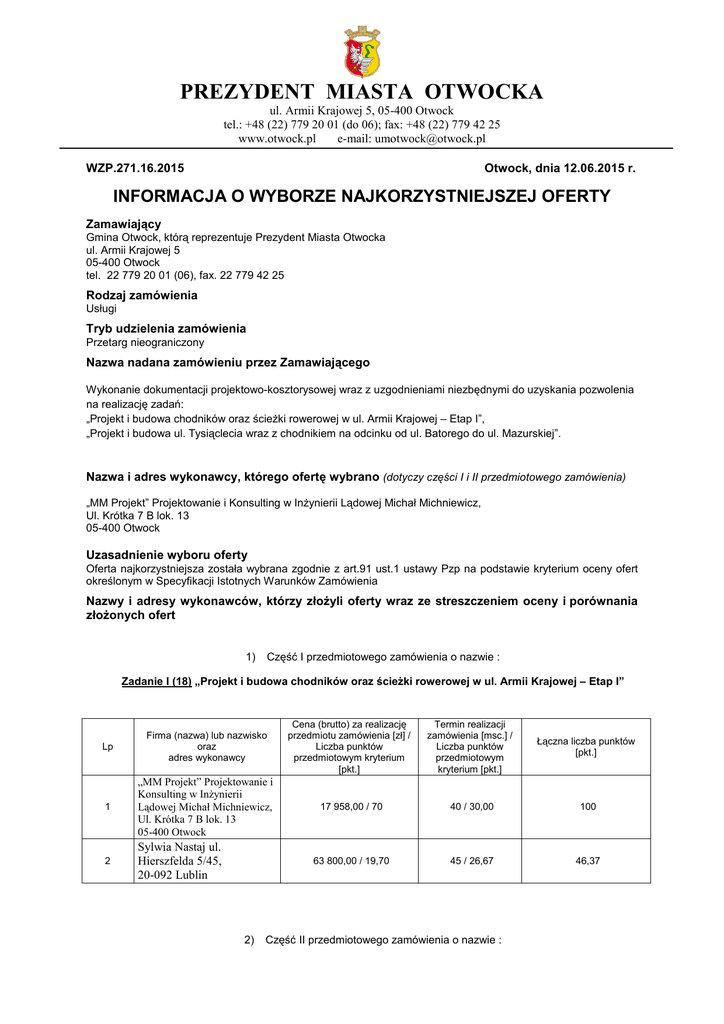 PREZYDENT MIASTA OTWOCKA ul. Armii Krajowej 5, 05-400 Otwock tel.: +48 (22) 779 20 01 (do 06); fax: +48 (22) 779 42 25 www.otwock.pl e-mail: [email protected] WZP.271.16.2015 Otwock, dnia 12.06.2015 r. INFORMACJA O WYBORZE NAJKORZYSTNIEJSZEJ OFERTY Zamawiający Gmina Otwock, którą reprezentuje Prezydent Miasta Otwocka ul. Armii Krajowej 5 05-400 Otwock tel. 22 779 20 01 (06), fax. 22 779 42 25 Rodzaj zamówienia Usługi Tryb udzielenia zamówienia Przetarg nieograniczony Nazwa nadana zamówieniu przez Zamawiającego Wykonanie dokumentacji projektowo-kosztorysowej wraz z uzgodnieniami niezbędnymi do uzyskania pozwolenia na realizację zadań: „Projekt i budowa chodników oraz ścieŜki rowerowej w ul. Armii Krajowej – Etap I”, „Projekt i budowa ul. Tysiąclecia wraz z chodnikiem na odcinku od ul. Batorego do ul. Mazurskiej”. Nazwa i adres wykonawcy, którego ofertę wybrano (dotyczy części I i II przedmiotowego zamówienia) „MM Projekt” Projektowanie i Konsulting w InŜynierii Lądowej Michał Michniewicz, Ul. Krótka 7 B lok. 13 05-400 Otwock Uzasadnienie wyboru oferty Oferta najkorzystniejsza została wybrana zgodnie z art.91 ust.1 ustawy Pzp na podstawie kryterium oceny ofert określonym w Specyfikacji Istotnych Warunków Zamówienia Nazwy i adresy wykonawców, którzy złoŜyli oferty wraz ze streszczeniem oceny i porównania złoŜonych ofert 1) Część I przedmiotowego zamówienia o nazwie : Zadanie I (18) „Projekt i budowa chodników oraz ścieŜki rowerowej w ul. Armii Krajowej – Etap I” Lp Firma (nazwa) lub nazwisko oraz adres wykonawcy Cena (brutto) za realizację przedmiotu zamówienia [zł] / Liczba punktów przedmiotowym kryterium [pkt.] Termin realizacji zamówienia [msc.] / Liczba punktów przedmiotowym kryterium [pkt.] Łączna liczba punktów [pkt.] 1 „MM Projekt” Projektowanie i Konsulting w InŜynierii Lądowej Michał Michniewicz, Ul. Krótka 7 B lok. 13 05-400 Otwock 17 958,00 / 70 40 / 30,00 100 2 Sylwia Nastaj ul. Hierszfelda 5/45, 20-092 Lublin 63 800,00 / 19,70 45 / 26,67 46,37 2) Część II przedmiotowego zamówienia o nazwie : Zadanie II (43) „Projekt i budowa ul. Tysiąclecia wraz z chodnikiem na odcinku od ul. Batorego do ul. Mazurskiej” Lp Firma (nazwa) lub nazwisko oraz adres wykonawcy Cena (brutto) za realizację przedmiotu zamówienia [zł] / Liczba punktów przedmiotowym kryterium [pkt.] Termin realizacji zamówienia [dni] / Liczba punktów przedmiotowym kryterium [pkt.] Łączna liczba punktów [pkt.] 1 „MM Projekt” Projektowanie i Konsulting w InŜynierii Lądowej Michał Michniewicz, Ul. Krótka 7 B lok. 13 05-400 Otwock 56 580,00 / 70 40 / 30 100 2 Sylwia Nastaj ul. Hierszfelda 5/45, 20-092 Lublin 68 800,00 / 57,57 45 / 26,67 83,83