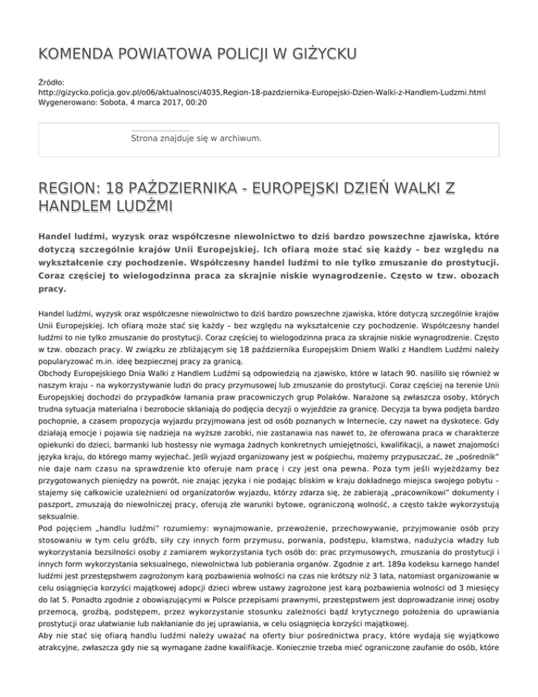 KOMENDA POWIATOWA POLICJI W GIŻYCKU Źródło: http://gizycko.policja.gov.pl/o06/aktualnosci/4035,Region-18-pazdziernika-Europejski-Dzien-Walki-z-Handlem-Ludzmi.html Wygenerowano: Sobota, 4 marca 2017, 00:20 Strona znajduje się w archiwum. REGION: 18 PAŹDZIERNIKA - EUROPEJSKI DZIEŃ WALKI Z HANDLEM LUDŹMI Handel ludźmi, wyzysk oraz współczesne niewolnictwo to dziś bardzo powszechne zjawiska, które dotyczą szczególnie krajów Unii Europejskiej. Ich ofiarą może stać się każdy – bez względu na wykształcenie czy pochodzenie. Współczesny handel ludźmi to nie tylko zmuszanie do prostytucji. Coraz częściej to wielogodzinna praca za skrajnie niskie wynagrodzenie. Często w tzw. obozach pracy. Handel ludźmi, wyzysk oraz współczesne niewolnictwo to dziś bardzo powszechne zjawiska, które dotyczą szczególnie krajów Unii Europejskiej. Ich ofiarą może stać się każdy – bez względu na wykształcenie czy pochodzenie. Współczesny handel ludźmi to nie tylko zmuszanie do prostytucji. Coraz częściej to wielogodzinna praca za skrajnie niskie wynagrodzenie. Często w tzw. obozach pracy. W związku ze zbliżającym się 18 października Europejskim Dniem Walki z Handlem Ludźmi należy popularyzować m.in. ideę bezpiecznej pracy za granicą. Obchody Europejskiego Dnia Walki z Handlem Ludźmi są odpowiedzią na zjawisko, które w latach 90. nasiliło się również w naszym kraju – na wykorzystywanie ludzi do pracy przymusowej lub zmuszanie do prostytucji. Coraz częściej na terenie Unii Europejskiej dochodzi do przypadków łamania praw pracowniczych grup Polaków. Narażone są zwłaszcza osoby, których trudna sytuacja materialna i bezrobocie skłaniają do podjęcia decyzji o wyjeździe za granicę. Decyzja ta bywa podjęta bardzo pochopnie, a czasem propozycja wyjazdu przyjmowana jest od osób poznanych w Internecie, czy nawet na dyskotece. Gdy działają emocje i pojawia się nadzieja na wyższe zarobki, nie zastanawia nas nawet to, że oferowana praca w charakterze opiekunki do dzieci, barmanki lub hostessy nie wymaga żadnych konkretnych umiejętności, kwalifikacji, a nawet znajomości języka kraju, do którego mamy wyjechać. Jeśli wyjazd organizowany jest w pośpiechu, możemy przypuszczać, że „pośrednik” nie daje nam czasu na sprawdzenie kto oferuje nam pracę i czy jest ona pewna. Poza tym jeśli wyjeżdżamy bez przygotowanych pieniędzy na powrót, nie znając języka i nie podając bliskim w kraju dokładnego miejsca swojego pobytu – stajemy się całkowicie uzależnieni od organizatorów wyjazdu, którzy zdarza się, że zabierają „pracownikowi” dokumenty i paszport, zmuszają do niewolniczej pracy, oferują złe warunki bytowe, ograniczoną wolność, a często także wykorzystują seksualnie. Pod pojęciem „handlu ludźmi” rozumiemy: wynajmowanie, przewożenie, przechowywanie, przyjmowanie osób przy stosowaniu w tym celu gróźb, siły czy innych form przymusu, porwania, podstępu, kłamstwa, nadużycia władzy lub wykorzystania bezsilności osoby z zamiarem wykorzystania tych osób do: prac przymusowych, zmuszania do prostytucji i innych form wykorzystania seksualnego, niewolnictwa lub pobierania organów. Zgodnie z art. 189a kodeksu karnego handel ludźmi jest przestępstwem zagrożonym karą pozbawienia wolności na czas nie krótszy niż 3 lata, natomiast organizowanie w celu osiągnięcia korzyści majątkowej adopcji dzieci wbrew ustawy zagrożone jest karą pozbawienia wolności od 3 miesięcy do lat 5. Ponadto zgodnie z obowiązującymi w Polsce przepisami prawnymi, przestępstwem jest doprowadzanie innej osoby przemocą, groźbą, podstępem, przez wykorzystanie stosunku zależności bądź krytycznego położenia do uprawiania prostytucji oraz ułatwianie lub nakłanianie do jej uprawiania, w celu osiągnięcia korzyści majątkowej. Aby nie stać się ofiarą handlu ludźmi należy uważać na oferty biur pośrednictwa pracy, które wydają się wyjątkowo atrakcyjne, zwłaszcza gdy nie są wymagane żadne kwalifikacje. Koniecznie trzeba mieć ograniczone zaufanie do osób, które zapewniają nam natychmiastową pomoc w zorganizowaniu wyjazdu za granicę. Policjanci radzą! Jeśli planujesz podjąć pracę za granicą, przestrzegaj poniższych zasad: Nie przyjmuj ofert pracy od osób, których nie znasz lub znasz słabo i krótko – jeśli planujesz podjęcie pracy za granicą, skorzystaj z pomocy urzędu pracy lub profesjonalnego, legalnie działającego pośrednika. Dowiedz się, w jaki sposób może pomóc Ci pośrednik w sytuacji, gdy warunki pracy okażą się inne niż zapowiadano, jeśli pracodawca nie wywiązuje się z umowy – poproś pośrednika o zapewnienie na piśmie o takiej pomocy. Upewnij się, że firma lub osoba oferująca pracę istnieje. W tym celu ustal jej adres, telefon i koniecznie skontaktuj się z przedstawicielem tej firmy/ z tą osobą. Uważnie czytaj dokumenty, które pokazuje Ci pośrednik, w szczególności te, które wymagają Twojego podpisu. O wszystkie wątpliwości pytaj pośrednika i nigdy nie podpisuj dokumentu, którego treści nie rozumiesz! Zbierz informacje o kraju, do którego wyjeżdżasz – dowiedz się np. jak regulowane jest zatrudnianie obcokrajowców, zwłaszcza poza Unią Europejską. Zanotuj i zabierz ze sobą adres i numer telefonu najbliższego polskiego konsulatu w kraju, do którego wyjeżdżasz. Dopełnij wszystkich formalności, m.in. sprawdź ważność swoich dokumentów jeśli wyjeżdżasz na ich podstawie, przygotuj wszystkie dokumenty konieczne do podjęcia pracy (np. poświadczenia kwalifikacji zawodowych) oraz ubezpiecz się (od następstw nieszczęśliwych wypadków i ewentualnych kosztów leczenia). Zrób kserokopie dokumentów, które ze sobą zabierasz, tj. paszportu, dowodu osobistego, wiz, pozwolenia na pracę, umowy o pracę. Kserokopie te zostaw osobom bliskim, które zostają w kraju. Zostaw bliskim adres, pod którym będziesz przebywa
