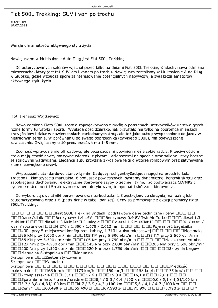 autosalon pomorski Fiat 500L Trekking: SUV i van po trochu Autor: IW 19.07.2013. Wersja dla amatorów aktywnego stylu życia Nowicjuszem w Multisalonie Auto Diug jest Fiat 500L Trekking Do autoryzowanych salonów wjechał przed kilkoma dniami Fiat 500L Trekking – nowa odmiana mieszczucha, który jest też SUV-em i vanem po trochu. Nowicjusza zastaliśmy w Mulitsalonie Auto Diug w Słupsku, gdzie wzbudza spore zainteresowanie potencjalnych nabywców, a zwłaszcza amatorów aktywnego stylu życia. Fot. Ireneusz Wojtkiewicz Nowa odmiana Fiata 500L została zaprojektowana z myślą o potrzebach użytkowników uprawiających różne formy turystyki i sportu. Wygląda dość dziarsko, jak przystało nie tylko na pogromcę miejskich krawężników i dziur w nawierzchniach zaniedbanych dróg, ale też jako auto przysposobione do jazdy w nietrudnym terenie. W porównaniu do swego poprzednika (zwykłego 500L), ma podwyższone zawieszenie. Zwiększony o 10 proc. prześwit ma 145 mm. Zdolność wprawdzie nie offroadowa, ale poza szosami powinien nieźle sobie radzić. Przeciwnościom czoła mają stawić nowe, masywne zderzaki z płytami osłonowymi na spodzie oraz solidne listwy boczne ze stalowymi wstawkami. Elegancji autu przydają 17-calowe felgi o wzorze rombowym oraz satynowane klamki zewnętrzne drzwi. Wyposażenie standardowe stanowią min. „inteligentny” napęd na przednie koła Traction+, klimatyzacja manualna, 6 poduszek powietrznych, systemy dynamicznej kontroli skrętu oraz zapobiegania dachowaniu, elektrycznie sterowane szyby przednie i tylne, radioodtwarzacz CD/MP3 z systemem Uconnect i 5-calowym ekranem dotykowym, tempomat i skórzana kierownica. Do wyboru są dwa silniki benzynowe oraz turbodiesle: 1.3 zestrojony ze skrzynią manualną lub zautomatyzowaną oraz 1.6 (patrz dane w tabeli poniżej). Ceny są promocyjne z okazji premiery Fiata 500L Trekking. Fiat 500L Trekking – podstawowe dane techniczne i ceny Dane /silnik Benzynowy 1.4 16V Benzynowy 0.9 8V TwinAir Turbo T.diesel 1.3 MultiJet II T.diesel 1.3 MultiJet II Dualogic T.diesel 1.6 MultiJet II Dł. / szer. / wys. / rozstaw osi 4.270 / 1.800 / 1.679 / 2.612 mm Pojemność bagażnika 400 l przy 5-miejscowej konfiguracji kabiny, 1.310 l w dwumiejscowej Moc maks. 95 KM przy 6.000 obr./min 105 KM przy 5.500 obr./min 85 KM przy 3.500 obr./min 85 KM przy 3.500 obr./min 105 KM przy 3.750 obr./min Maks. moment obr. 127 Nm przy 4.500 obr./min 145 Nm przy 2.000 obr./min 200 Nm przy 1.500 obr./min 200 Nm przy 1.500 obr./min 320 Nm przy 1.750 obr./min Skrzynia biegów Manualna 6-stopniowa Manualna 5-stopniowa Zautomaty-zowana 5-stopniowa Manualna 6-stopniowa Prędkość maksymalna 165 km/h 173 km/h 160 km/h 158 km/h 175 km/h Przyspiesze-nie 13,2 s 12,6 s 15,3 s 16,1 s 12,0 s Spalanie: miasto / trasa / średnie 8,4 / 5,3 / 6,4 l/100 km 6,0 / 5,1 / 4,6 l/100 km 5,2 / 3,8 / 4,3 l/100 km 4,7 / 3,9 / 4,2 l/100 km 5,6 / 4,1 / 4,7 l/100 km Ceny* 63.490 zł 65.490 zł 67.990 zł 71.990 zł 73.990 zł * http://autosalonpomorski.pl Kreator PDF Utworzono 3 March, 2017, 23:28 autosalon pomorski Ceny promocyjne z okazji premiery modelu http://autosalonpomorski.pl Kreator PDF Utworzono 3 March, 2017, 23:28