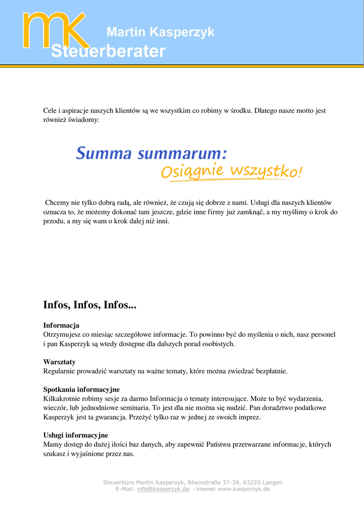 Cele i aspiracje naszych klientów są we wszystkim co robimy w środku. Dlatego nasze motto jest również świadomy: Chcemy nie tylko dobrą radą, ale również, że czują się dobrze z nami. Usługi dla naszych klientów oznacza to, że możemy dokonać tam jeszcze, gdzie inne firmy już zamknąć, a my myślimy o krok do przodu, a my się wam o krok dalej niż inni. Infos, Infos, Infos... Informacja Otrzymujesz co miesiąc szczegółowe informacje. To powinno być do myślenia o nich, nasz personel i pan Kasperzyk są wtedy dostępne dla dalszych porad osobistych. Warsztaty Regularnie prowadzić warsztaty na ważne tematy, które można zwiedzać bezpłatnie. Spotkania informacyjne Kilkakrotnie robimy sesje za darmo Informacja o tematy interesujące. Może to być wydarzenia, wieczór, lub jednodniowe seminaria. To jest dla nie można się nudzić. Pan doradztwo podatkowe Kasperzyk jest ta gwarancja. Przeżyć tylko raz w jednej ze swoich imprez. Usługi informacyjne Mamy dostęp do dużej ilości baz danych, aby zapewnić Państwu przetwarzane informacje, których szukasz i wyjaśnione przez nas. Steuerbüro Martin Kasperzyk, Rheinstraße 37-39, 63225 Langen E-Mail: [email protected] - Internet: www.kasperzyk.de Wisienką na torcie Zajmiemy Troszczymy się także o kwestiach, w których nie mamy zająć. Ponieważ dla nas, oczywiście, patrząc w przyszłość, aby zidentyfikować problemy, do rozwiązania i rozwiązać. Dobre samopoczucie Czuję się dobrze, gdy audyt jest ogłoszone do Ciebie? Już nasi klienci. Bo wiedzą, że prawie wszystkie kontrole odbywają się w naszym biurze bez znacznego Więcej wyniku. Holistyczne podejście Kontynuując jako konsultant ratingowej i ekspert z rekultywacją i retoryki i komunikacji jako trener, widzimy Ciebie i Twojej firmy, nie tylko z punktu widzenia podatkowego. Radzimy więc, że mogą generować nie tylko korzyści podatkowe. Klient sieci Skorzystaj z naszej sieci klientom z niemal wszystkich sektorów gospodarki: zapewniamy im zwrócić ważnych kontaktów tutaj. Oczywiście, dla nas ... Antyterrorystyczne wiadomości Obliczyć ich obciążeń podatkowych w ciągu roku tak, że możemy razem zawsze doradzić w jaki sposób możemy zminimalizować obciążenia podatkowe. Lub które można zredukować nadmierne płatności zaliczkowe. Doradztwo na miejscu Czas to pieniądz! Na życzenie możemy przeprowadzić porady w biurze lub w domu przez; kwestia kiedy: od poniedziałku do niedzieli od 7:00 do 24.oo zegar może umówić się na spotkanie z nami. Odbiór i dostawa Zbieramy dokumenty z pomieszczeniami i przynieść je do Ciebie do domu lub do biura - i to za Steuerbüro Martin Kasperzyk, Rheinstraße 37-39, 63225 Langen E-Mail: [email protected] - Internet: www.kasperzyk.de darmo! Informacja telefoniczna My oddzwonimy do Ciebie natychmiast, jeśli ich partner rozmowy właśnie zapobiegać. Jeśli rozwiązania dłużej, możemy powiedzieć, że też w czasie. W czołówce ... Innowacja Pracujemy w czołówce. Z najnowszym oprogramowaniem prawnej, możemy pracować wydajniej i doskonałe. Doświadczenie Nasi pracownicy zdobyli kilkaset lat doświadczenia zawodowego. Skorzystaj z tego! Jesteśmy nikt nawet urząd skarbowy - coś tak łatwo przed. Stale zrobić dalej Oczywiście, to jest w zakresie prawa podatkowego. Ponadto, Pan doradztwo podatkowe Kasperzyk absolwentem Uniwersytetu Nauk Stosowanych w Koblenz dodatkową kwalifikacją Doradców ratingowych. W czasie, gdy nabywa kwalifikacji reorganizacji i kryzysami oraz doradca mediatora gospodarczego. Steuerbüro Martin Kasperzyk, Rheinstraße 37-39, 63225 Langen E-Mail: [email protected] - Internet: www.kasperzyk.de Powered by TCPDF (www.tcpdf.org)