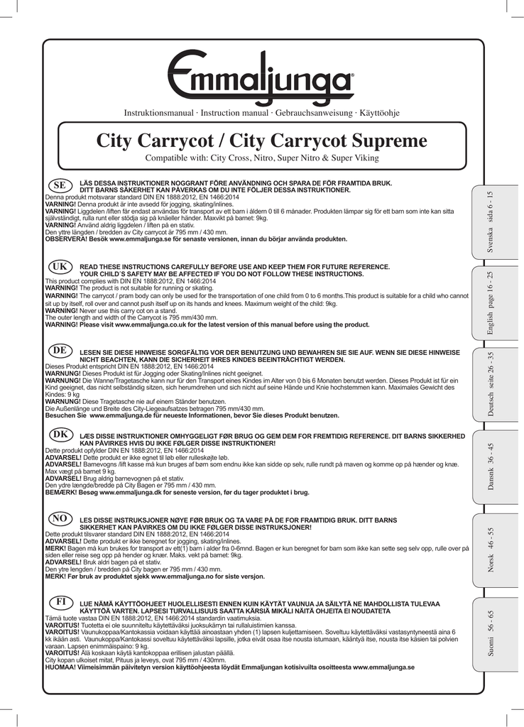 Instruktionsmanual · Instruction manual · Gebrauchsanweisung · Käyttöohje City Carrycot / City Carrycot Supreme DK LÆS DISSE INSTRUKTIONER OMHYGGELIGT FØR BRUG OG GEM DEM FOR FREMTIDIG REFERENCE. DIT BARNS SIKKERHED KAN PÅVIRKES HVIS DU IKKE FØLGER DISSE INSTRUKTIONER! Dette produkt opfylder DIN EN 1888:2012, EN 1466:2014 ADVARSEL! Dette produkt er ikke egnet til løb eller rulleskøjte løb. ADVARSEL! Barnevogns /lift kasse må kun bruges af børn som endnu ikke kan sidde op selv, rulle rundt på maven og komme op på hænder og knæ. Max vægt på barnet 9 kg. ADVARSEL! Brug aldrig barnevognen på et stativ. Den ydre længde/bredde på City Bagen er 795 mm / 430 mm. BEMÆRK! Besøg www.emmaljunga.dk for seneste version, før du tager produktet i brug. NO LES DISSE INSTRUKSJONER NØYE FØR BRUK OG TA VARE PÅ DE FOR FRAMTIDIG BRUK. DITT BARNS SIKKERHET KAN PÅVIRKES OM DU IKKE FØLGER DISSE INSTRUKSJONER! Dette produkt tilsvarer standard DIN EN 1888:2012, EN 1466:2014 ADVARSEL! Dette produkt er ikke beregnet for jogging, skating/inlines. MERK! Bagen må kun brukes for transport av ett(1) barn i alder fra 0-6mnd. Bagen er kun beregnet for barn som ikke kan sette seg selv opp, rulle over på siden eller reise seg opp på hender og knær. Maks. vekt på barnet: 9kg. ADVARSEL! Bruk aldri bagen på et stativ. Den ytre lengden / bredden på City bagen er 795 mm / 430 mm. MERK! Før bruk av produktet sjekk www.emmaljunga.no for siste versjon. FI LUE NÄMÄ KÄYTTÖOHJEET HUOLELLISESTI ENNEN KUIN KÄYTÄT VAUNUA JA SÄILYTÄ NE MAHDOLLISTA TULEVAA KÄYTTÖÄ VARTEN. LAPSESI TURVALLISUUS SAATTA KÄRSIÄ MIKÄLI NÄITÄ OHJEITA EI NOUDATETA Tämä tuote vastaa DIN EN 1888:2012, EN 1466:2014 standardin vaatimuksia. VAROITUS! Tuotetta ei ole suunniteltu käytettäväksi juoksukärryn tai rullaluistimien kanssa. VAROITUS! Vaunukoppaa/Kantokassia voidaan käyttää ainoastaan yhden (1) lapsen kuljettamiseen. Soveltuu käytettäväksi vastasyntyneestä aina 6 kk ikään asti. Vaunukoppa/Kantokassi soveltuu käytettäväksi lapsille, jotka eivät osaa itse nousta istumaan, kääntyä itse, nousta itse käsien tai polvien varaan. Lapsen enimmäispaino: 9 kg. VAROITUS! Älä koskaan käytä kantokoppaa erillisen jalustan päällä. City kopan ulkoiset mitat, Pituus ja leveys, ovat 795 mm / 430mm. HUOMAA! Viimeisimmän päivitetyn version käyttöohjeesta löydät Emmaljungan kotisivuilta osoitteesta www.emmaljunga.se English page 16 - 25 Deutsch seite 26 - 35 Dansnk 36 - 45 DE LESEN SIE DIESE HINWEISE SORGFÄLTIG VOR DER BENUTZUNG UND BEWAHREN SIE SIE AUF. WENN SIE DIESE HINWEISE NICHT BEACHTEN, KANN DIE SICHERHEIT IHRES KINDES BEEINTRÄCHTIGT WERDEN. Dieses Produkt entspricht DIN EN 1888:2012, EN 1466:2014 WARNUNG! Dieses Produkt ist für Jogging oder Skating/Inlines nicht geeignet. WARNUNG! Die Wanne/Tragetasche kann nur für den Transport eines Kindes im Alter von 0 bis 6 Monaten benutzt werden. Dieses Produkt ist für ein Kind geeignet, das nicht selbständig sitzen, sich herumdrehen und sich nicht auf seine Hände und Knie hochstemmen kann. Maximales Gewicht des Kindes: 9 kg WARNUNG! Diese Tragetasche nie auf einem Ständer benutzen. Die Außenlänge und Breite des City-Liegeaufsatzes betragen 795 mm/430 mm. Besuchen Sie www.emmaljunga.de für neueste Informationen, bevor Sie dieses Produkt benutzen. Norsk 46 - 55 UK READ THESE INSTRUCTIONS CAREFULLY BEFORE USE AND KEEP THEM FOR FUTURE REFERENCE. YOUR CHILD´S SAFETY MAY BE AFFECTED IF YOU DO NOT FOLLOW THESE INSTRUCTIONS. This product complies with DIN EN 1888:2012, EN 1466:2014 WARNING! The product is not suitable for running or skating. WARNING! The carrycot / pram body can only be used for the transportation of one child from 0 to 6 months.This product is suitable for a child who cannot sit up by itself, roll over and cannot push itself up on its hands and knees. Maximum weight of the child: 9kg. WARNING! Never use this carry cot on a stand. The outer length and width of the Carrycot is 795 mm/430 mm. WARNING! Please visit www.emmaljunga.co.uk for the latest version of this manual before using the product. Suomi 56 - 65 SE LÄS DESSA INSTRUKTIONER NOGGRANT FÖRE ANVÄNDNING OCH SPARA DE FÖR FRAMTIDA BRUK. DITT BARNS SÄKERHET KAN PÅVERKAS OM DU INTE FÖLJER DESSA INSTRUKTIONER. Denna produkt motsvarar standard DIN EN 1888:2012, EN 1466:2014 VARNING! Denna produkt är inte avsedd för jogging, skating/inlines. VARNING! Liggdelen /liften får endast användas för transport av ett barn i åldern 0 till 6 månader. Produkten lämpar sig för ett barn som inte kan sitta självständigt, rulla runt eller stödja sig på knäeller händer. Maxvikt på barnet: 9kg. VARNING! Använd aldrig liggdelen / liften på en stativ. Den yttre längden / bredden av City carrycot är 795 mm / 430 mm. OBSERVERA! Besök www.emmaljunga.se för senaste versionen, innan du börjar använda produkten. Svenska sida 6 - 15 Compatible with: City Cross, Nitro, Super Nitro & Super Viking Kasutusjuhend • Lietošanas instrukcija • Instrukcijų vadovas • Instrukcja obsługi • Руководство пользователя • Návod k obsluze City Carrycot / City Carrycot Supreme PRZED PRZYSTĄPIENIEM DO KORZYSTANIA Z PRODUKTU PROSIMY UWAŻNIE PRZECZYTAĆ NINIEJSZE INSTRUKCJE I PL ZACHOWAĆ JE DO PRZYSZŁEGO WYKORZYSTANIA. NIEPRZESTRZEGANIE NINIEJSZYCH INSTRUKCJI MOŻE MIEĆ NIEKOR ZYSTNY WPŁYW NA BEZPIECZEŃSTWO PAŃSTWA DZIECKA. Produkt ten odpowiada wymaganiom norm DIN EN 1888:2012, EN 1466:2014 OSTRZEŻENIE! Ten produkt nie nadaje się do stosowania podczas jazdy na łyżworolkach ani w czasie uprawiania joggingu. OSTRZEŻENIE! Nosidełko / gondola głęboka mogą być wykorzystywane wyłącznie do przewozu jednego dziecka w wieku 0 – 6 miesięcy. Produkt ten nadaje wyłącznie dla dziecka, które nie jest stanie w samodzielnie siadać, przekręcać się na boki oraz opierać na rękach i na kolanach. Maksymalna waga dziecka wynosi: 9 kg. OSTRZEŻENIE!
