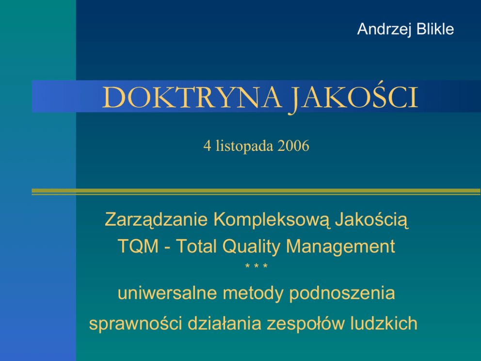 Andrzej Blikle DOKTRYNA JAKOŚCI 4 listopada 2006 Zarządzanie Kompleksową Jakością TQM - Total Quality Management *** uniwersalne metody podnoszenia sprawności działania zespołów ludzkich Edwards Deming w Japonii Lato 1950, wykład zorganizowany przez Japoński Związek Naukowców i Inżynierów „Przyjechałem uczyć was nowoczesnych metod zarządzania przedsiębiorstwami. Nie będę jednak uczył Was tych metod zarządzania jakie stosuje się dziś w mojej ojczyźnie, bowiem amerykańskie przedsiębiorstwa są zarządzane źle. Ja was nauczę zarządzać dobrze i obiecuję, że w połowie lat 1970. w rozwoju gospodarczym wyprzedzicie Stany Zjednoczone.” Edwards Deming w NBC 24 czerwca 1980 „Jeżeli mogą Japończycy, to dlaczego nie możemy my?” KAŻDA NAPRAWDĘ NOWA MYŚL WYDAJE SIĘ Z POCZĄTKU ABSURDALNA Kto zdecydował się na TQM (tylko przykłady): Na świecie W Polsce TOYOTA MAZDA HONDA SONY CANON ROVER MOTOROLA MC DONALDS ABB PHILIPS FORD BRITISH STEEL INDUSTRY ROLCE-ROYCE Marynarka Wojenna USA Administracja Publiczna USA ZELMER POLMO ŁOMIANKI SA MCDONALDS PL ABB PL POLAM PABIANICE A.BLIKLE niektóre licea, gimnazja i szkoły podstawowe niektóre administracje samorządowe niektóre oddziały policji Urząd Skarbowy w Cumbernaul (Anglia) zatrudniający ponad 1.000 pracowników, obsługujący 7 mln podatników i 26 mln rachunków. Europ. Nagroda Jakości w 1998 DOKTRYNA JAKOŚCI ZASADA DOSKONALENIA doskonalimy wszystko, wszyscy i stale E. Deming P.Drucker W.Shewhart ZASADA RACJONALNOŚCI ZASADA JEDNOŚCI ZESPOŁU zrozum działanie systemu zanim podejmiesz decyzję intuicja może być zawodna jesteśmy jednym zespołem mamy wspólny cel łączy nas współpraca i życzliwość WDROŻENIE DOKTRYNY JAKOŚCI WYMAGA PRZEŁAMANIA WIELU STEREOTYPÓW MYŚLOWYCH JAKOŚĆ A WARTOŚĆ wartość Maseratti poziom oczekiwań niektóre „okazje” w hipermarketach Jakość to mała liczba wad w produkcie. Wada to każda taka cecha produktu, której klient ma się prawo nie spodziewać. zegarek szwajcarski Trabant jakość (stopień spełnienia oczekiwań) JAKOŚĆ NIE JEST CECHĄ PRODUKTU Kamera foto, która staje się niezdatna do użytku po wykonaniu 24 zdjęć Zepsute mięso z piaskiem Jakość jest stopniem spełnienia oczekiwań klienta. Jakość nie jest cechą produktu, ale relacji pomiędzy opisem produktu (oczekiwaniami klienta) a produktem. ZASADA DOSKONALENIA NIE TAK oczekuj perfekcji oczekuj postępu wysoka jakość kosztuje niska jakość kosztuje dobra praca = ciężka praca dobra praca = lekka praca jakość określa firma jakość określa klient CYKL DOSKONALENIA EDWARDSA DEMINGA PWOZ PDCA planuj naprawę P: plan wykonaj eksperyment D: do zastosuj A: act oceń wynik skoryguj C:check ZASADA JEDNOŚCI NIE TAK ludzie są nieuczciwi i leniwi ludzie są uczciwi i pracowici kontrola, kary i nagrody partnerstwo i nauczanie polecenia i nadzór delegacja odpowiedzialności oczekiwanie posłuszeństwa oczekiwanie odpowiedzialności współzawodnictwo współpraca wygrał-przegrał wygrał-wygrał decydenci i wykonawcy decydują wykonawcy Jeżeli chcesz, aby ludzie zrobili dla ciebie dobrą pracę, daj im dobrą pracę do zrobienia. Piramida Masłowa Zasada 3W Herzberg PIRAMIDA MASLOVA SAMOREALIZACJA UZNANIE PRZEZ ZESPÓŁ PRZYNALEŻNOŚĆ DO ZESPOŁU BEZPIECZEŃSTWO POTRZEBY BIOLOGICZNE Wynagrodzenie zaspakaja co najwyżej potrzeby biologiczne! TRZY W THREE C współpraca Cooperation wartość Content wybór Choice ZASADA RACJONALNOŚCI NIE TAK winni ludzie błąd w systemie (85%-96%) wina przyczyna obniżyć koszty zlikwidować marnotrawstwo rozwiązania intuicyjne archetypy dlaczego w kwietniu spadły obroty... analiza statystycznej stabilności procesu (Shewhart) OBNIŻYĆ KOSZTY O 15% produkcja dystryb. sprzedaż zarząd Marnotrawstwo OBNIŻYĆ KOSZTY NIE PRZYNOSZĄCE WARTOŚCI DODANEJ (OBNIŻYĆ MARNOTRAWSTWO) produkcja dystryb. sprzedaż zarząd Marnotrawstwo Postawa a zachowanie postawa zachowanie zgodnie z oczekiwaniami zgodnie z oczekiwaniami uczucia przeciwnie do oczekiwań kary i nagrody OD CZEGO ZACZĄĆ Gdybym wprowadził te wszystkie zasady, to za dwa tygodnie musiałbym zamknąć firmę znajomy przedsiębiorca TQM nie można wprowadzić administracyjnie, tak jak nie można administracyjnie przesadzić woźniców z kozła za kierownice samochodów. ZARZĄDZANIE OCHOTNIKAMI ZACZNIJ OD LUDZI !! Częste pytanie: Jak zachęcić ludzi do pracy. Odpowiedź (Deming): Przestać ich do pracy zniechęcać. POTRZEBA DZIAŁANIA, A TYM BARDZIEJ POTRZEBA DZIAŁANIA EFEKTYWNEGO NIE MOŻE BYĆ CZŁOWIEKOWI NARZUCONA. PORZUĆ TOKSYCZNE METODY ZARZĄDZANIA: założenie, że ludzie są z natury leniwi i nieuczciwi, zarządzanie według zasady „polecenie i nadzór” poszukiwanie winnych, kary i represje, premie, prowizje, nagrody, konkursy na najlepszego sprzedawcę, itp. stawianie celów typu: „zmniejsz koszty o 5%”, apele o podniesienie wydajności, KOŁA JAKOŚCI MAŁE ZESPOŁY PRACOWNIKÓW (5-7 OSÓB) ODBYWAJĄCE REGULARNE SPOTKANIA W CELU STAŁEGO DOSKONALENIA JAKOŚCI PRACY Powstały w roku 1962 z inicjatywy prof. Kaoru Ishikawy Kilka faktów o japońskich kołach jakości (rok 2000) 420.000 zarejestrowanych kół obejmuje 3.200.000 członków NISSAN 3.000 kół, każde średnio rozwiązuje 3 problemy/rok NODA drugi co do wielkości producent łożysk kulkowych na świecie (PL: Iskra) w jednej z fabryk japońskich praca kół jakości nad przyspieszeniem produkcji przyniosła 2,5 ml $ oszczędności w skali roku TOYOTA w fabrykach japońskich 6.800 kół jakości zgłosiło w roku 1997 727.884 wnioski naprawcze, średnio 10,3 na pracownika, 98% wniosków zostało wdrożone SZPITALE obecnie wprowadza się koła jakości w 12 tys. szpitali bowiem stwierdzono, że połowa złych wyników leczenia ma swoje źródło w błędach lekarzy NIEKTÓRE NARZĘDZIA PRACY KÓŁ JAKOŚCI . burza mózgów, . rybia ość (diagram Ishikawy), . diagramy pokrewieństwa, . grafy prze