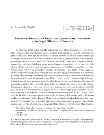 Ks. Paweł KIEJKOWSKI Studia Gnesnensia Tom XXX (2016) 213–232 Zmartwychwstanie Chrystusa a przemiana kosmosu w teologii Oliviera Clémenta 19 czerwca 2015 roku została ogłoszona encyklika Laudato si’ Ojca świętego Franciszka, poświęcona problematyce ekologicznej. Papież, podejmując jakże aktualny problem zatroskania o świat natury, w istoty sposób wiąże go z integralnym zrozumieniem tajemnicy człowieka, jego godności i szczególnego powołania we wszechświecie. Ukazuje wielkość człowieka i jego kruchość, szczególną odpowiedzialność oraz konsekwencje jego fałszywych decyzji. Odsłania drogi autentycznej ludzkiej egzystencji oświetlonej światłem Jezusa Chrystusa, w którym „zostało wszystko stworzone” (Kol 1,16). Wskazując na chrystologiczne aspekty antropologii oraz kosmologii, papież przypomina istotną prawdę, objawioną przez Nowy Testament, że los całego stworzenia uczestniczy w misterium Jezusa Chrystusa (por. Kol 1,16; J 1,1-18)1. „Jedna z Osób Trójcy Świętej weszła w stworzony wszechświat, łącząc z nim swój los aż po krzyż. Od początku świata, ale w sposób szczególny od wcielenia, misterium Chrystusa tajemniczo działa w całej rzeczywistości naturalnej, nie ograniczając jednak jej autonomii”2. Spełnieniem dziejów świata stworzonego jest Chrystus zmartwychwstały i uwielbiony, Pan wszelkiego stworzenia (por. Kol 1,19-20; 1 Kor 15,28). W Zmartwychwstałym stworzenia zmierzają ku swojej pełni. Te same rośliny i zwierzęta, które Jezus z Nazaretu podziwiał swoimi ludzkimi oczyma, do których nawiązywał w swoich przypowieściach, zostały w misteryjny sposób naznaczone Jego obecnością3. W papieskim tekście znajdujemy ślad bardzo Z.J. Kijas, Początki świata i człowieka, Kraków 2004, 100-107. Franciszek, Encyklika Laudato si’. W trosce o wspólny dom, Kraków 2016 (dalej LS), 99. 3 Por. LS 100. 1 2 Ks. dr hab. Paweł Kiejkowski (ur. 1968 r.); adiunkt w Zakładzie Teologii Dogmatycznej, Fundamentalnej i Ekumenizmu Wydziału Teologicznego Uniwersytetu im. Adama Mickiewicza w Poznaniu; e-mail: [email protected] 214 Ks. Paweł KIEJKOWSKI ciekawej i ważnej intuicji teologicznej, że zmartwychwstały Pan, prawdziwy Bóg i prawdziwy człowiek, jest początkiem przemiany wszechświata, a zarazem pełnią, ku której zmierzają wszelkie stworzenia, w tym cała ludzkość. Zmartwychwstanie jest początkiem paschalnej przemiany rodziny ludzkiej, ale także całego kosmosu. Na terenie polskiej współczesnej katolickiej myśli teologicznej ciekawe inspiracje zebrane wokół tego tematu znajdziemy w pracach Romana Rogowskiego4 czy Wacława Hryniewicza5. Szczególnie w bogatym dorobku teologicznym autora trylogii paschalnej spotykamy ważkie intuicje o związkach zmartwychwstałego w ciele i uwielbionego Zbawiciela z odnowionym przez łaskę człowiekiem oraz przemianą całego kosmosu. Odwołując się do sformułowań lubelskiego profesora, można powiedzieć, że z paschą Jezusa Chrystusa istotnie związana jest pascha człowieka i całego wszechświata. Myśl o kosmicznym znaczeniu zmartwychwstania jest szczególnie droga wschodniej tradycji Kościoła. Spotykamy ją w prawosławnym doświadczeniu wiary, które, między innymi, związane jest z przemieniającym świat stworzony światłem góry Tabor6. Odnajdujemy ją także w prawosławnej literaturze teologicznej, choćby wspomnieć prace współczesnych myślicieli prawosławnych Paula Evdokimova7 czy Oliviera Clémenta8. Nad kosmologicznymi intuicjami tego ostatniego francuskiego myśliciela, zwłaszcza związku Zmartwychwstania z misterium przemiany kosmosu, zatrzymamy się w niniejszym tekście. I. Olivier Clément – teolog poszukujący „sensu ziemi”9 Olivier Clément, francuski myśliciel związany przez większość swojego twórczego życia z Instytutem św. Sergiusza w Paryżu, należy do najwybitniejszych Por. R. Rogowski, Światłość i Tajemnica. Z problematyki teologii egzystencjalnej, Katowice 1986; tenże, Teoekologia: mistyka wszystkich rzeczy, Kraków 2002. 5 Por. W. Hryniewicz, Pascha Chrystusa w dziejach człowieka i świata, Lublin 1991, 448-472. 6 Por. G.I. Mantzaridis, Przebóstwienie człowieka. Nauka świętego Grzegorza Palamasa w świetle tradycji prawosławnej, Lublin 1997; K. Leśniewski, „Kim jest człowiek, że o nim pamiętasz…?” Podstawowe idee współczesnej antropologii prawosławnej, Lublin 2015; P. Kiejkowski, „Wysławiajcie Boga w swoim ciele”. Wokół teologii ciała Kallistosa Ware’a, Studia Bydgoskie 9(2015)59-74. 7 Por. P. Evdokimov, Sztuka ikony. Teologia piękna, Warszawa 1999. 8 Por. O. Clément, Ciało śmiertelne i chwalebne. Wprowadzenie do teopoetyki ciała, Warszawa 1999; tenże, Boski kosmos. Wybrane zagadnienia z kosmologii, Kraków 2010. 9 Por. D. Kleinowski-Różycki, Oliviera Clément reinterpretacja teologii. Studium dogmatyczno-ekumeniczne, Opole 2009, 35. 4 Zmartwychwstanie Chrystusa a przemiana kosmosu 215 współczesnych teologów prawosławnych10. Urodził się 17 listopada 1921 roku w ateistycznej socjalistycznej rodzinie na południu Francji, zmarł 15 stycznia 2009 roku w wieku 87 w Paryżu11. Wzrastał w środowisku zdechrystianizowanym i pogańskim, jak sam przyznaje, pośród wojującego ateizmu. Od wczesnej młodości szukał odpowiedzi na fundamentalne egzystencjalne pytania o życie i o śmierć, o sens miłości i erotyzmu, o początki i znaczenie kosmosu oraz zamieszkanej przez ludzi „ziemi”. Początkowo rozczytywał się w poezji Charlesa Baudelaire’a, Czesława Miłosza, Thomasa Stearnsa Eliota, studiował teksty mistrzów ówczesnych francuskich intelektualistów: Karla Marksa, Sigmunda Freuda, Friedricha Nietschego. Nie wystarczały mu jednak odnajdywane tu rozwiązania oraz podpowiadane idee. Stopniowo odkrywał duchowy wymiar ludzkiej kultury. W czasie II wojny światowej, będąc zaangażowanym we francuski ruch oporu, dalej szukał odpowiedzi na własne egz
