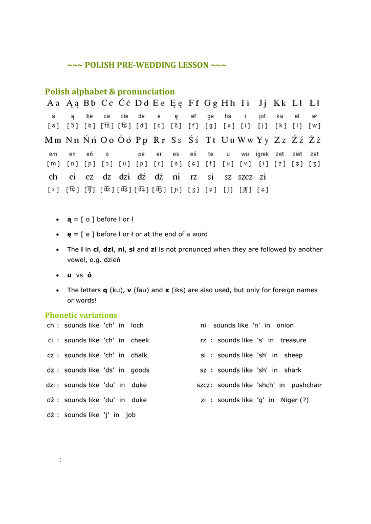 ~~~ POLISH PRE-WEDDING LESSON ~~~ Polish alphabet & pronunciation ą = [ o ] before l or ł ę = [ e ] before l or ł or at the end of a word The i in ci, dzi, ni, si and zi is not pronunced when they are followed by another vowel, e.g. dzień u vs ó The letters q (ku), v (fau) and x (iks) are also used, but only for foreign names or words! Phonetic variations ch : sounds like 'ch' in loch ni ci : sounds like 'ch' in cheek rz : sounds like 's' in cz : sounds like 'ch' in chalk si : sounds like 'sh' in sheep dz : sounds like 'ds' in goods sz : sounds like 'sh' in shark dzi : sounds like 'du' in duke dź : sounds like 'du' in duke dż : sounds like 'j' in : job sounds like 'n' in onion treasure szcz : sounds like 'shch' in zi : sounds like 'g' in pushchair Niger (?) Wedding songs: Sto lat https://www.youtub e.com/watch?v=IvW DPmbbRfY Sto lat, sto lat, Niech żyje, żyje nam. Sto lat, sto lat, Niech żyje, żyje nam, Jeszcze raz, jeszcze raz, niech żyje, żyje nam, Niech żyje nam! Niech mu gwiazda pomyślności nigdy nie zagaśnie Nigdy nie zagaśnie A kto z nami nie wypije Niech go piorun trzaśnie A kto z nami nie wypije Niech go piorun trzaśnie Sto lat sto lat sto lat sto lat Niechaj żyje nam Sto lat sto lat sto lat sto lat Niechaj żyje nam Niech żyje nam Niech żyje nam W zdrowiu szczęściu pomyślności Niechaj żyje nam! means „bitter” and people shout it before drinking vodka to make the married couple sweeten the vodka with their kiss ;-) Gorzko gorzko!!! - A teraz idziemy na jednego ! https://www.youtube.com/watch?v=nmWQGDD1lWA A teraz idziemy na jednego A teraz idziemy wódkę pid do dna A teraz idziemy na jednego A teraz idziemy wódkę pid I rym cym cym i hopsasa Idziemy przez życie w podskokach I rymcymcym i hopsasa To życie a żyje sie raz Useful Polish phrases and Polish words English Polish How are you? / Fine, well Jak się masz?; Co słychać? /Dobrze Good morning Dzień dobry Good evening Dobry wieczór Good night Dobranoc Hello, hi Cześć Hello (Welcome!) Witaj Bye bye/see you / Good bye Papa/do zobaczenia / Do widzenia Have a nice/pleasant day Miłego / Przyjemnego dnia Good luck! Powodzenia! Congratulations! Gratulacje! Thank you , thanks Dziękuję , dzięki You’re welcome Proszę Please Proszę Here you are (when passing sth to sb) Proszę I’m sorry Przepraszam Bless you (when sneezing) Na zdrowie / sto lat Cheers! Na zdrowie! Zdrówko! Enjoy your meal! Smacznego! How much? Ile? How much is it/does it cost? Ile to kosztuje? Po ile to jest? Why? Dlaczego? When? Kiedy? Who? Kto? What for? Po co? What? Co? Where are you from? Skąd jesteś? I am from the Netherlands /India /Germany /Romania /Latvia /Italy.. Jestem z Holandii /Indii /Niemiec /Rumunii /Łotwy /Włoch… How old are you? I’m 27. Ile masz lat? Mam 27 lat. What’s your name? My name is… Jak masz na imię? Mam na imię.... Where do you live? Gdzie mieszkasz? I live in the Netherlands/Poland. Mieszkam w Holandii/Polsce. What’s your profession? I am a student./I work in… And you? Jaki masz zawód? Jestem studentem (m) / studentką (f) /Pracuję w.. A Ty? Yes / No / Maybe Tak / Nie / Może I am tired / happy / sleepy Jestem zmęczony (-a)/szczęśliwy(-a)/śpiący(-a) You’re great / pretty / drunk. Jesteś wspaniały (-a) / piękny (-a) / pijany (-a) Give it to me Daj mi to I love you Kocham Cię I like you Lubię Cię Let’s drink Napijmy się Let’s talk Porozmawiajmy Shall we dance? Zatańczymy? I don’t understand Nie rozumiem I don’t speak Polish Nie mówię po polsku I speak English Mówię po angielsku By car / By air / By train / By bike Samochodem/ Samolotem/ Pociągiem/ Rowerem I’ve got a problem Mam problem Breakfast Śniadanie Lunch Lunch, obiad Dinner/supper Kolacja ALL THE BEST! WSZYSTKIEGO NAJLEPSZEGO! Cool Spoko Numbers: 0 – zero 6 – sześć (sheshch) 1 – jeden (YEH-den) 7– siedem (SHEH-dem) 2 – dwa (dvah) 8 – osiem (OH-shem) 3 – trzy (tzhih) 9 – dziewięć (JEV-yench) 4 – cztery (CHTEH-rih) 10 – dziesięć (JESH-yench) 5 – pięć (pyench) In the city + transport: Lotnisko – airport Dworzec autobusowy (PKS) – bus station Dworzec kolejowy (PKP) – train station Dworzec Główny – main station (both buses and trains can have it) Przystanek (autobusowy, tramwajowy) – (tram, bus) stop Autobus – bus Twamwaj - twamway Bus – minibus (for 8-20 pax) Samochód – car Taxi, taksówka – taxi Hotel, hostel, mieszkanie/apartament – hotel, hostel, apartment Sklep – shop Restauracja – restaurant Kawiarnia – coffee shop Piekarnia – bakery Bar, club – bar, club Samoobsługa /samoobsługowy – self service Cuisine: PICIE (DRINKS) woda gazowana /niegazowana – sparking /still water czerwone / białe wino – red / white wine wódka – vodka (!!!) piwo / dwa piwa - beer / two beers sok (owocowy) – (fruit) juice alkohol, alkoholowy, bezalkoholowy – alcohol, alcoholic, non-ancoholic mleko – milk (czarna) kawa – (black) coffee (gorąca) herbata – (hot) tea z curkem =/ bez cukru (with suger =/ without suger) z mlekiem =/bez mleka (with milk =/ bez mleka) JEDZENIE (FOOD) mięso: wieprzowe, wołowe; kurczak, indyk – meat pork, beef; chicken, turkey kiełbasa – sausage ryba - fish jajko - egg szynka, boczek – ham, becon ser żółty, biały – yellow, white cheese ryż – rice marakon – pasta ziemniaki – potatoes zupa – soup (TRY: żurek, ogórkowa, barszcz czerwony!) pierogi – dumpling (MUST TRY! Ruskie -> potatoes, white cheese, onion) bigos – meal with meat, white cabbage, sauerkraut, tomatoes (MUST TRY!) masło, margaryna – butter, margarine