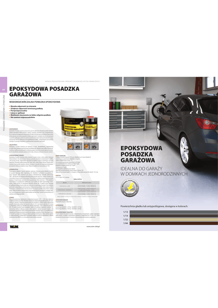 ,"5"-0(130%6,5»88*.t130%6,5:%0.0/5"ő61:5&,$&3".*$;/:$) 104"%;,*$&.&/508&*Lj:8*$;/& 64 EPOKSYDOWA POSADZKA GARAŻOWA WODOROZCIEŃCZALNA POWŁOKA EPOKSYDOWA Wysoka odporność na ścieranie Zwiększa odporność termiczną podłoży Paroprzepuszczalna Łatwa w aplikacji Możliwość stosowania na lekko wilgotne podłoża Nie zawiera rozpuszczalników ZASTOSOWANIE: Epoksydowa Posadzka Garażowa przeznaczona jest do wykonania ochronnych powłok malarskich podłoży mineralnych (takich jak beton, zaprawy i jastrychy cementowe, masy samopoziomujące, itp.) w miejscach występowania intensywnych obciążeń mechanicznych wywołanych intensywnym ruchem pieszym oraz ruchem pojazdów na kołach ogumionych. Szczególnie zalecana do stosowania w garażach, parkingach, piwnicach, pomieszczeniach technicznych, halach przemysłowych i magazynowych itp. Może być aplikowana w wersji gładkiej lub szorstkiej – antypoślizgowej. Do stosowania wewnątrz i na zewnątrz budynków, na powierzchniach poziomych i pionowych. WŁAŚCIWOŚCI: Epoksydowa Posadzka Garażowa jest barwioną w masie, dwuskładnikową, dyspergowalną w wodzie farbą epoksydową przeznaczoną do powłokowego zabezpieczania podłoży mineralnych. Jest łatwa w aplikacji, posiada bardzo wysoką przyczepność do betonu wysoką odporność na ścieranie. Po utwardzeniu uzyskujemy powierzchnię trwałą, estetyczną i łatwą do utrzymania czystości. PRZYGOTOWANIE PODŁOŻA: Epoksydową Posadzkę Garażową można stosować na czyste, mocne i nośne podłoża: betonowe (klasy minimum C-20, wiek powyżej 3 miesięcy), jastrychy cementowe (o wytrzymałości ≥ 20MPa, XJFL QPXZȈFK EOJ PEQPXJFEOJP XZUS[ZNBF QPTBE[LPXF [BQSBXZ XZSØXOVKnjDF PSB[ UZOLJ cementowe. Wszystkie podłoża powinny być czyste, suche, wolne od pyłu, tłuszczu i luźnych zanieczyszczeń. Stare powłoki malarskie, mleczko cementowe i wszystkie inne substancje zmniejszajace przyczepność należy bezwzględnie usunąć. Wilgotność podłoża nie może przekraczać 10%. SPOSÓB UŻYCIA: Przed użyciem składnik A (żywica) dokładnie wymieszać. Odważoną porcję składnika A przelać do naczynia roboczego, dodać odpowiednią ilość składnika B (utwardzacz) wg podanej proporcji. Następnie całość wymieszać przy pomocą wolnoobrotowego mieszadła elektrycznego (300 ÷ 600 obr/min) do uzyskania jednorodnej kolorystycznie masy (ok. 3 minut). W trakcie mieszania zbierać masę ze ścianek i dna naczynia. Przelać farbę do czystego naczynia i jeszcze raz krótko zamieszać. Do pierwszego malowania (forma gruntowania) farbę rozcieńczyć 5–10% dodatkiem wody. Nanosić na przygotowane podłoże przy użyciu pędzla lub wałka rozprowadzając równomierną, cienką warstwą. Po utwardzeniu pierwszej warstwy (ok. 12 godzin) można przystąpić do nakładania kolejnej warstwy farby tym razem już nie rozcieńczając jej wodą. W celu uzyskania powierzchni antypoślizgowej, pierwszą jeszcze świeżą warstwę powłoki należy zasypać piaskiem LXBSDPXZNPV[JBSOJFOJVPENNEPNN1P[XJnj[BOJVQPXPLJOBMFȈZ[NJFǴǎOBENJBS piasku i lekko przeszlifować powierzchnię w celu usunięcia luźnych ziaren piasku a następnie odkurzyć. Na tak przygotowane podłoże nałożyć kolejna warstwę farby. Czynność można powtórzyć do uzyskania zadowalającego efektu. UWAGA: .BMPXBOJFQPXJOOPCZǎXZLPOZXBOFXUFNQFSBUVS[FPUPD[FOJB0$0C, przy wilgotności X[HMǗEOFKQPXJFUS[BNBY8T[ZTULJFNBUFSJBZEPXZLPOZXBOJBQPTBE[LJQPXJOOZCZǎTF[P nowane co najmniej 24 godziny w pomieszczeniu lub warunkach, w których będzie wykonywana posadzka. Temperatura podłoża nie może być niższa niż 120C i musi być co najmniej o 30C wyższa PEUFNQFSBUVSZQVOLUVSPTZ8T[ZTULJFEBOFEPUZD[njUFNQFSBUVSZ0C i wilgotności powietrza 60%. W innych warunkach należy uwzględnić szybsze lub wolniejsze twardnienie materiału. Pomieszczenia, w których odbywają się prace należy wydzielić i zabezpieczyć przed wstępem osób postronnych oraz zachować strefę ochronną przed użyciem otwartego ognia, a w szczególności prac spawalniczych. W pomieszczeniach konieczna jest sprawna wentylacja. Bliższe informacje o wyrobie zawarte są w jego karcie technicznej. Oprócz podanych zaleceń prace należy wykonać zgodnie ze sztuką budowlaną i zasadami BHP. W przypadku wątpliwości należy się skontaktować z działem technicznym firmy WIM Sp. z o.o. lub wykonać własne próby stosowania. EPOKSYDOWA POSADZKA GARAŻOWA EPOKSYDOWA POSADZKA GARAŻOWA 21 35 3 kg 5 kg PUNKTÓW PUNKTÓW DANE TECHNICZNE: Proporcje mieszania (wagowo): 100 części składnika A na 24 części składnika B Gęstość masy po wymieszaniu składników: 1,32 g/cm3 -FQLPǴǎ"LVCFL'PSEBNN T Czas zużycia po wymieszaniu składników: ok. 30 minut $[BTXZTZDIBOJBEPXDJFOLJFKXBSTUXJF HPE[ Nakładanie następnej warstwy: po 12 godz. Ruch pieszy: po 12 godz. Pełne parametry użytkowe: po ok. 6 dniach Odporność na zarysowania po 6 dniach (aparat Clemena): 250 Odporność na ścieranie (krążki H-22 obciążenie 1000g, ubytek masy po 500 cyklach): 133,4 mg ZUŻYCIE: 0,15–0,5 kg/m2 na 1 warstwę. EPOKSYDOWA POSADZKA GARAŻOWA IDEALNA DO GARAŻY W DOMKACH JEDNORODZINNYCH TABELA ZUŻYCIA Warstwa Układ warstw i zużycia Powłoka lakiernicza – gładka 1. Warstwa gruntująca – 0,25 kg/m2TLBEOJL"# 2. Warstwa zamykająca – 0,25 kg/m2TLBEOJL"# Powłoka lakiernicza – antypoślizgowa 1. Warstwa gruntująca – 0,30 kg/m2TLBEOJL"# 2. Posypka z piasku kwarcowego – 2,5 kg/m2 3. Warstwa zamykająca – 0,50 kg/m2TLBEOJL"# Powłoka lakiernicza – piony, stropy 1. Warstwa gruntująca – 0,15 kg/m2TLBEOJL"# 2. Warstwa zamykająca – 0,20 kg/m2TLBEOJL"# Podane w tabeli dane są orientacyjne i mogą ulec zmianie w zależności od nasiąkliwości, porowatości i równości podłoża. CZYSZCZENIE NARZĘDZI: Bezpośrednio po pracy ciepłą wodą. OPAKOWANIA: ;FTUBXLHTLBEOJL"oLHTLBEOJL#oLH ;FTUBXLHTLBEOJL"oLHTLBEOJL#oLH 1PXJFS[DIOJBHBELBMVCBOUZQPǴMJ[HPXBEPTUǗQOBXLPM