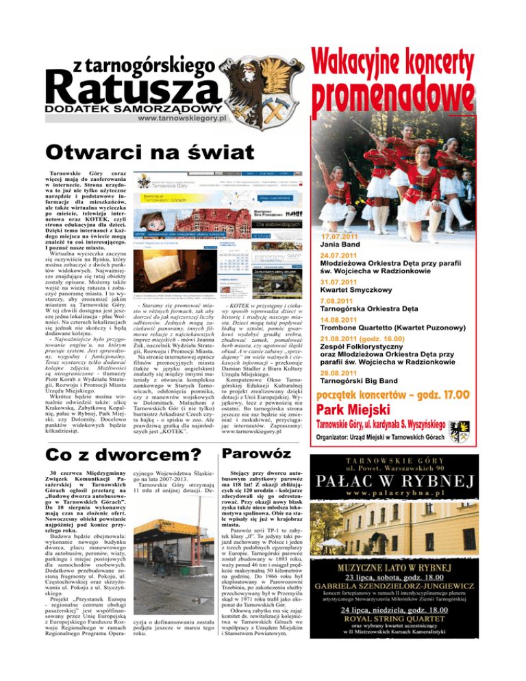 Otwarci na świat Tarnowskie Góry coraz więcej mają do zaoferowania w internecie. Strona urzędowa to już nie tylko użyteczne narzędzie i podstawowe informacje dla mieszkańców, ale także wirtualna wycieczka po mieście, telewizja internetowa oraz KOTEK, czyli strona edukacyjna dla dzieci. Dzięki temu internauci z każdego miejsca na świecie mogą znaleźć tu coś interesującego. I poznać nasze miasto. Wirtualna wycieczka zaczyna się oczywiście na Rynku, który można zobaczyć z dwóch punktów widokowych. Najważniejsze znajdujące się tutaj obiekty zostały opisane. Możemy także wejść na wieżę ratusza i zobaczyć panoramę miasta. I to wystarczy, aby zrozumieć jakim miastem są Tarnowskie Góry. W tej chwili dostępna jest jeszcze jedna lokalizacja - plac Wolności. Na czterech lokalizacjach się jednak nie skończy i będą dodawane kolejne. - Najważniejsze było przygotowanie engine`u, na którym pracuje system. Jest sprawdzony, wygodny i funkcjonalny. Teraz wystarczy tylko dodawać kolejne zdjęcia. Możliwości są nieograniczone - tłumaczy Piotr Korab z Wydziału Strategii, Rozwoju i Promocji Miasta Urzędu Miejskiego. Wkrótce będzie można wirtualnie odwiedzić także: ulicę Krakowską, Zabytkową Kopalnię, pałac w Rybnej, Park Miejski, czy Dolomity. Docelowo punktów widokowych będzie kilkadziesiąt. - Staramy się promować miasto w różnych formach, tak aby dotrzeć do jak najszerszej liczby odbiorców. Jednych mogą zaciekawić panoramy, innych filmowe relacje z najciekawszych imprez miejskich - mówi Joanna Żuk, naczelnik Wydziału Strategii, Rozwoju i Promocji Miasta. Na stronie internetowej oprócz filmów promocyjnych miasta (także w języku angielskim) znalazły się między innymi materiały z otwarcia kompleksu zamkowego w Starych Tarnowicach, odsłonięcia pomnika, czy z manewrów wojskowych w Dolomitach. Maluchom z Tarnowskich Gór (i nie tylko) burmistrz Arkadiusz Czech czyta bajkę - o spisku w zoo. Ale prawdziwą gratką dla najmłodszych jest „KOTEK”. - KOTEK w przystępny i ciekawy sposób wprowadza dzieci w historię i tradycję naszego miasta. Dzieci mogą tutaj popływać łódką w sztolni, pomóc gwarkowi wydobyć grudkę srebra, zbudować zamek, pomalować herb miasta, czy ugotować śląski obiad. A w czasie zabawy „sprzedajemy” im wiele ważnych i ciekawych informacji - przekonuje Damian Stadler z Biura Kultury Urzędu Miejskiego. Komputerowe Okno Tarnogórskiej Edukacji Kulturalnej to projekt zrealizowany dzięki dotacji z Unii Europejskiej. Wyjątkowy, lecz z pewnością nie ostatni. Bo tarnogórska strona jeszcze nie raz będzie się zmieniać i zaskakiwać, przyciągając internautów. Zapraszamy: www.tarnowskiegory.pl Co z dworcem? Parowóz 30 czerwca Międzygminny Związek Komunikacji Pasażerskiej w Tarnowskich Górach ogłosił przetarg na „Budowę dworca autobusowego w Tarnowskich Górach”. Do 10 sierpnia wykonawcy mają czas na złożenie ofert. Nowoczesny obiekt powstanie najpóźniej pod koniec przyszłego roku. Budowa będzie obejmowała: wykonanie nowego budynku dworca, placu manewrowego dla autobusów, peronów, wiaty, parkingu i miejsc postojowych dla samochodów osobowych. Dodatkowo przebudowane zostaną fragmenty ul. Pokoju, ul. Częstochowskiej oraz skrzyżowania ul. Pokoju z ul. Styczyńskiego. Projekt „Przystanek Europa - regionalne centrum obsługi pasażerskiej” jest współfinansowany przez Unię Europejską z Europejskiego Funduszu Rozwoju Regionalnego w ramach Regionalnego Programu Opera- Stojący przy dworcu autobusowym zabytkowy parowóz ma 118 lat! Z okazji zbliżających się 120 urodzin - kolejarze zdecydowali się go odrestaurować. Przy okazji nowy blask zyska także nieco młodsza lokomotywa spalinowa. Obie na stałe wpisały się już w krajobraz miasta. Parowóz serii TP-1 to zabytek klasy „0”. To jedyny taki pojazd zachowany w Polsce i jeden z trzech podobnych egzemplarzy w Europie. Tarnogórski parowóz został zbudowany w 1893 roku, waży ponad 46 ton i osiągał prędkość maksymalną 50 kilometrów na godzinę. Do 1966 roku był eksploatowany w Parowozowni Trzebinia, po zakończeniu służby przechowywany był w Przemyślu skąd w 1971 roku trafił jako eksponat do Tarnowskich Gór. Odnową zabytku ma się zająć komitet ds. rewitalizacji kolejnictwa w Tarnowskich Górach we współpracy z Urzędem Miejskim i Starostwem Powiatowym. cyjnego Województwa Śląskiego na lata 2007-2013. Tarnowskie Góry otrzymają 11 mln zł unijnej dotacji. De- cyzja o dofinansowaniu została podjęta jeszcze w marcu tego roku.
