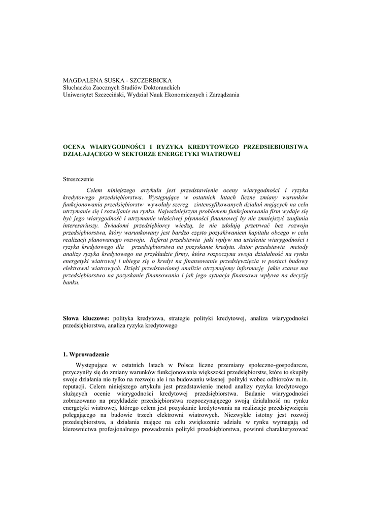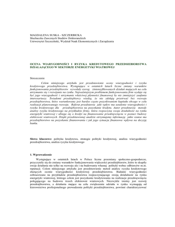 MAGDALENA SUSKA - SZCZERBICKA Słuchaczka Zaocznych Studiów Doktoranckich Uniwersytet Szczeciński, Wydział Nauk Ekonomicznych i Zarządzania OCENA WIARYGODNOŚCI I RYZYKA KREDYTOWEGO PRZEDSIEBIORSTWA DZIAŁAJĄCEGO W SEKTORZE ENERGETYKI WIATROWEJ Streszczenie Celem niniejszego artykułu jest przedstawienie oceny wiarygodności i ryzyka kredytowego przedsiębiorstwa. Występujące w ostatnich latach liczne zmiany warunków funkcjonowania przedsiębiorstw wywołały szereg zintensyfikowanych działań mających na celu utrzymanie się i rozwijanie na rynku. Najważniejszym problemem funkcjonowania firm wydaje się być jego wiarygodność i utrzymanie właściwej płynności finansowej by nie zmniejszyć zaufania interesariuszy. Świadomi przedsiębiorcy wiedzą, że nie zdołają przetrwać bez rozwoju przedsiębiorstwa, który warunkowany jest bardzo często pozyskiwaniem kapitału obcego w celu realizacji planowanego rozwoju. Referat przedstawia jaki wpływ ma ustalenie wiarygodności i ryzyka kredytowego dla przedsiębiorstwa na pozyskanie kredytu. Autor przedstawia metody analizy ryzyka kredytowego na przykładzie firmy, która rozpoczyna swoja działalność na rynku energetyki wiatrowej i ubiega się o kredyt na finansowanie przedsięwzięcia w postaci budowy elektrowni wiatrowych. Dzięki przedstawionej analizie otrzymujemy informację jakie szanse ma przedsiębiorstwo na pozyskanie finansowania i jak jego sytuacja finansowa wpływa na decyzję banku. Słowa kluczowe: polityka kredytowa, strategie polityki kredytowej, analiza wiarygodności przedsiębiorstwa, analiza ryzyka kredytowego 1. Wprowadzenie Występujące w ostatnich latach w Polsce liczne przemiany społeczno-gospodarcze, przyczyniły się do zmiany warunków funkcjonowania większości przedsiębiorstw, które to skupiły swoje działania nie tylko na rozwoju ale i na budowaniu własnej polityki wobec odbiorców m.in. reputacji. Celem niniejszego artykułu jest przedstawienie metod analizy ryzyka kredytowego służących ocenie wiarygodności kredytowej przedsiębiorstwa. Badanie wiarygodności zobrazowano na przykładzie przedsiębiorstwa rozpoczynającego swoją działalność na rynku energetyki wiatrowej, którego celem jest pozyskanie kredytowania na realizacje przedsięwzięcia polegającego na budowie trzech elektrowni wiatrowych. Niezwykle istotny jest rozwój przedsiębiorstwa, a działania mające na celu zwiększenie udziału w rynku wymagają od kierownictwa profesjonalnego prowadzenia polityki przedsiębiorstwa, powinni charakteryzować Magdalena Suska - Szczerbicka OCENA WIARYGODNOŚCI I RYZYKA KREDYTOWEGO PRZEDSIEBIORSTWA DZIAŁAJĄCEGO W SEKTORZE ENERGETYKI WIATROWEJ się chęcią ustawicznej zmiany obszarów oraz sposobów działania przedsiębiorstwa zgodnie ze zmianą wizji tego przedsiębiorstwa i stanu jego otoczenia. 1 Stworzenie planu rozwoju i podjęcie właściwych działań jest podstawowym warunkiem realizacji każdego przedsięwzięcia. Przedsiębiorstwa, które prowadza działalność w zmiennym otoczeniu powinny mieć ograniczoną strukturę pozwalającą lepiej dostosować się do zmian.2 Choć wiele firm nie podejmuje działań inwestycyjnych i w związku z tym nie interesuje się długoterminowym zarządzaniem finansami to jednak nie zwalnia ich to z obowiązku dbania o swoja wiarygodność finansową. 2.Polityka kredytowa i jej strategie Pod pojęciem polityka kredytowa rozumiemy zarządzanie należnościami z tytułu dostaw i usług oraz odpowiadającą ich udziałowi kompozycję pozostałych aktywów bieżących. 3 To postanowienie w zakresie określonych celów, z uwzględnieniem wymogów i oczekiwań określające specyfikę postępowania kredytowego. Polityka kredytowa to polityka niezwykle istotna dla finansów, gdyż ma ona na celu wyznaczanie ceny za użyczenie pieniądza. Kredyt to zasilenie finansowe podmiotu przez banki komercyjne, ze środków zdeponowanych w tych bankach na warunkach zwrotu wartości zasilenia w określonym terminie wraz z wynagrodzeniem.4 Głównym obszarem zainteresowania polityki staje się wybór między działaniami zmierzającymi do zwiększenia należności a działaniami służącymi zwiększeniu stanu środków pieniężnych.5 Przedstawiana jest w postaci określonych parametrów, poprzez które: a) przedsiębiorca wpływa na należności i inne składniki kapitału obrotowego brutto w związku z tym wpływa na klientów b) przedstawia różnych kontrahentów przez pryzmat zdolności do regulowania swoich zobowiązań. Stanowi ona specyficzną formę zasilenia zewnętrznymi środkami finansowymi danego podmiotu. Kredytobiorca podpisuje umowę z bankiem, w której zobowiązany jest do spłacenia kredytu w określonej kwocie, w określonym terminie, wraz z odsetkami. Ryzykiem staje się niepewność w zakresie terminu uregulowania należności. Jedynym sposobem eliminacji takiego ryzyka jest odmowa udzielenia kredytu handlowego danemu klientowi. 6 Celem polityki kredytowej (PK) jest realizacja zysku na określonym z góry poziomie przy akceptowanej stopie zysku. Preferowana przez określonego przedsiębiorcę stopa zysku i jego skłonności do ponoszenia ryzyka nadaje kształt polityce kredytowej. Gierszewska R., Romanowska M.: Analiza strategiczna przedsiębiorstwa, PWE Warszawa 2003, str. 18 Buhler P.: Zarządzanie, HELION, Warszawa 2002, str.224-225 Sierpińska M., Wędzki D.: Zarządzanie płynnością finansową w przedsiębiorstwie, Wydawnictwo PWN, Warszawa 1997, s.146 4 http://www.m3d.pl/polityka-kredytowa 5 Gup B.: Principles of Financjal Management, John Wiley and Sons, New York 1985, s.434 6 Brealey R., Myers C.: Principles of Corporate Financ, McGraw-Hill Book Company, New York 1988, s.725 1 2 3 Magdalena Suska - Szczerbicka OCENA WIARYGODNOŚCI I RYZYKA KREDYTOWEGO PRZEDSIEBIORSTWA DZIAŁAJĄCEGO W SEKTORZE ENERGETYKI WIATROWEJ W strukturze PK należy umieścić wytyczne: minimalizacja należności przeterminowanych i nieściągalnych