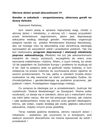 Obrona dzieci przed zboczeńcami !!! Gender w szkołach - zorganizowany, zbiorowy gwałt na duszy dziecka Szanowni Państwo, tym razem piszę w sprawie najwyższej wagi, chodzi o obronę dzieci i młodzieży, o obronę ich i naszej przyszłości przed śmiertelnym zagrożeniem, jakim jest deprawacja seksualna według ideologii gender. Homolobby organizuje potężne naciski na polskie Ministerstwo Edukacji Narodowej, aby od nowego roku tę absurdalną oraz zbrodniczą ideologię wprowadzić do wszystkich szkół i przedszkoli polskich. Tak ma być realizowany program deprawacji i ateizacji młodzieży poprzez seksualizację. Młodzież ma żyć jak seksnarkomanii niezdolni do rzeczy wyższych, szczególnie do wiary oraz tworzenia małżeństwa i rodziny. Wiem, o czym mówię, bo około 10 lat spędziłem na Zachodzie Europy i problemy te studiuję od 8 lat. Jest to potężny atak na godność osoby ludzkiej, w tym zwłaszcza na prawa rodziców do wychowania dzieci zgodnie ze swoimi przekonaniami. To tak, jakby w szkołach Izraela dzieci żydowskie na siłę nawracać na islam za pieniądze Żydów, bo chrześcijaństwo i genderideologia są podobnie przeciwne, jak judaizm i islam. Przestępstwo najgorszego rodzaju. Co oznacza ta ideologia już w przedszkolach, ilustruje list czytelniczki "Gościa Niedzielnego" ze Szwajcarii. Można sobie wyobrazić, co dzieje się w szkołach, skoro już z maluchami chce się robić takie rzeczy. Ale ten list pokazuje również, jak rodzice i całe społeczeństwo może się obronić prze gender-ideologami, którzy, jak widać, często działają jak osoby głęboko zaburzone seksualnie, między innymi przez pedofilię. Teraz nastała godzina działania, obrony naszych dzieci i młodzieży - podobnie, jak uczyniono to w Szwajcarii, pod żadnym pozorem zboczeńców nie można wpuszczać do szkół i przedszkoli ! Dlatego koniecznym jest, żeby każda osoba, która otrzymuje tego maila, przekazała go maksymalnie dużej liczbie innych osób. Następnie niech nasz udział w obronie dzieci polega przynajmniej na mówieniu o tym, ostrzeganiu oraz na wysłaniu maila i listu do Ministerstwa Edukacji Narodowej na przykład według załączonego wzoru. Ważne, aby list był wysłany także w formie pisemnej, to robi większe wrażenie, należy też żądać odpowiedzi i gwarancji, że u nas nie dojdzie co czegoś takiego, jak w Szwajcarii. Rodzice powinni też stale kontrolować, co w tym zakresie dzieje się w placówkach oświatowych oraz twardo domagać się respektowania swojej godności i swoich praw. W razie potrzeby należy korzystać z pomocy prawnej i przestępstwa nagłaśniać w mediach. To nasz podstawowy obowiązek, obrona dziecka jest najbardziej elementarnym obowiązkiem dorosłego. Gorąca zachęcam też do zapoznania się książką pani Gabriele Kuby, Globalna rewolucja seksualna. Likwidacja wolności w imię wolności, która właśnie ukazała się po polsku w wydawnictwie Homo Dei. Dołączam recenzję tego fundamentalnego dzieła, a już teraz można powiedzieć, że jest ono niezbędną, klasyczną lekturą. Pani Kuby znakomicie obnaża niesłychane zakłamanie i niegodziwości gender- i homoideologii, podobnie jak książki profesora Leszka Kołakowskiego i Aleksandra Sołnieżycyna obnażały marksizm i komunizm. Jest prawdziwą kopalną prawdy i argumentów, tak potrzebnych w naszej obronie przed wielkim kłamstwem ideologii. Potwierdzam ją na podstawie całej mojej wiedzy i doświadczenia. Informacje o niej można znaleźć tutaj: http://homodei.com.pl/product_info.php?products_id=295 Teraz jest czas niezbędnego działania, dobro i bezpieczeństwo dzieci jest wartością najwyższą! Z pozdrowieniami Ks. Dariusz Oko List ze Szwajcarii: Wersal się skończył http://gosc.pl/doc/1532074.Wersal-sie-skonczyl DODANE 2013-04-24 08:29 Seksedukacja po szwajcarsku. Sex-box dla przedszkoli zawiera dwa pluszaki: penisa w stanie wzwodu i rozchyloną waginę. W Polsce też się to już zaczyna. Rodzice bez ogródek muszą solidarnie powiedzieć ministerstwu krótkie i stanowcze NON POSSUMUS. Przeczytałam na Gosc.pl Państwa komentarze do konferencji MEN na temat seksualizacji dzieci w szkołach i śpieszę z dodatkowymi materiałami na ten temat. W Bazylei (Szwajcaria), w której mieszkam, podobna burza miała miejsce 2 lata temu. Władze kantonalne zaproponowały obowiązkową edukację seksualną już dla czterolatków. Spokojni z natury Szwajcarzy, po zapoznaniu się z programem, a szczególnie z materiałami edukacyjnymi, zwarli szeregi. W ciągu zaledwie kilku dni zawiązały się rożne inicjatywy, aby pomysł zdusić w zarodku. Rzecz nazwano po imieniu – za całą akcją musi stać lobby pedofilskie, bo przecież żaden normalny rodzic nie wymyśliłby dla swojego czterolatka zabawek rodem z sex-shopu. Załączam linki do zdjęcia z tak zwanym sex-boxem, przeznaczonym dla przedszkoli. Opublikował go w pełnej krasie lokalny tabloid Blick – zawiera między innymi dwa pluszaki: penisa w stanie wzwodu i rozchyloną waginę. Zabawki w sam raz do zabawy w kąciku przedszkolnym! http://www.blick.ch/news/schweiz/verdirbt-dieser-sex-koffer-unserekinder-id76220.html Wydaje się, że w następnej wersji władze kantonalne okroiły kuferek z pluszaków. Na stronie komitetu rodziców nie ma ich już na zdjęciach. http://www.elternkomitee.ch/ List do Ministerstwa Edukacji Narodowej Wydrukuj i wyślij pismo do p.S zumilas. Krystyna Szumilas Minister Edukacji Narodowej Aleja Szucha 25 00-950 Warszawa dotyczy: Przeglądu treści szkolnych podręczników do biologii, WOS i WDŻR pod kątem przedstawienia w nich problematyki LGBTQ (Lesbijki, Geje, Osoby Biseksualne, Osoby Transpłciowe oraz Osoby Queer) i treści homofobicznych pt. „Szkoła milczenia”. Szanowna Pani Minister Autorzy „Przeglądu…” żądając wycofania podręcznika do wychowania do życia w rodzinie „Wędrując ku dorosłości” i wprowadzenia obowiązkowej edukacji seksualn