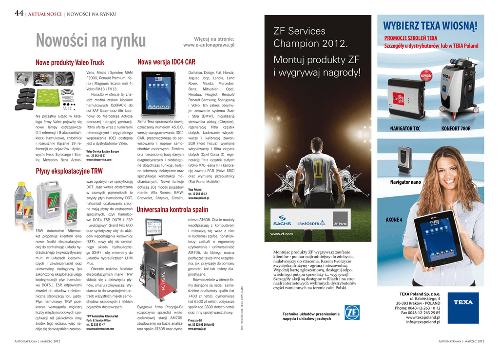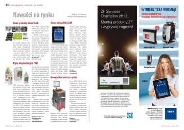 44 | AKTUALNOŚCI | NOWOŚCI NA RYNKU Nowości na rynku Na początku lutego w katalogu firmy Valeo pojawiły się nowe lampy ostrzegawcze (11 referencji i 8 akcesoriów), klocki hamulcowe, chłodnice i rozruszniki (łącznie 19 referencji) do pojazdów użytkowych: Iveco Eurocargo i Stralis; Mercedes Benz Actros, Vario, Medio i Sprinter; MAN F2000; Renault Premium, Kerax i Magnum; Scania serii 4; Volvo FM13 i FH13. Ponadto w ofercie tej znaleźć można zestaw klocków hamulcowych OptiPACK do osi SAF-Sauer oraz filtr kabinowy do Mercedesa Actrosa pierwszej i drugiej generacji. Pełna oferta wraz z numerami referencyjnymi i oryginalnego wyposażenia (OE) dostępna jest u dystrybutorów Valeo. Valeo Service Eastern Europe tel. 22 543 43 37 www.valeoservice.com Płyny eksploatacyjne TRW TRW Automotive Aftermarket proponuje klientom dwa nowe środki eksploatacyjne: olej do centralnego układu hydraulicznego (wykorzystywany m.in. w układach kierowniczych i zawieszeniach) oraz uniwersalny, ekologiczny (po zakończonej eksploatacji ulega biodegradacji) płyn hamulcowy DOT5.1 ESP, odpowiedni również do układów z elektroniczną stabilizacją toru jazdy. Płyn hamulcowy TRW przekracza wymagania większej liczby międzynarodowych specyfikacji niż jakikolwiek inny środek tego rodzaju, więc nadaje się do wszystkich zastosoAutonaprawa | marzec 2012 wań zgodnych ze specyfikacją DOT. Jego wersja dostarczana w czarnych pojemnikach to zwykły płyn hamulcowy DOT, natomiast opakowania srebrne mają płyny do zastosowań specjalnych, czyli hamulcowe DOT4 ESP, DOT5.1 ESP i „wyścigowy” Grand Prix 600 oraz syntetyczny olej do układów wspomagania kierownicy (SFF), nowy olej do centralnego układu hydraulicznego (CHF) i olej mineralny do układów hydraulicznych LHM Plus. Obecnie rodzina środków eksploatacyjnych marki TRW składa się z dziewięciu płynów, smaru i zmywacza. Wystarcza to do zaspokojenia potrzeb wszystkich marek samochodów osobowych i lekkich pojazdów dostawczych. TRW Automotive Aftermarket Parts & Service Office tel. 22 533 47 47 www.trwaftermarket.com Więcej na stronie: www.e-autonaprawa.pl Firma Texa opracowała nową, oznaczoną numerem 45.0.0, wersję oprogramowania IDC4 CAR, przeznaczonego do serwisowania i napraw samochodów osobowych. Zawiera ona rozszerzoną bazę danych diagnostycznych i niedostępne dotychczas funkcje, kolejne schematy elektryczne oraz specyfikacje konstrukcji mechanicznych. Nowe funkcje dotyczą 101 modeli pojazdów marek: Alfa Romeo, BMW, Chevrolet, Chrysler, Citroën, WYBIERZ TEXA WIOSNĄ! PROMOCJE SZKOLEŃ TEXA Szczegóły u dystrybutorów lub w TEXA Poland Montuj produkty ZF i wygrywaj nagrody! Nowa wersja IDC4 CAR Daihatsu, Dodge, Fiat, Honda, Jaguar, Jeep, Lancia, Land Rover, Mazda, MercedesBenz, Mitsubishi, Opel, Perodua, Peugeot, Renault/ Renault Samsung, Ssangyong i Volvo. Ich zakres obejmuje: zerowanie systemu Start i Stop (BMW), inicjalizację sterownika airbag (Chrysler), regenerację filtra cząstek stałych, kodowanie wtryskiwaczy i kalibrację zaworu EGR (Ford Focus), wymianę wtryskiwaczy i filtra cząstek stałych (Opel Corsa D), regenerację filtra cząstek stałych (Volvo V70 -seria II) i kalibrację zaworu EGR (Volvo S80) oraz wymianę przepustnicy (Fiat Punto MultiAir). NOWOŚĆ KONFORT 780R NAVIGATOR TXC Navigator nano Texa Poland tel. 12 263 10 12 www.texapoland.pl Uniwersalna kontrola spalin Bydgoska firma Precyzja-Bit rozpoczyna sprzedaż wielo zadaniowej stacji AM705, zbudowanej na bazie analizatora spalin AT505 oraz dymo- mierza AT605. Oba te moduły współpracują z komputerem i mieszczą się wraz z nim w ruchomej szafce. Konstruktorzy zadbali o ergonomię użytkowania i uniwersalność AM705, do którego można podłączać także inne urządzenia, jak przyrządy do pomiaru geometrii kół lub testery diagnostyczne. Równocześnie w ofercie firmy dostępne są nadal: samodzielne analizatory spalin (od 7400 zł netto), dymomierze (od 6500 zł netto), odsysacze spalin (od 2800 złotych netto) oraz inny sprzęt warsztatowy. Precyzja-Bit tel. 52 325 93 50 lub 60 www.precyzja.pl AXONE 4 www.zf.com Fot. Precyzja-Bit, TEXA, TRW, Valeo Nowe produkty Valeo Truck ZF Services Champion 2012. Montując produkty ZF wygrywasz zaufanie klientów - puchar najtrudniejszy do zdobycia, najłatwiejszy do stracenia. Razem tworzycie zwycięską drużynę - zgraną i niezawodną. Wypełnij kartę zgłoszeniową, dosięgnij odpowiedniego pułapu sprzedaży i… wygrywaj! Szczegóły akcji są dostępne w filiach i na stronach internetowych wybranych dystrybutorów części zamiennych na terenie całej Polski. Technika układów przeniesienia napędu i układów jezdnych TEXA Poland Sp. z o.o. ul. Babińskiego, 4 30-393 Kraków - POLAND Phone: 0048-12-263 10 12 Fax 0048-12-263 29 85 www.texapoland.pl [email protected] Autonaprawa | marzec 2012