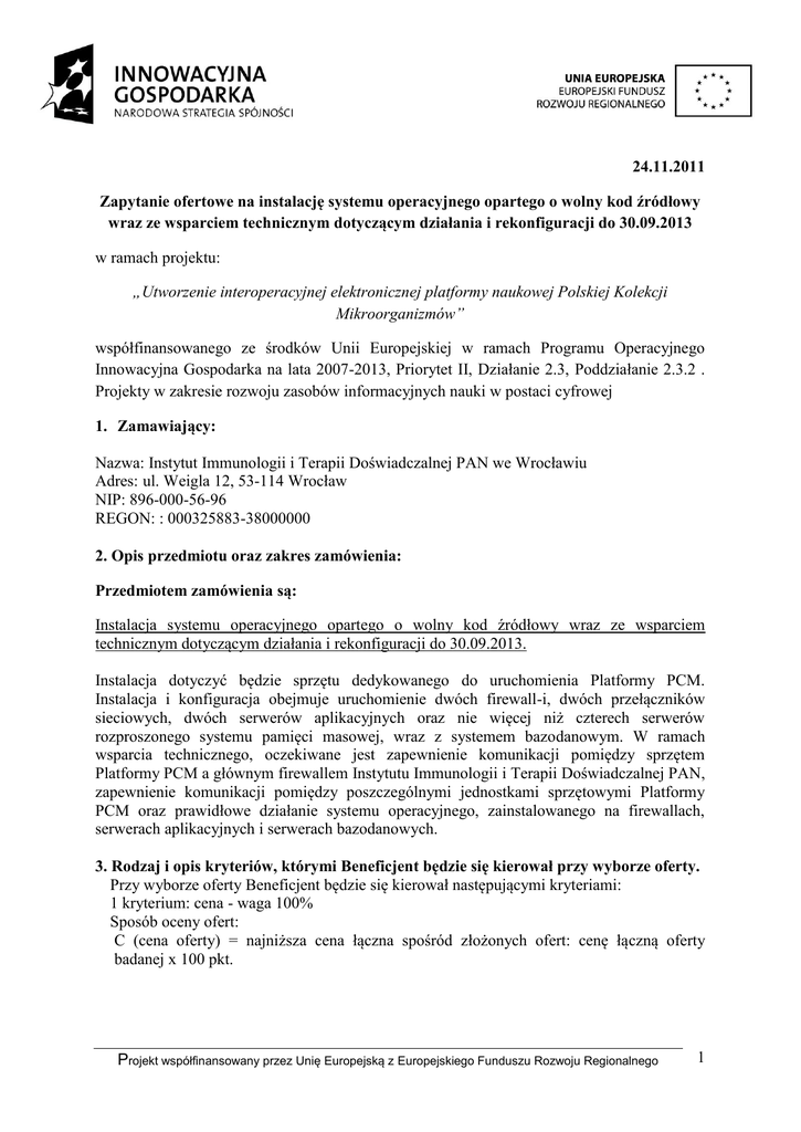24.11.2011 Zapytanie ofertowe na instalację systemu operacyjnego opartego o wolny kod źródłowy wraz ze wsparciem technicznym dotyczącym działania i rekonfiguracji do 30.09.2013 w ramach projektu: „Utworzenie interoperacyjnej elektronicznej platformy naukowej Polskiej Kolekcji Mikroorganizmów” współfinansowanego ze środków Unii Europejskiej w ramach Programu Operacyjnego Innowacyjna Gospodarka na lata 2007-2013, Priorytet II, Działanie 2.3, Poddziałanie 2.3.2 . Projekty w zakresie rozwoju zasobów informacyjnych nauki w postaci cyfrowej 1. Zamawiający: Nazwa: Instytut Immunologii i Terapii Doświadczalnej PAN we Wrocławiu Adres: ul. Weigla 12, 53-114 Wrocław NIP: 896-000-56-96 REGON: : 000325883-38000000 2. Opis przedmiotu oraz zakres zamówienia: Przedmiotem zamówienia są: Instalacja systemu operacyjnego opartego o wolny kod źródłowy wraz ze wsparciem technicznym dotyczącym działania i rekonfiguracji do 30.09.2013. Instalacja dotyczyć będzie sprzętu dedykowanego do uruchomienia Platformy PCM. Instalacja i konfiguracja obejmuje uruchomienie dwóch firewall-i, dwóch przełączników sieciowych, dwóch serwerów aplikacyjnych oraz nie więcej niż czterech serwerów rozproszonego systemu pamięci masowej, wraz z systemem bazodanowym. W ramach wsparcia technicznego, oczekiwane jest zapewnienie komunikacji pomiędzy sprzętem Platformy PCM a głównym firewallem Instytutu Immunologii i Terapii Doświadczalnej PAN, zapewnienie komunikacji pomiędzy poszczególnymi jednostkami sprzętowymi Platformy PCM oraz prawidłowe działanie systemu operacyjnego, zainstalowanego na firewallach, serwerach aplikacyjnych i serwerach bazodanowych. 3. Rodzaj i opis kryteriów, którymi Beneficjent będzie się kierował przy wyborze oferty. Przy wyborze oferty Beneficjent będzie się kierował następującymi kryteriami: 1 kryterium: cena - waga 100% Sposób oceny ofert: C (cena oferty) = najniższa cena łączna spośród złożonych ofert: cenę łączną oferty badanej x 100 pkt. Projekt współfinansowany przez Unię Europejską z Europejskiego Funduszu Rozwoju Regionalnego 1 4. Termin i miejsce realizacji zamówienia: - Miejsce realizacji zamówienia: Instytut Immunologii i Terapii Doświadczalnej PAN we Wrocławiu - Termin realizacji zamówienia: 14.12.2011 5. Miejsce, sposób i termin składania ofert. Oferty można złożyć w zamkniętej kopercie w siedzibie Zamawiającego. Oferta może być przekazana pocztą elektroniczną na adres: [email protected] w terminie do dnia: 29.11.2011 do godziny 12:00. 6. Opis warunków udziału w postępowaniu: 1) O zamówienie może ubiegać się wykonawca, który posiada uprawnienia do wykonywania określonej działalności lub czynności, jeżeli ustawy nakładają obowiązek posiadania takich uprawnień. 2) Ocena spełniania warunków udziału w postępowaniu dokonana będzie w następujący sposób: spełnia, nie spełnia. 3) Oferta powinna zawierać: - nazwę i adres oferenta - opis nawiązujący do przedmiotu zamówienia - wartość oferty 7. Rozstrzygniecie postępowania i zlecenie realizacji zamówienia 1) Postępowanie ofertowe zostanie rozstrzygnięte najpóźniej w dniu 02.12.2011 2) O wynikach postępowania jego uczestnicy zostaną poinformowani drogą telefoniczną lub mailową. 8. Sposób udzielania informacji i wyjaśnień Szczegółowych informacji na temat przedmiotu zamówienia udziela dr Agnieszka Korzeniowska-Kowal, e-mail: [email protected] Projekt współfinansowany przez Unię Europejską z Europejskiego Funduszu Rozwoju Regionalnego 2