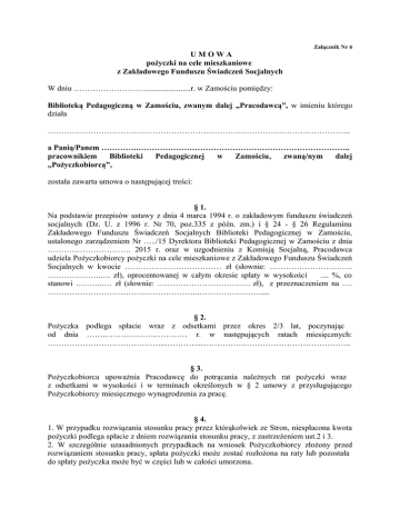 Załącznik Nr 6 UMOWA pożyczki na cele mieszkaniowe z Zakładowego Funduszu Świadczeń Socjalnych W dniu ………………………......................r. w Zamościu pomiędzy: Biblioteką Pedagogiczną w Zamościu, zwanym dalej „Pracodawcą”, w imieniu którego działa ………………………………………………………………………………………………….. a Panią/Panem ………….…………………………………………………………………….. pracownikiem Biblioteki Pedagogicznej w Zamościu, zwaną/nym dalej „Pożyczkobiorcą”, została zawarta umowa o następującej treści: § 1. Na podstawie przepisów ustawy z dnia 4 marca 1994 r. o zakładowym funduszu świadczeń socjalnych (Dz. U. z 1996 r. Nr 70, poz.335 z późn. zm.) i § 24 - § 26 Regulaminu Zakładowego Funduszu Świadczeń Socjalnych Biblioteki Pedagogicznej w Zamościu, ustalonego zarządzeniem Nr …../15 Dyrektora Biblioteki Pedagogicznej w Zamościu z dnia …………………………. 2015 r. oraz w uzgodnieniu z Komisją Socjalną, Pracodawca udziela Pożyczkobiorcy pożyczki na cele mieszkaniowe z Zakładowego Funduszu Świadczeń Socjalnych w kwocie ……………………………… zł (słownie: …………………………. ………………..…. zł), oprocentowanej w całym okresie spłaty w wysokości .... %, co stanowi ………..… zł (słownie: ….…………………………. zł), z przeznaczeniem na …. ………………………………………………..…………………….... § 2. Pożyczka podlega spłacie wraz z odsetkami przez okres 2/3 lat, poczynając od dnia …….……………….………… r. w następujących ratach miesięcznych: ……………………………………..…………..……………………………………………….. § 3. Pożyczkobiorca upoważnia Pracodawcę do potrącania należnych rat pożyczki wraz z odsetkami w wysokości i w terminach określonych w § 2 umowy z przysługującego Pożyczkobiorcy miesięcznego wynagrodzenia za pracę. § 4. 1. W przypadku rozwiązania stosunku pracy przez którąkolwiek ze Stron, niespłacona kwota pożyczki podlega spłacie z dniem rozwiązania stosunku pracy, z zastrzeżeniem ust.2 i 3. 2. W szczególnie uzasadnionych przypadkach na wniosek Pożyczkobiorcy złożony przed rozwiązaniem stosunku pracy, spłata pożyczki może zostać rozłożona na raty lub pozostała do spłaty pożyczka może być w części lub w całości umorzona. 3. W razie przejścia Pożyczkobiorcy na emeryturę lub rentę spłata pożyczki będzie dokonywana przez Pożyczkobiorcę w ratach określonych w § 2 umowy na konto Pracodawcy. § 5. Zmiana umowy wymaga zachowania formy pisemnej pod rygorem nieważności. § 6. W sprawach nieuregulowanych niniejszą umową mają zastosowanie przepisy: 1) ustawy z dnia 4 marca 1994 r. o zakładowym funduszu świadczeń socjalnych (Dz. U. z 1996 r. Nr 70, poz. 335 z późn. zm.), 2) Regulaminu Zakładowego Funduszu Świadczeń Socjalnych Biblioteki Pedagogicznej w Zamościu, 3) Kodeksu cywilnego. § 7. Umowa niniejsza została sporządzona w dwóch jednobrzmiących egzemplarzach, po jednym dla każdej ze Stron. PRACODAWCA: POŻYCZKOBIORCA: ……………………………………. …………………………………. OŚWIADCZENIE PORĘCZYCIELI: 1. Pan/i ………………… zam. w ………….…….. przy ul. ……………… legitymujący/a się dowodem osobistym o numerze ……....… wydanym przez ……………………… dnia ……r. 2. Pan/i ………………… zam. w ………….…….. przy ul. ……………… legitymujący/a się dowodem osobistym o numerze ………… wydanym przez………………………. dnia ……r. oświadczają, że w razie nieuregulowania we właściwym terminie pożyczki zaciągniętej przez Pożyczkobiorcę na podstawie niniejszej umowy, wyrażają zgodę, jako solidarnie współodpowiedzialni, na pokrycie należnej kwoty wraz z odsetkami ze swoich wynagrodzeń: 1....................................................... (podpis poręczyciela) 2. ………………………………………… (podpis poręczyciela) Stwierdzam własnoręczność podpisów Poręczycieli: ……………….……………………………………….. (nazwisko i imię ,stanowisko służbowe i podpis osoby, w której obecności zostały złożone podpisy poręczycieli) Umowa pożyczki na cele mieszkaniowe z ZFŚS Strona 2 z 2