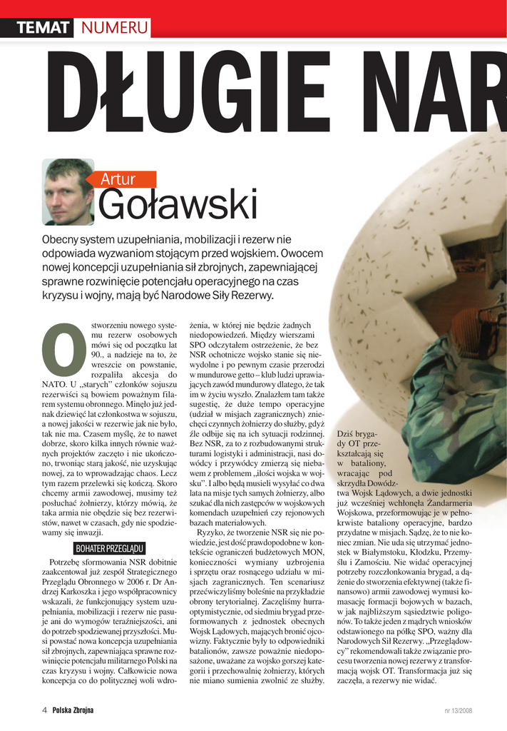 TEMAT NUMERU DŁUGIE NAR Artur Goławski Obecny system uzupełniania, mobilizacji i rezerw nie odpowiada wyzwaniom stojącym przed wojskiem. Owocem nowej koncepcji uzupełniania sił zbrojnych, zapewniającej sprawne rozwinięcie potencjału operacyjnego na czas kryzysu i wojny, mają być Narodowe Siły Rezerwy. stworzeniu nowego systemu rezerw osobowych mówi się od początku lat 90., a nadzieje na to, że wreszcie on powstanie, rozpaliła akcesja do NATO. U „starych” członków sojuszu rezerwiści są bowiem poważnym filarem systemu obronnego. Minęło już jednak dziewięć lat członkostwa w sojuszu, a nowej jakości w rezerwie jak nie było, tak nie ma. Czasem myślę, że to nawet dobrze, skoro kilka innych równie ważnych projektów zaczęto i nie ukończono, trwoniąc starą jakość, nie uzyskując nowej, za to wprowadzając chaos. Lecz tym razem przelewki się kończą. Skoro chcemy armii zawodowej, musimy też posłuchać żołnierzy, którzy mówią, że taka armia nie obędzie się bez rezerwistów, nawet w czasach, gdy nie spodziewamy się inwazji. BOHATER PRZEGLĄDU Potrzebę sformowania NSR dobitnie zaakcentował już zespół Strategicznego Przeglądu Obronnego w 2006 r. Dr Andrzej Karkoszka i jego współpracownicy wskazali, że funkcjonujący system uzupełniania, mobilizacji i rezerw nie pasuje ani do wymogów teraźniejszości, ani do potrzeb spodziewanej przyszłości. Musi powstać nowa koncepcja uzupełniania sił zbrojnych, zapewniająca sprawne rozwinięcie potencjału militarnego Polski na czas kryzysu i wojny. Całkowicie nowa koncepcja co do politycznej woli wdro4 Polska Zbrojna żenia, w której nie będzie żadnych niedopowiedzeń. Między wierszami SPO odczytałem ostrzeżenie, że bez NSR ochotnicze wojsko stanie się niewydolne i po pewnym czasie przerodzi w mundurowe getto – klub ludzi uprawiających zawód mundurowy dlatego, że tak im w życiu wyszło. Znalazłem tam także sugestię, że duże tempo operacyjne (udział w misjach zagranicznych) zniechęci czynnych żołnierzy do służby, gdyż źle odbije się na ich sytuacji rodzinnej. Bez NSR, za to z rozbudowanymi strukturami logistyki i administracji, nasi dowódcy i przywódcy zmierzą się niebawem z problemem „ilości wojska w wojsku”. I albo będą musieli wysyłać co dwa lata na misje tych samych żołnierzy, albo szukać dla nich zastępców w wojskowych komendach uzupełnień czy rejonowych bazach materiałowych. Ryzyko, że tworzenie NSR się nie powiedzie, jest dość prawdopodobne w kontekście ograniczeń budżetowych MON, konieczności wymiany uzbrojenia i sprzętu oraz rosnącego udziału w misjach zagranicznych. Ten scenariusz przećwiczyliśmy boleśnie na przykładzie obrony terytorialnej. Zaczęliśmy hurraoptymistycznie, od siedmiu brygad przeformowanych z jednostek obecnych Wojsk Lądowych, mających bronić ojcowizny. Faktycznie były to odpowiedniki batalionów, zawsze poważnie niedoposażone, uważane za wojsko gorszej kategorii i przechowalnię żołnierzy, których nie miano sumienia zwolnić ze służby. Dziś brygady OT przekształcają się w bataliony, wracając pod skrzydła Dowództwa Wojsk Lądowych, a dwie jednostki już wcześniej wchłonęła Żandarmeria Wojskowa, przeformowując je w pełnokrwiste bataliony operacyjne, bardzo przydatne w misjach. Sądzę, że to nie koniec zmian. Nie uda się utrzymać jednostek w Białymstoku, Kłodzku, Przemyślu i Zamościu. Nie widać operacyjnej potrzeby rozczłonkowania brygad, a dążenie do stworzenia efektywnej (także finansowo) armii zawodowej wymusi komasację formacji bojowych w bazach, w jak najbliższym sąsiedztwie poligonów. To także jeden z mądrych wniosków odstawionego na półkę SPO, ważny dla Narodowych Sił Rezerwy. „Przeglądowcy” rekomendowali także związanie procesu tworzenia nowej rezerwy z transformacją wojsk OT. Transformacja już się zaczęła, a rezerwy nie widać. nr 13/2008 PROFESJONALIZACJA GRAFIKA M. DMOWSKI RODZINY nia, gdzie mogłyby stacjonować zwarte jednostki rezerwowe? Może więc nie weekend, ale tydzień służby, za to raz na dwa miesiące, pod warunkiem, że przyjmiemy inny wariant NSR – uzupełnianie rezerwistami jednostek już istniejących, a nieskadrowanych lub rozwijanych na czas kryzysu i wojny. Jednak i tu należałoby zbadać, czy przysporzy to wojsku oczekiwanych korzyści operacyjnych. Trzeba by ustalić, jak najlepiej w takiej aktywnej jednostce zorganizować służbę rezerwistów. Na pewno nie wypali pomysł, by przyjeżdżali tam na weekend, skoro w piątek po południu kadra zawodowa gasi światło i udaje się w odwrotnym kierunku – do domów. Kto wówczas będzie trenował z rezerwistami, zapoznawał ich z nowymi sprzętem i zadaniami taktycznymi? Może więc rezerwiści powinni trafić do jednostek wsparcia i logistycznych? Mniej się w nich strzela, za to częściej można wykorzystać umiejętności cywilne. Warto to rozważyć, zwłaszcza że takich jednostek najbardziej nam będzie potrzeba. PROFITY Z KATEGORII Właśnie lokalizacja jednostek NSR będzie jedną z trudniejszych kwestii, z jaką muszą zmierzyć się twórcy koncepcji uzawodowienia naszego wojska. Sprawa jest skomplikowana: tworzenie nowoczesnych sił rezerwowych wymaga weryfikacji i docelowego określenia struktur sił zbrojnych na czas kryzysu i wojny, a także zbadania skuteczności proponowanych rozwiązań metodą symulacji komputerowych i badań społecznych. To pozwoli sprawdzić celowość, szanse powodzenia i koszty zmian w wojsku. Zapewne obali pewne mity czy nadzieje, które pojawiły się w kontekście pomysłu uzawodowienia armii. Ukształtował się mit, że rezerwiści będą wojskiem weekendowym. Co pewien czas stawią się w jednostce, do której ich nr 13/2008 Piszę tyle o rezerwistach, ale w rzeczy samej są to dziś ludzie wirtualni. Nie wiadomo, czy osoby mające przydziały mobilizacyjne w 2008 r. będą pasowały do koncepcji NSR. Aby to wi