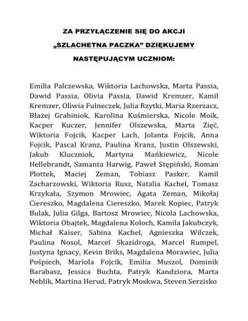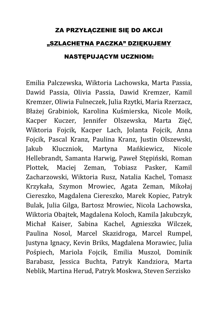 ZA PRZYŁĄCZENIE SIĘ DO AKCJI „SZLACHETNA PACZKA” DZIĘKUJEMY NASTĘPUJĄCYM UCZNIOM: Emilia Palczewska, Wiktoria Lachowska, Marta Passia, Dawid Passia, Olivia Passia, Dawid Kremzer, Kamil Kremzer,OliwiaFulneczek,JuliaRzytki,MariaRzerzacz, Błażej Grabiniok, Karolina Kuśmierska, Nicole Moik, Kacper Kuczer, Jennifer Olszewska, Marta Zięć, Wiktoria Fojcik, Kacper Lach, Jolanta Fojcik, Anna Fojcik, Pascal Kranz, Paulina Kranz, Justin Olszewski, Jakub Kluczniok, Martyna Mańkiewicz, Nicole Hellebrandt, Samanta Harwig, Paweł Stępiński, Roman Plottek, Maciej Zeman, Tobiasz Pasker, Kamil Zacharzowski, Wiktoria Rusz, Natalia Kachel, Tomasz Krzykała, Szymon Mrowiec, Agata Zeman, Mikołaj Ciereszko, Magdalena Ciereszko, Marek Kopiec, Patryk Bulak, Julia Gilga, Bartosz Mrowiec, Nicola Lachowska, WiktoriaObajtek,MagdalenaKoloch,KamilaJakubczyk, Michał Kaiser, Sabina Kachel, Agnieszka Wilczek, Paulina Nosol, Marcel Skazidroga, Marcel Rumpel, JustynaIgnacy,KevinBriks,MagdalenaMorawiec,Julia Pośpiech, Mariola Fojcik, Emilia Muszol, Dominik Barabasz, Jessica Buchta, Patryk Kandziora, Marta Neblik,MartinaHerud,PatrykMoskwa,StevenSerzisko
