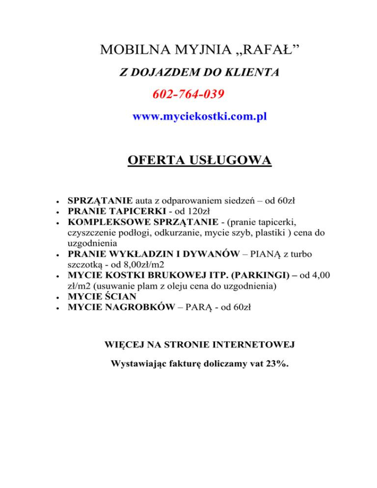 MOBILNA MYJNIA „RAFAŁ” Z DOJAZDEM DO KLIENTA 602-764-039 www.myciekostki.com.pl OFERTA USŁUGOWA SPRZĄTANIE auta z odparowaniem siedzeń – od 60zł PRANIE TAPICERKI - od 120zł KOMPLEKSOWE SPRZĄTANIE - (pranie tapicerki, czyszczenie podłogi, odkurzanie, mycie szyb, plastiki ) cena do uzgodnienia PRANIE WYKŁADZIN I DYWANÓW – PIANĄ z turbo szczotką - od 8,00zł/m2 MYCIE KOSTKI BRUKOWEJ ITP. (PARKINGI) – od 4,00 zł/m2 (usuwanie plam z oleju cena do uzgodnienia) MYCIE ŚCIAN MYCIE NAGROBKÓW – PARĄ - od 60zł WIĘCEJ NA STRONIE INTERNETOWEJ Wystawiając fakturę doliczamy vat 23%. Usuwanie graffiti, zabezpieczanie przed graffiti. Rodzaj usługi Rodzaj powierzchni Cena za 1m2 Wykonanie bezbarwnej powłoki ochronnej zabezpieczającej przed graffiti, przy użyciu środka: H-100 5 lat gwarancji klinkier, glazura, blacha, siding, PCV, itp. 25,00 zł granit, marmur, beton, cegła, itp. 26,00 zł tynki na ociepleniu, tynki cementowowapienne 35,00 zł piaskowiec, wapień, amerblok, drewno itp. 38,00 zł - WSZYSTKIE- 35,00 zł Pudła wagonów kolejowych autobusów, tramwajów, metalowe ekrany akustyczne, konstrukcje stal., budki telefoniczne, wiaty przystankowe, windy, znaki drogowe, szafy przekaźnikowe, rolety, pojemniki na śmieci, szkło, blacha, pleksi, poliwęglan, PCV, laminaty, siding, itp. 45,00 zł klinkier, cegła, granit, marmur, beton, lastriko 48,00 zł tynki na ociepleniu, tynki cementowowapienne 50,00 zł piaskowiec, wapień, amerblok, drewno itp. 55,00 zł Usuwanie graffiti z powierzchni zabezpieczonej środkami H-100 ponowne jej zabezpieczenie* Chemiczne usuwanie graffiti z powierzchni niezabezpieczonej, przy użyciu środków chemicznych DODATKOWE INFORMACJE: Zasady obliczania powierzchni graffiti: Obliczenie powierzchni graffiti polega na obrysie zabrudzenia w formę figury geometrycznej np. prostokąt, a następnie poprzez pomnożenie jej wysokości "a" przez szerokość "b" uzyskujemy wynik "C", który określa wymiar graffiti. 1. Graffiti wykonane w formie linii a x b = C 2. Graffiti wykonane w formie napisu a x b = C Podane ceny określone są w wartości netto, do których doliczamy podatek VAT 23% i ustalane są w zależności od stopnia zabrudzenia i oględzinach danego obiektu. Do ceny doliczany jest wynajem wysięgnika, jeżeli praca jest powyżej 4 metrów. W zależności od położenia obiektu, do usług może zostać doliczony koszt transportu w wysokości 1 zł / kilometr. ( na terenie miasta Tomaszowa Maz. dojazd GRATIS). Do usług usuwania graffiti (przy ilości do 4 m2) doliczamy jednorazowo 50,00 zł do wartości usługi, tytułem przygotowania stanowiska pracy. ** Przy usuwaniu graffiti z powierzchni zabezpieczonej środkami zmywana jest również warstwa ochronna, dlatego cena usunięcia graffiti zawiera jej ponowne nałożenie. Termin realizacji prac związanych z zabezpieczaniem przed graffiti, uzależniony jest od sprzyjających warunków atmosferycznych (temperatury otoczenia min. +8 oC i wilgotności powietrza poniżej 95%).