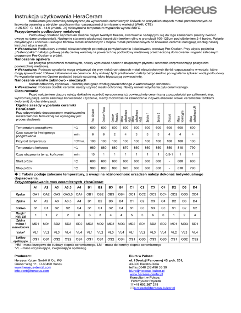 Instrukcja użytkowania HeraCeram HeraCeram jest ceramiką dentystyczną do wytwarzania ceramicznych licówek na wszystkich stopach metali przeznaczonych do licowania ceramiką w obrębie- współczynnika rozszerzalności termicznej o wartości (WAK; CTE) α 25-500˚ C 13,5 - 14,9 μm/mK. Jej maksymalna temperatura wypalania wynosi 880˚C. Przygotowanie podbudowy metalowej Podbudowy obrabiać naprzemian skośnie ciętym twardym frezem, ewentualnie nadającymi się do tego kamieniami (należy zwrócić uwagę na dane producenta!). Następnie starannie piaskować (oczyścić) tlenkiem glinu o granulacji 100-125μm pod ciśnieniem 2-4 barów. Palenie oksydacyjne i końcowe usunięcie tlenków metali szlachetnych i stopów metali przeznaczonych do licowania ceramiki następują według naszej instrukcji użycia metali. ►Wskazówka: Podbudowy z metali nieszlachetnych potrzebują po wykończeniu i piaskowaniu warstwę Pre-Opaker. Przy użyciu pędzelka „Pastenopaker” nałożyć gotową pastę cienką warstwą na powierzchnię podbudowy metalowej przeznaczoną do licowania i wypalić zalecanym programem Pre-Opaker w próżni. Nanoszenie opakera Do pokrycia powierzchni metalowych, należy wymieszać opaker z dołączonym płynem i starannie rozprowadzając pokryć nim powierzchnię metalową. ►Wskazówka: Podczas wypalania mogą wytworzyć się przy niektórych stopach metali nieszlachetnych tlenki rozpuszczalne w wodzie, które mogą spowodować żółtawe zabarwienia na ceramice. Aby uniknąć tych przebarwień należy bezpośrednio po wypalaniu spłukać wodą podbudowy. Po wypalaniu warstwa Opaker posiadać będzie szczelną, lekko błyszczącą powierzchnię. Nanoszenie warstw zębinowo - siecznych Kształt odbudowy zębinowo - siecznej następuje według powszechnego 2-warstwowego schematu. ►Wskazówka: Podczas obróbki ceramiki należy używać maski ochronnej. Należy unikać wdychania pyłu ceramicznego. Glazurowanie Przed nałożeniem glazury należy dokładnie oczyścić opracowaną już powierzchnię ceramiczną z pozostałości po szlifowaniu (np. wytwornicą pary). Jeżeli zaistnieje konieczność i życzenie, mamy możliwość na zakończenie indywidualizować licówki ceramiczne farbkami (kolorami) do charakteryzacji. Opaker Pasta Opaker Proszek Zębina 1 Zębina 2 Glazura Masa korekcyjna Masa schodkowa LM Temperatura początkowa C 600 600 600 600 600 600 600 600 600 600 min. 6 6 2 4 3 5 5 4 4 4 Czas suszenia i wstępnego podgrzewania Masa schodkowa HM1 Masa schodkowa HM2 Przy odpowiednio dopasowanym współczynniku rozszerzalności termicznej nie wymagany jest proces studzenia Pre- Opaker Ogólne zasady wypalania ceramiki HeraCeram Przyrost temperatury C/min. 100 100 100 100 100 100 100 100 100 100 Temperatura końcowa C 980 880 880 870 860 860 850 850 810 790 min. 10 1 1 1 1 1 1 0,5-1 1 1 Start próżni C 600 600 600 600 600 600 600 - 600 600 Stop próżni C 980 880 880 870 860 860 850 - 810 790 Czas utrzymania temp. końcowej Tabela podaje zalecane temperatury, z uwagi na różnorodność urządzeń należy dokonać indywidualnego dopasowania. Przyporządkowanie mas ceramicznych HeraCeram A1 A2 A3 A3,5 A4 B1 B2 B3 B4 C1 C2 C3 C4 D2 D3 D4 Opaker OA1 OA2 OA3 OA3,5 OA4 OB1 OB2 OB3 OB4 OC1 OC2 OC3 OC4 OD2 OD3 OD4 Zębina A1 A2 A3 A3,5 A4 B1 B2 B3 B4 C1 C2 C3 C4 D2 D3 D4 Szkliwo S1 S1 S2 S2 S4 S1 S1 S2 S4 S1 S3 S3 S3 S1 S2 S2 1 2 2 6 3 3 4 4 5 5 6 6 1 2 4 MD1 SD2 SD2 SD2 MD2 MD2 MD3 MD3 MD2 SD1 SD2 SD2 MD1 MD3 SD1 VL2 VL3 VL4 VL4 VL1 VL2 VL3 VL4 VL1 VL2 VL3 VL4 VL2 VL3 VL4 OS1 OS2 OS2 Margin¹ 1 HM / LM Zębina wtórna / MD1 mamelonowa Value² VL1 Szkliwo OS1 OS1 OS2 OS2 OS4 OS1 OS1 OS2 OS4 OS1 OS3 OS3 OS3 opalizujące ¹HM - masa brzegowa do budowy stopnia ceramicznego, LM – masa do korekty stopnia ceramicznego ²VL - masa rozjaśniająca, zwiększająca opalizację Producent: Biuro w Polsce: Heraeus Kulzer GmbH & Co. KG Grüner Weg 11, D-63450 Hanau www.heraeus-dental.com [email protected] ul. I Dywizji Pancernej 45, pok. 201, 43-300 Bielsko-Biała tel/fax:0048 (33)496 35 39 [email protected] www.heraeus-dental.pl Konsultant w Polsce: Przemysław Rajczak +48 602 267 218 [email protected]