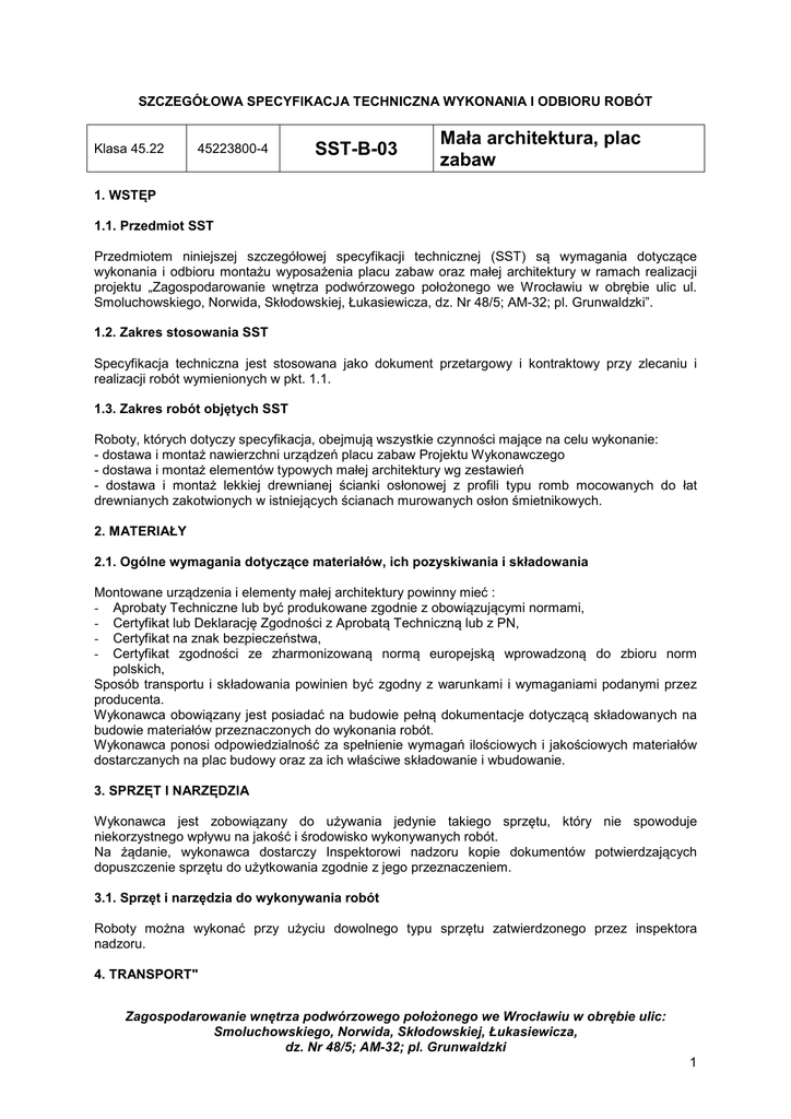 SZCZEGÓŁOWA SPECYFIKACJA TECHNICZNA WYKONANIA I ODBIORU ROBÓT Klasa 45.22 45223800-4 SST-B-03 Mała architektura, plac zabaw 1. WSTĘP 1.1. Przedmiot SST Przedmiotem niniejszej szczegółowej specyfikacji technicznej (SST) są wymagania dotyczące wykonania i odbioru montażu wyposażenia placu zabaw oraz małej architektury w ramach realizacji projektu „Zagospodarowanie wnętrza podwórzowego położonego we Wrocławiu w obrębie ulic ul. Smoluchowskiego, Norwida, Skłodowskiej, Łukasiewicza, dz. Nr 48/5; AM-32; pl. Grunwaldzki”. 1.2. Zakres stosowania SST Specyfikacja techniczna jest stosowana jako dokument przetargowy i kontraktowy przy zlecaniu i realizacji robót wymienionych w pkt. 1.1. 1.3. Zakres robót objętych SST Roboty, których dotyczy specyfikacja, obejmują wszystkie czynności mające na celu wykonanie: - dostawa i montaż nawierzchni urządzeń placu zabaw Projektu Wykonawczego - dostawa i montaż elementów typowych małej architektury wg zestawień - dostawa i montaż lekkiej drewnianej ścianki osłonowej z profili typu romb mocowanych do łat drewnianych zakotwionych w istniejących ścianach murowanych osłon śmietnikowych. 2. MATERIAŁY 2.1. Ogólne wymagania dotyczące materiałów, ich pozyskiwania i składowania Montowane urządzenia i elementy małej architektury powinny mieć : - Aprobaty Techniczne lub być produkowane zgodnie z obowiązującymi normami, - Certyfikat lub Deklarację Zgodności z Aprobatą Techniczną lub z PN, - Certyfikat na znak bezpieczeństwa, - Certyfikat zgodności ze zharmonizowaną normą europejską wprowadzoną do zbioru norm polskich, Sposób transportu i składowania powinien być zgodny z warunkami i wymaganiami podanymi przez producenta. Wykonawca obowiązany jest posiadać na budowie pełną dokumentacje dotyczącą składowanych na budowie materiałów przeznaczonych do wykonania robót. Wykonawca ponosi odpowiedzialność za spełnienie wymagań ilościowych i jakościowych materiałów dostarczanych na plac budowy oraz za ich właściwe składowanie i wbudowanie. 3. SPRZĘT I NARZĘDZIA Wykonawca jest zobowiązany do używania jedynie takiego sprzętu, który nie spowoduje niekorzystnego wpływu na jakość i środowisko wykonywanych robót. Na żądanie, wykonawca dostarczy Inspektorowi nadzoru kopie dokumentów potwierdzających dopuszczenie sprzętu do użytkowania zgodnie z jego przeznaczeniem. 3.1. Sprzęt i narzędzia do wykonywania robót Roboty można wykonać przy użyciu dowolnego typu sprzętu zatwierdzonego przez inspektora nadzoru. 4. TRANSPORT" Zagospodarowanie wnętrza podwórzowego położonego we Wrocławiu w obrębie ulic: Smoluchowskiego, Norwida, Skłodowskiej, Łukasiewicza, dz. Nr 48/5; AM-32; pl. Grunwaldzki 1 4.1. Transport i składowanie materiałów Do transportu materiałów stosować sprawne technicznie środki transportu. Środki transportu powinny zabezpieczać załadowane wyroby przed wpływami atmosferycznymi. Przestrzenie ładunkowe powinny być czyste, pozbawione wystających gwoździ i innych ostrych elementów mogących uszkodzić elementy przeznaczone do wbudowania. Wyroby ustawione w środkach transportu należy łączyć w bloki zapewniające stabilność i zwartość ładunku. Podczas transportu produkty powinny być umieszczone tak, aby nie przesuwały się i nie były uderzane przez inny ładunek. Wskazany jest transport specjalistycznymi pojazdami przystosowanym do przewozu poszczególnych wyrobów. Opakowania nie powinny być zrzucane lub gwałtownie opuszczane, nawet z niewielkich wysokości. Wykonawca jest zobowiązany do stosowania jedynie takich środków transportu, które nie wpłyną niekorzystnie na jakość robót i właściwości przewożonych towarów. Przy ruchu po drogach publicznych pojazdy muszą spełniać wymagania przepisów ruchu drogowego tak pod względem formalnym jak i rzeczowym. Wykonawca będzie usuwać na bieżąco, na własny koszt, wszelkie zanieczyszczenia spowodowane jego pojazdami na drogach publicznych oraz dojazdach do terenu budowy. 5. MONTAŻ 5.1. Zalecenia ogólne - Przed montażem dla urządzeń i wyrobów, które tego wymagają należy wykonać fundamenty, lub podłoża oraz instalacje wg wskazań producenta lub rysunków detali projektu wykonawczego. Montaż należy wykonywać zgodnie ze szczegółową instrukcją wbudowania tych wyrobów, dostarczoną przez każdego producenta. 5.2. Obiekty małej architektury wolnostojące Siedziska, kosze na śmieci, osłony należy ustawić na wcześniej przygotowanym podłożu wg instrukcji wybranego producenta lub rysunków detali projektu wykonawczego 6. KONTROLA JAKOŚCI Ogólne zasady kontroli jakości robót podano w Ogólnej Specyfikacji Technicznej. Podstawą dokonywania obmiarów, określającą zakres prac wykonywanych w ramach poszczególnych pozycji, jest załączony do dokumentacji przetargowej przedmiar robót. 7. OBMIAR ROBÓT Ogólne zasady dokonywania obmiarów robót podano w Ogólnej Specyfikacji Technicznej. Podstawą dokonywania obmiarów, określającą zakres prac wykonywanych w ramach poszczególnych pozycji, jest załączony do dokumentacji przetargowej przedmiar robót. 8. ODBIÓR ROBÓT Celem odbioru jest protokolarne dokonanie finalnej oceny rzeczywistego wykonania robót w odniesieniu do ich ilości, jakości i wartości. Gotowość do odbioru zgłasza Wykonawca wpisem do dziennika budowy. Odbiór jest potwierdzeniem wykonania robót zgodnie z postanowieniami Umowy oraz obowiązującymi Normami Technicznymi (PN, EN-PN). 9. PODSTAWA PŁATNOŚCI Zagospodarowanie wnętrza podwórzowego położonego we Wrocławiu w obrębie ulic: Smoluchowskiego, Norwida, Skłodowskiej, Łukasiewicza, dz. Nr 48/5; AM-32; pl. Grunwaldzki 2 Ogólne zasady płatności za roboty podano w Ogólnej Specyfikacji Technicznej. Podstawą dokonywania obmiarów, określającą zakres prac wykonywanych w ramach poszczególnych pozycji, jest załączony do dokumentacji przetargowej przedmiar robót. 10