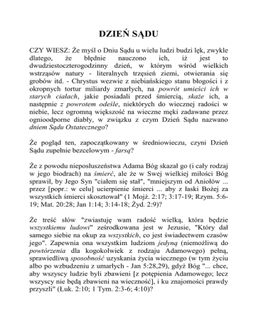DZIEŃ SĄDU CZY WIESZ: Że myśl o Dniu Sądu u wielu ludzi budzi lęk, zwykle dlatego, że błędnie nauczono ich, iż jest to dwudziestoczterogodzinny dzień, w którym wśród wielkich wstrząsów natury - literalnych trzęsień ziemi, otwierania się grobów itd. - Chrystus wezwie z niebiańskiego stanu błogości i z okropnych tortur miliardy zmarłych, na powrót umieści ich w starych ciałach, jakie posiadali przed śmiercią, skaże ich, a następnie z powrotem odeśle, niektórych do wiecznej radości w niebie, lecz ogromną większość na wieczne męki zadawane przez ognioodporne diabły, w związku z czym Dzień Sądu nazwano dniem Sądu Ostatecznego? Że pogląd ten, zapoczątkowany w średniowieczu, czyni Dzień Sądu zupełnie bezcelowym - farsą? Że z powodu nieposłuszeństwa Adama Bóg skazał go (i cały rodzaj w jego biodrach) na śmierć, ale że w Swej wielkiej miłości Bóg sprawił, by Jego Syn "ciałem się stał", "mniejszym od Aniołów ... przez [popr.: w celu] ucierpienie śmierci ... aby z łaski Bożej za wszystkich śmierci skosztował" (1 Mojż. 2:17; 3:17-19; Rzym. 5:619; Mat. 20:28; Jan 1:14; 3:14-18; Żyd. 2:9)? Że treść słów "zwiastuję wam radość wielką, która będzie wszystkiemu ludowi" ześrodkowana jest w Jezusie, "Który dał samego siebie na okup za wszystkich, co jest świadectwem czasów jego". Zapewnia ona wszystkim ludziom jedyną (niemożliwą do powtórzenia dla kogokolwiek z rodzaju Adamowego) pełną, sprawiedliwą sposobność uzyskania życia wiecznego (w tym życiu albo po wzbudzeniu z umarłych - Jan 5:28,29), gdyż Bóg "... chce, aby wszyscy ludzie byli zbawieni [z potępienia Adamowego; lecz wszyscy nie będą zbawieni na wieczność], i ku znajomości prawdy przyszli" (Łuk. 2:10; 1 Tym. 2:3-6; 4:10)? Że termin dzień często używany jest na oznaczenie okresu znacznie dłuższego niż 24 godziny, zarówno w użyciu powszechnym (np. dni Lutra), jak i biblijnym (1 Mojż. 2:4; Żyd. 3:8,9; Ps. 95:8-11; 2 Kor. 6:2)? Że wiek Ewangelii jest sądnym dniem dla Kościoła (2 Tes. 1:4,5; 1 Piotra 4:17), ale Bóg także "... postanowił dzień, w którym będzie sądził wszystek świat w sprawiedliwości ..." - "... dzień sądu i zatracenia [zniszczenia] niepobożnych ludzi. Ale ta jedna rzecz niech wam nie będzie tajną [w innych przekładach: nie zapominajcie] ... iż jeden dzień u Pana jest jako tysiąc lat ..." [Dz.Ap. 17:31; 2 Piotra 3:7,8; Ps. 90:4)? Że szatan, "bóg świata tego", od wieków zaślepia umysły większości ludzi (2 Kor. 4:4), że ciemność pokryła ziemię, a "zaćmienie narody", ale że w wielkim dniu sądu świata będzie on związany, "... aby nie zwodził więcej narodów, ażby się wypełniło tysiąc lat ..." (Izaj. 60:2; Obj. 20:2,3,7)? Że "dnia onego", tysiącletniego dnia panowania Chrystusa, kiedy sądzić będzie rodzaj ludzki, "... ziemia będzie napełniona znajomością Pańską, tak jako morze wodami napełnione jest"; wtedy powiedzą "Oto Bóg nasz ten jest; oczekiwaliśmy go, i wybawił nas ... weselić i radować się będziemy w zbawieniu jego" (Izaj. 11:9,10; 25:6-9; 40:5; 52:10; Jer. 31:34; Abak. 2:14)? Że słowo sądzić w użyciu biblijnym nie znaczy jedynie wydać wyrok, lecz obejmuje swym znaczeniem (1) pouczenie (Ps. 19:812; 25:8,9; 106:3; 119:108; Izaj. 33:5; 56:1; 59:4,8-15; Ezech. 22:2; Mat. 12:18-20; 23:23; Kol. 2:16), (2) próbowanie (Ps. 26:1-3 - porównaj Ps. 139:23,24; Jer. 11:20 - porównaj Jer. 20:12; 2 Tes. 1:4,5), (3) karanie w celu poprawy (Izaj. 26:9; 1 Kor. 11:31,32 porównaj Łuk. 12:47,48; Żyd. 12:5-11; Obj. 3:19) oraz (4) wydanie wyroku (Mat. 7:1,2; Jan 7:24; 5 Mojż. 1:16; Ps. 17:2)? Że Jezus "... ma sądzić [przez te cztery procesy] żywych i umarłych w [podczas] sławnem przyjściu swojem i w królestwie swojem"; że "... on musi królować [w Swym tysiącletnim panowaniu], pókiby nie położył wszystkich nieprzyjaciół pod nogi jego. A ostatni nieprzyjaciel, który będzie zniszczony jest śmierć" (2 Tym. 4:1; 1 Kor. 15:24-26; Ps. 72:1-4; Izaj. 11:1-6; 32:1; Jer. 23:5,6; Oz. 13:14; Obj. 20:11-15)? Że prawdziwy Kościół, "Oblubienica" i współdziedzic Chrystusa, będzie wraz z Nim panował nad ziemią w tysiącletnim dniu sądu i pomagał w rządzeniu światem, ofiarując mu "wodę żywota darmo" (1 Kor. 6:2; Abd. 21; Mat. 19:28; Łuk. 22:29,30; Rzym. 8:16-21; 2 Tym. 2:11,12; Obj. 3:21; 5:9,10; 20:4,6; 22:17)? Że według Boskiej obietnicy potwierdzonej przysięgą, nasienie Abrahama, to jest Chrystus i Kościół, błogosławić będzie "wszystkie narody ziemi", a będzie to podczas ich tysiącletniego panowania (1 Mojż. 12:3; 22:16-18; Gal. 3:7-9,16,29; Żyd. 6:1320; Dz.Ap. 3:19-25)? Że do tych, którzy mają być błogosławieni, włączeni są zarówno umarli, jak i żywi - że umarli zostaną obudzeni ze swego "snu" śmierci (Ps. 6:6; 146:4; Dan. 12:2; Jan 5:28,29; 11:11-14; 1 Tes. 4:14; 2 Piotra 3:4) i otrzymają wtedy dokładną znajomość prawdy oraz pełną sposobność uzyskania życia wiecznego? Że ostatecznie "... otrze Bóg wszelką łzę z oczów ich; a śmierci więcej nie będzie, ani smutku, ani krzyku, ani boleści nie będzie; albowiem pierwsze rzeczy [rzeczy związane z panowaniem szatana, łącznie z przekleństwem grzechu i śmierci] pominęły" ( Obj. 21:1-4; 22:1-3; Izaj. 35:10; 65:17-25)? Że "... gdy przyjdzie Syn człowieczy w chwale swojej... tedy usiądzie na stolicy chwały swojej. I będą zgromadzone przedeń wszystkie narody, i [pod wpływem prób tego wielkiego dnia sądu] odłączy je, jedne od drugich, jako pasterz odłącza owce od kozłów"; że posiadający dobre charaktery, zobrazowani przez owce, otrzymają życie wieczne i "odziedziczą królestwo" na ziemi (cisi je odziedziczą - Mat. 5:5), natomiast ci, którzy okażą się niegodnymi, zobrazowani przez kozły, "pójdą na męki [greckie kolasin znaczy odcięcie] wieczne", na drugą śmierć, by już nigdy nie żyć - "wszystkich niepobo