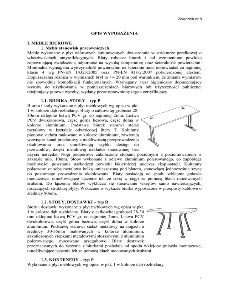 Załącznik nr 8 OPIS WYPOSAŻENIA I. MEBLE BIUROWE 1. Meble stanowisk pracowniczych Meble wykonane z płyt wiórowych laminowanych dwustronnie w strukturze perełkowej o właściwościach antyrefleksyjnych. Blaty robocze biurek i lad wzmocnione powłoką zapewniającą zwiększoną odporność na wysoką temperaturę oraz ścieralność powierzchni. Minimalna wymagana wytrzymałość powierzchni na ścieranie musi odpowiadać co najmniej klasie 4 wg PN-EN 14323:2005 oraz PN-EN 438-2:2007 potwierdzonej atestem. Dopuszczalna różnica w wymiarach brył to +/- 20 mm pod warunkiem, że zmiana wymiarów nie spowoduje komplikacji funkcjonalnych. Wymagany atest higieniczny dopuszczający wyroby do użytkowania w pomieszczeniach biurowych lub użyteczności publicznej obejmujący gotowe wyroby, wydany przez uprawniony organ certyfikujący. 1.1. BIURKA, STOŁY – typ P Biurka i stoły wykonane z płyt meblowych wg opisu w pkt. 1 w kolorze dąb rozbielany. Blaty o całkowitej grubości 2830mm oklejone listwą PCV gr. co najmniej 2mm. Listwa PCV dwukolorowa, część górna beżowa, część dolna w kolorze aluminium. Podstawę biurek stanowi stelaż metalowy w kształcie odwróconej litery T. Kolumny pionowe stelaża malowane w kolorze aluminium, zawierają wewnątrz kanał przelotowy z możliwością przeprowadzenia okablowania oraz umożliwiają szybki dostęp do przewodów, dzięki metalowej nakładce mocowanej bez użycia narzędzi. Nogi podporowe zakończone stopami poziomymi z poziomowaniem w zakresie min. 10mm. Stopy wykonane z odlewu aluminium polerowanego, co zapobiega możliwości powstania uszkodzeń powłoki lakierniczej podczas eksploatacji. Kolumny połączone ze sobą metalowa belką umieszczoną pod blatem, stanowiącą jednocześnie szynę do poziomego prowadzenia okablowania. Blaty posiadają od spodu wklejone gniazda montażowe, umożliwiające łączenie ich ze sobą w ciągi za pomocą blach mocowanych śrubami. Do łączenia blatów wyklucza się stosowanie wkrętów samo nawiercających, niszczących strukturę płyty. Wskazane w wykazie biurka wyposażone w przepusty kablowe o średnicy 80mm. 1.2. STOŁY, DOSTAWKI – typ R Stoły i dostawki wykonane z płyt meblowych wg opisu w pkt. 1 w kolorze dąb rozbielany. Blaty o całkowitej grubości 28-30 mm oklejone listwą PCV gr. co najmniej 2mm. Listwa PCV dwukolorowa, część górna beżowa, część dolna w kolorze aluminium. Podstawę stanowi stelaż metalowy na nogach o średnicy 30-35mm malowanych w kolorze aluminium, zakończonych stopkami metalowymi stożkowymi z aluminium polerowanego, mocowane przegubowo. Blaty dostawek przeznaczonych do łączenia z biurkami posiadają od spodu wklejone gniazda montażowe, umożliwiające łączenie ich za pomocą blach mocowanych śrubami. 1.3. KONTENERY – typ P Wykonane z płyt meblowych wg opisu w pkt. 1 w kolorze dąb rozbielany. 1 Załącznik nr 8 − korpus z płyty meblowej gr. min 18 mm, − blaty kontenerów stacjonarnych grubości 28-30 mm oklejone PCV dwukolorowym gr. co najmniej 2mm - część górna beżowa, część dolna w kolorze aluminium, − blaty, fronty i korpus wykończone PCV gr. minimum 2 mm w kolorze płyty, − szuflady z wkładami wykonanymi w całości z metalu, mocowane na prowadnicach kulkowych z cichym samodomykiem; blokada jednoczesnego wysuwu drugiej szuflady − zamknięcie na zamek centralny z numerem seryjnym, klucz łamany, − piórnik plastikowy w górnej szufladzie, − kontenery stacjonarne na nóżkach plastikowych, kontenery mobilne na 4 kółkach plastikowych w tym 2 z blokadą, − uchwyty metalowe, rozstaw min. 120 mm, wykończenie satyna. 1.4. SZAFY, REGAŁY – typ P Szafy wykonane z płyt meblowych wg opisu w pkt. 1 w kolorze dąb rozbielany. Wieńce górne szaf i regałów wykonane z płyty laminowanej gr. 28-30 mm. Korpusy szaf, półki oraz pozostałe elementy wykonane z płyty laminowanej gr. min. 18 mm. Plecy wykonane z płyty laminowanej gr. min. 18 mm. Wieńce górne szaf i regałów wykończone PCV dwukolorowym gr. min. 2mm, część górna beżowa, część dolna w kolorze aluminium. Drzwiczki oraz lica szuflad wykończone PCV w kolorze płyty meblowej gr. min. 2 mm, pozostałe elementy wykończone PCV gr. min. 0,5 mm. Wyposażone w plastikowe stopki wysokości 24-34mm z możliwością regulacji wysokości od wnętrza mebla. Uchwyty metalowe z satynowym wykończeniem powierzchni, rozstaw min. 120mm. Drzwiczki uchylne mocowane na zawiasy puszkowe z samodociągiem oraz wyposażone w hamulce zapewniające ciche domykanie skrzydeł drzwiowych. W układach dwudrzwiowych, jedno ze skrzydeł drzwiowych wyposażone w listwę przymykową plastikową z gumową uszczelką, utrudniającą wnikanie kurzu do wewnątrz. Drzwiczki zamykane na zamki patentowe z numerem seryjnym. System zamykania drzwi nie wymaga stosowania zasuwek drzwiowych. Korpus łączony na złącza mimośrodowe metalowe z niklowaną częścią zaciskową fi 14-16mm oraz metalowo-tworzywową częścią rozprężną. Półki na akta wsparte na systemie podpórek samozaciskowych. Podpórki złożone z tworzywowej części osadzanej w półce oraz metalowo-tworzywowego trzpienia trwale mocowanego w korpusie szafy. Sposób mocowania półek zapobiega ich przypadkowemu wysunięciu się, a także zwiększa sztywność korpusu. 1.5. LADY – typ L Lady wykonane z płyt meblowych wg opisu w pkt. 1 w kolorze dąb rozbielany. Lada z częścią dolną o wysokości 75cm i głębokości 90cm oraz nadstawką o wysokości 38cm i głębokości 30cm. Blaty górne i dolne o całkowitej grubości 28-30mm oklejone listwą PCV gr. min. 2mm. Listwa PCV dwukolorowa, część górna beżowa, część dolna w kolorze aluminium. W blacie roboczym umieszczone przeloty kablowe zgodnie z wykazem. Korpus wykonany płyty grubości 18mm, oklejonej listwą PCV o grubości min. 2mm. Ściany wsparte na stopkach z możliwością regulacji wysokości. Ściana frontowa nadstawki wykonana z blachy perforow