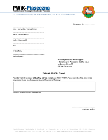 UL. ŻEROMSKIEGO 39, 05-500 PIASECZNO, TEL/FAX: 022 750 23 20 Piaseczno, dn. …………………. .............................................................. imię i nazwisko / nazwa firmy .............................................................. adres zamieszkania .............................................................. kod-miejscowośd .............................................................. NIP .............................................................. nr telefonu …………………………………………………………… kod nabywcy Przedsiębiorstwo Wodociągów i Kanalizacji w Piasecznie Spółka z o.o. ul. Żeromskiego 39 05-500 Piaseczno ZMIANA ADRESU E-MAIL Poniżej należy wpisać aktualny adres e-mail, na który PWiK Piaseczno będzie przesyłać powiadomienie o udostępnieniu elektronicznej faktury: Prosimy wypełnić literami drukowanymi …………………………………………… czytelny podpis Przedsiębiorstwo Wodociągów i Kanalizacji w Piasecznie Sp. z o. o. ul. Żeromskiego 39, 05-500 Piaseczno KRS: 0000324880 | NIP: 123-117-17-94 | tel.: (22) 750 23 20 | www.pwikpiaseczno.pl | [email protected]