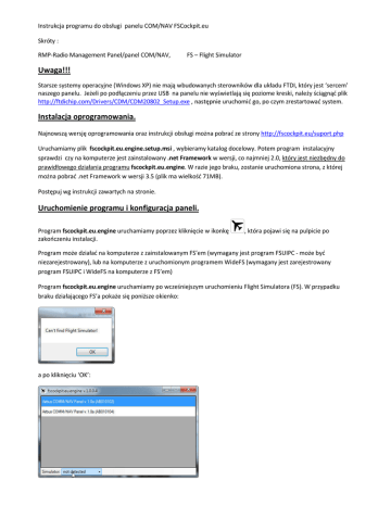 Instrukcja programu do obsługi panelu COM/NAV FSCockpit.eu Skróty : RMP-Radio Management Panel/panel COM/NAV, FS – Flight Simulator Uwaga!!! Starsze systemy operacyjne (Windows XP) nie mają wbudowanych sterowników dla układu FTDI, który jest ‘sercem’ naszego panelu. Jeżeli po podłączeniu przez USB na panelu nie wyświetlają się poziome kreski, należy ściągnąć plik http://ftdichip.com/Drivers/CDM/CDM20802_Setup.exe , następnie uruchomić go, po czym zrestartować system. Instalacja oprogramowania. Najnowszą wersję oprogramowania oraz instrukcji obsługi można pobrać ze strony http://fscockpit.eu/suport.php Uruchamiamy plik fscockpit.eu.engine.setup.msi , wybieramy katalog docelowy. Potem program instalacyjny sprawdzi czy na komputerze jest zainstalowany .net Framework w wersji, co najmniej 2.0, który jest niezbędny do prawidłowego działania programu fscockpit.eu.engine. W razie jego braku, zostanie uruchomiona strona, z której można pobrać .net Framework w wersji 3.5 (plik ma wielkość 71MB). Postępuj wg instrukcji zawartych na stronie. Uruchomienie programu i konfiguracja paneli. Program fscockpit.eu.engine uruchamiamy poprzez kliknięcie w ikonkę zakończeniu instalacji. , która pojawi się na pulpicie po Program może działać na komputerze z zainstalowanym FS’em (wymagany jest program FSUIPC - może być niezarejestrowany), lub na komputerze z uruchomionym programem WideFS (wymagany jest zarejestrowany program FSUIPC i WideFS na komputerze z FS’em) Program fscockpit.eu.engine uruchamiamy po wcześniejszym uruchomieniu Flight Simulatora (FS). W przypadku braku działającego FS’a pokaże się poniższe okienko: a po kliknięciu ‘OK’: Przy niedziałającym FS’ie RMP będą wyświetlać zamiast częstotliwości ACTIVE i STBY poziome kreski: W celu uzyskania połączenia z FS’em należy uruchomić program Flight Simulator i następnie kliknąć LPM (Lewym Przyciskiem Myszki) napis ‘not detected’ i wybrać odpowiednia wersje FS’a (FS2004 lub FSX). Prawidłowo uruchomiony program, połączony z FSX powinien wyglądać tak: W oknie głównym widzimy listę wykrytych RMP oraz ich numery seryjne. Po najechaniu kursorem na wybrany RMP pokaże się podpowiedź ‘Right click to configure panel’, po kliknięciu PPM (Prawym Przyciskiem Myszki) wybieramy opcje ‘Configure…’ i pojawia się okienko: Patrząc od góry, wybieramy czy jest to RMP kapitana (Left) czy drugiego pilota (Right), skutkuje to tym, jak RMP będzie się ustawiał po włączeniu, jeżeli będzie to RMP kapitana, to standardowo ustawi się na VHF1, jeżeli drugiego oficera, to VHF2. RMP kapitana zawsze ustawia VOR 1, a drugiego oficera VOR 2(*). Oczywiście częstotliwości VHF1 i 2 można dowolnie zamieniać miedzy panelami. Poniżej są suwaki wyboru natężenia jasności, po kolei: - podświetlenie RMP - podświetlenie wyświetlaczy częstotliwości ACTIVE/STBY - podświetlenie LED (zielone diody przy klawiszach) Każde z 3 ustawień, ma 2 warianty 'dzień' i 'noc'. Przełączanie między tymi wariantami odbywa się w FS'ie przy pomocy skrótu klawiszowego 'Shift'+'L', ten skrót odpowiada w FS'ie za włączanie świateł kokpitu. (*) Niektóre samoloty np. Wilco automatycznie dostrajają się do VOR’ow w okolicy. W celu wyłączenia automatycznego dostrajania należy ręcznie ‘wklepać’ dowolna częstotliwość w MCDU, na stronie ‘RAD NAV’, odpowiednio w lewym górnym rogu VOR1(NAV1) i w prawym górnym rogu VOR2(NAV2) Po zakończonym locie i wyłączeniu FS’a pojawi się okienko informujące o zakończeniu połączenia Po kliknięciu ‘OK.’ program fscockpit.eu.engine przechodzi w stan uśpienia, jego ikonka znajduje się w prawym dolnym rogu ekranu lub jest ukryta w zasobniku , w takim przypadku należy kliknąć LPM w przycisk ‘Pokaż ukryte ikony’ i kliknąć PPM w ikonkę , wybrać opcję ‘Reconnect’ - wtedy program będzie próbował odtworzyć ostatnie połączenie, albo ‘Show’ i po wyświetleniu się głównego okna aplikacji, ponownie wybrać wersje FS’a w lewym dolnym rogu.