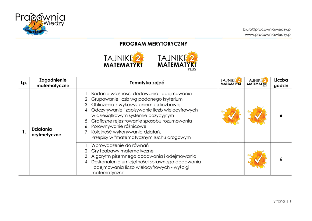[email protected] www.pracowniawiedzy.pl PROGRAM MERYTORYCZNY Lp. Zagadnienie matematyczne Tematyka zajęć 1. 2. 3. 4. 1. Działania arytmetyczne Badanie własności dodawania i odejmowania Grupowanie liczb wg podanego kryterium Obliczenia z wykorzystaniem osi liczbowej Odczytywanie i zapisywanie liczb wielocyfrowych w dziesiątkowym systemie pozycyjnym 5. Graficzne rejestrowanie sposobu rozumowania 6. Porównywanie różnicowe 7. Kolejność wykonywania działań. Przepisy w "matematycznym ruchu drogowym" Liczba godzin 1. 2. 3. 4. Wprowadzenie do równań Gry i zabawy matematyczne Algorytm pisemnego dodawania i odejmowania Doskonalenie umiejętności sprawnego dodawania i odejmowania liczb wielocyfrowych - wyścigi matematyczne 6 6 Strona | 1 2. 3. 4. 5. Mnożenie i dzielenie Cechy podzielności liczb NWD, NWW Matematyka w codziennym życiu Figury geometryczne 1. 2. 3. 4. 5. Tabliczka mnożenia – sposoby na zapamiętanie Własności mnożenia Porównywanie ilorazowe Dzielenie z resztą i sprawdzenie dzielenia Algorytm pisemnego mnożenia i dzielenia 10 1. Doskonalenie umiejętności sprawnego mnożenia i dzielenia - piramidy, gra w "wojnę", wyścigi matematyczne itp. 6 1. Cechy podzielności liczb przez 2, 3, 4, 5, 10, 25. Inne ciekawe cechy podzielności liczb 2. Wielokrotności i dzielniki liczb - zadania 8 1. 2. 3. 4. 5. 6. 7. Obliczenia pieniężne: cena- ilość- wartość Obliczenia zegarowe i kalendarzowe Termometr-mierzenie temperatury Mierzenie pojemności Ważenie- porównywanie masy Posługiwanie się symbolami miar, zamiana jednostek Znaki rzymskie 10 1. Obliczanie obwodów wielokątów 2. Obliczanie pola figur: kwadratu i prostokąta oraz innych czworokątów 3. Skala i plan 4. Obliczanie wymiarów rzeczywistych 5. Własności figur geometrycznych 12 1. Geometria kartki papieru – origami 2. Układanie sylwet ludzi i zwierząt z części tangramu 3. Tworzenie własnych wzorów wg poznanych zasad 8 Strona | 2 Ułamki 1. Zapisywanie ułamków 2. Porównywanie ułamków o jednakowych oraz różnych mianownikach 3. Dodawanie i odejmowanie ułamków 4. Mnożenie i dzielenie ułamków. Odwrotność liczby 5. Procent jako ułamek. Podstawowe obliczenie procentowe. 8 Liczby ujemne 1. 2. 3. 4. 8 Rozwiązywanie zadań tekstowych 1. Zapisywanie rozwiązań zadań różnymi sposobami – graf, drzewko, równania 2. Przekształcanie i schematyzowanie treści zadań 3. Zapis rozwiązania zadania w jednym zapisie 4. Konstruowanie, przekształcanie i układanie zadań matematycznych 5. Krzyżówki matematyczne. Konstruowanie własnych krzyżówek 8 9. Przygotowanie do konkursów 1. Rozwiązywanie zadań o podwyższonym stopniu trudności z wykorzystaniem testów z wcześniejszych edycji konkursów matematycznych: Alfik, Kangur, Ligi Przedmiotowej. 12 10. Matematyka w języku angielskim 1. Liczby, działania, podstawowe pojęcia matematyczne w języku angielskim 10 6. 7. 8. Przykłady zastosowania liczb ujemnych Położenie liczby ujemnej na osi liczbowej Wartość bezwzględna Działania na liczbach ujemnych Strona | 3 11. 12. Komputer w matematyce 1. Wykorzystanie programów komputerowych w matematyce 2. Nauka programowania 16 Poznanie innych niż dziesiątkowy systemów liczenia. 1. Odczytywanie, zapisywanie, dodawanie i odejmowanie liczb w układzie dwójkowym 2. Próby zapisywania liczb w innych niż dziesiątkowy systemach liczenia 3. Dostrzeganie kompatybilności działań w różnych układach liczbowych 6 RAZEM: 66 134 Strona | 4