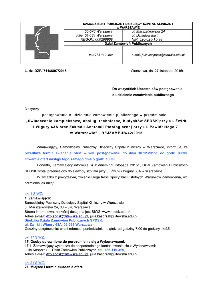 SAMODZIELNY PUBLICZNY DZIECIĘCY SZPITAL KLINICZNY w WARSZAWIE 00-576 Warszawa ul. Marszałkowska 24 Filia: 01-184 Warszawa ul. Działdowska 1 REGON: 000288969 NIP: 526-025-15-98 Dział Zamówień Publicznych tel.: 786-119-460 L. dz. DZP/ 711/8807/2015 e-mail: [email protected] Warszawa, dn. 27 listopada 2015r. Do wszystkich Uczestników postępowania o udzielenie zamówienia publicznego Do t yczy: p ost ęp o wa n ia o u d zie le n ie za m ó wie n ia p ub liczn e go w p rze d m io cie : „Ś w i adcze nie k ompl e ks ow ej obs ł ugi te c hnic zne j bud ynk ów S P DS K przy ul . Żw i rk i i Wi gur y 6 3 A ora z Zak ła du Ana tomi i Pa tol ogi c zne j przy ul . Paw ińsk ie go 7 w W ars za w i e” - RE J ZAMP UB/ 4 2 / 20 1 5 Zamawiający, Samodzielny Publiczny Dziecięcy Szpital Kliniczny w Warszawie, informuje, że przedłuża termin składania ofert w ww. postępowaniu do dnia 10.12.2015r. do godz. 09:00. Otwarcie ofert nastąpi tego samego dnia o godz. 10:00. Ponadto, Zamawiający informuje, iż z dniem 25 listopada 2015r., Dział Zamówień Publicznych SPDSK został przeniesiony do siedziby szpitala przy ul. Żwirki i Wigury 63A w Warszawie. W związku z powyższym, zmianie ulega treść Specyfikacji Istotnych Warunków Zamówienia, wg brzmienia jak niżej: pkt 1 SIWZ: 1. Zamawiający: Samodzielny Publiczny Dziecięcy Szpital Kliniczny w Warszawie ul. Marszałkowska 24, 00 – 576 Warszawa Strona internetowa, na której dostępna jest SIWZ: www.spdsk.edu.pl Adres e-mail: [email protected], [email protected] Siedziba Działu Zamówień Publicznych SPDSK: ul. Żwirki i Wigury 63A, 02-091 Warszawa Godziny urzędowania: w dni robocze, poniedziałek – piątek, od godziny 7:00 do godziny 14:35 pkt 17 SIWZ: 17. Osoby uprawnione do porozumienia się z Wykonawcami. 17.1. Zamawiający wyznacza do bezpośredniego kontaktowania się z Wykonawcami: Julia Kasprzak – Dział Zamówień Publicznych, tel: 786-119-460, Adres e-mail: [email protected], [email protected] pkt 21 SIWZ: 21. Miejsce i termin składania ofert. 1 21.1. Oferty należy składać w nieprzejrzystym, zamkniętym opakowaniu do 10 grudnia 2015 roku do godz. 09:00 w Dziale Zamówień Publicznych Samodzielnego Publicznego Dziecięcego Szpitala Klinicznego w Warszawie, ul. Żwirki i Wigury 63A, 02-091 Warszawa, Administracja, piętro 5, pokój nr 122.5.D. 21.2. Opakowanie zawierające ofertę powinno być zamknięte i zapieczętowane w sposób gwarantujący zachowanie poufności treści oferty oraz zabezpieczające jej nienaruszalność do terminu otwarcia ofert i zaadresowane: „Samodzielny Publiczny Dziecięcy Szpital Kliniczny w Warszawie ul. Żwirki i Wigury 63A, 02-091 Warszawa Dział Zamówień Publicznych, pok. nr 122.5.D. oraz oznakowane następująco: „Oferta do postępowania pn.: „KOMPLEKSOWA OBSŁUGA TECHNICZNA BUDYNKÓW SPDSK (…) – RejZamPub/42/2015 – nie otwierać przed ………….. roku, godz. ……….” (wypełnia Wykonawca).” i opatrzone pieczęcią firmową Wykonawcy (wraz z adresem i nr telefonu). pkt 22 SIWZ 22. Miejsce i termin otwarcia ofert. 22.1. Otwarcie złożonych ofert nastąpi w dniu 10 grudnia 2015 roku o godz. 10:00 w siedzibie Działu Zamówień Publicznych, Samodzielnego Publicznego Dziecięcego Szpitala Klinicznego w Warszawie przy ul. Żwirki i Wigury 63A, 02-091 Warszawa, Administracja, piętro 5, Sala Konferencyjna nr 123.5.D. 2